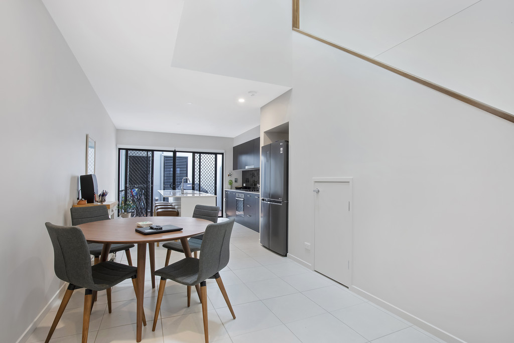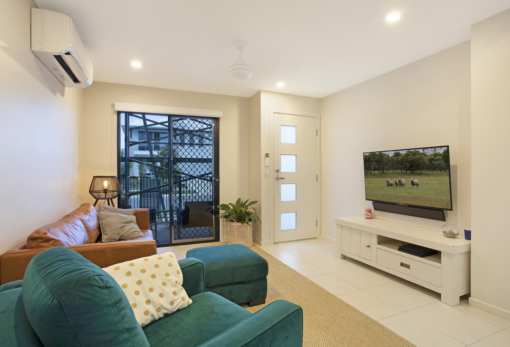 The main living area (Located downstairs) has a split system air-conditioner, access to the front terrace and high-set ceilings.