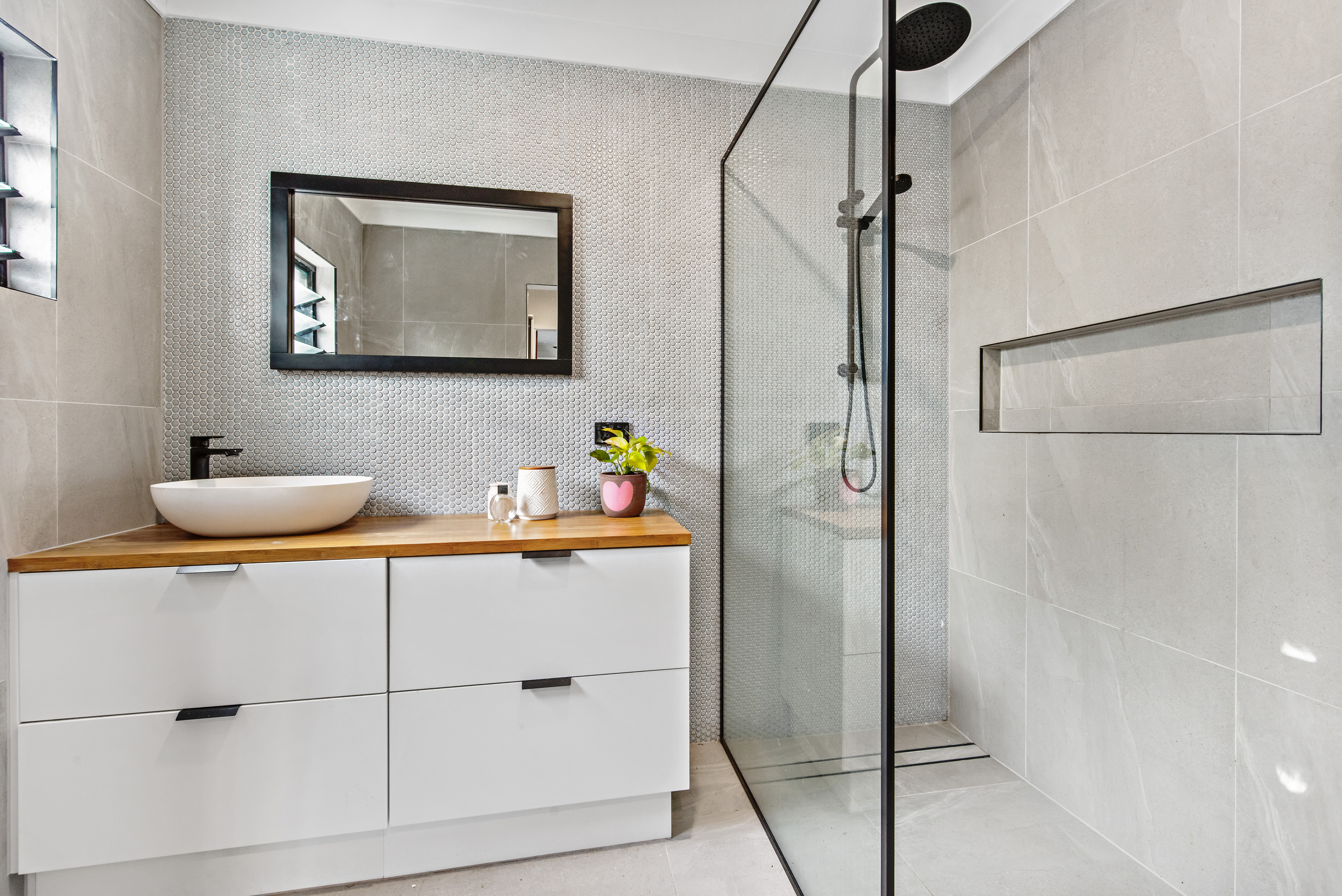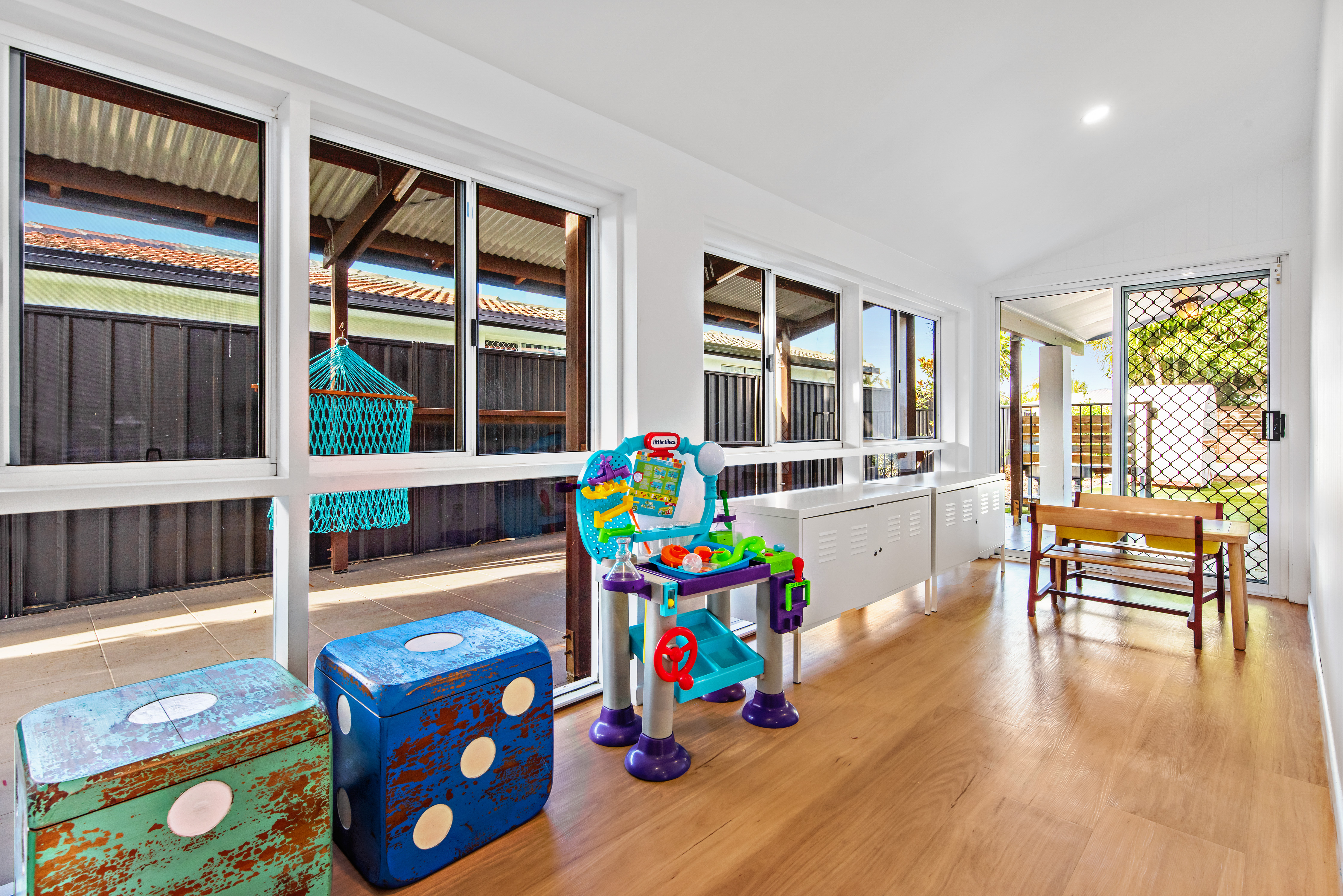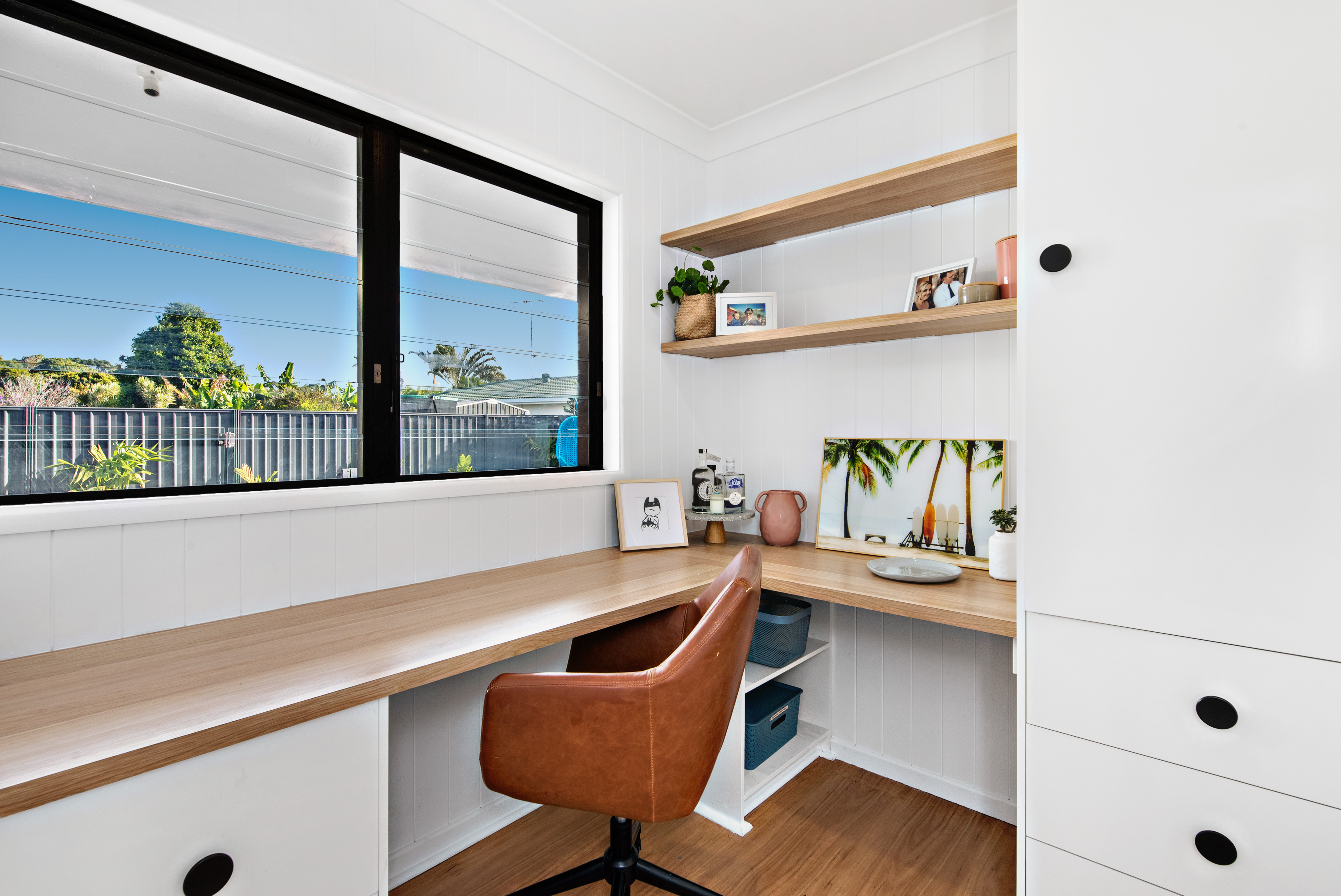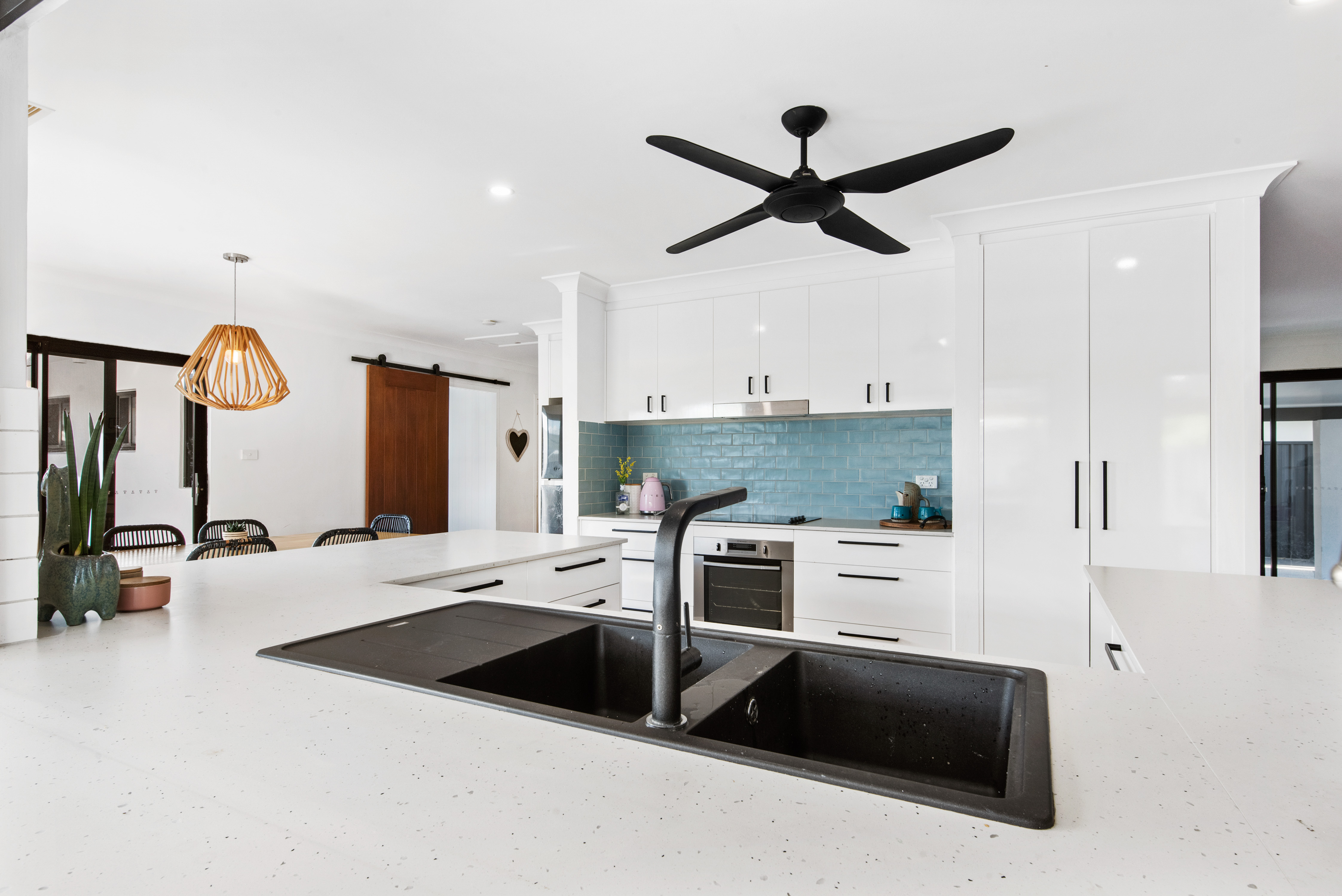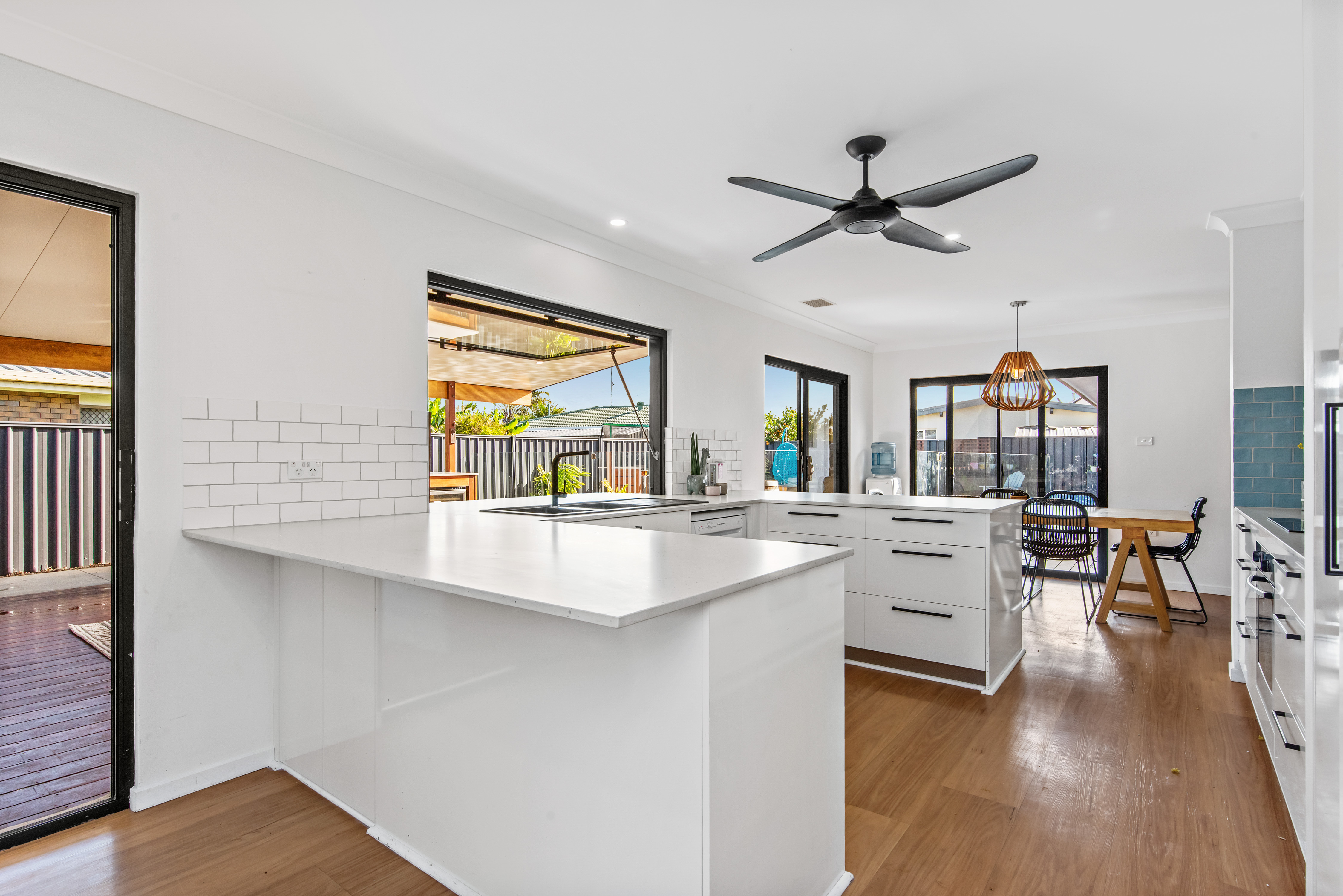 This home has all the bells and whistles with the well-appointed central kitchen featuring, Caesarstone bench, electric cooktop and ample cupboard and storage. Entertaining is made easy by the sliding window access from the kitchen to the great outdoors and bar style sitting area.