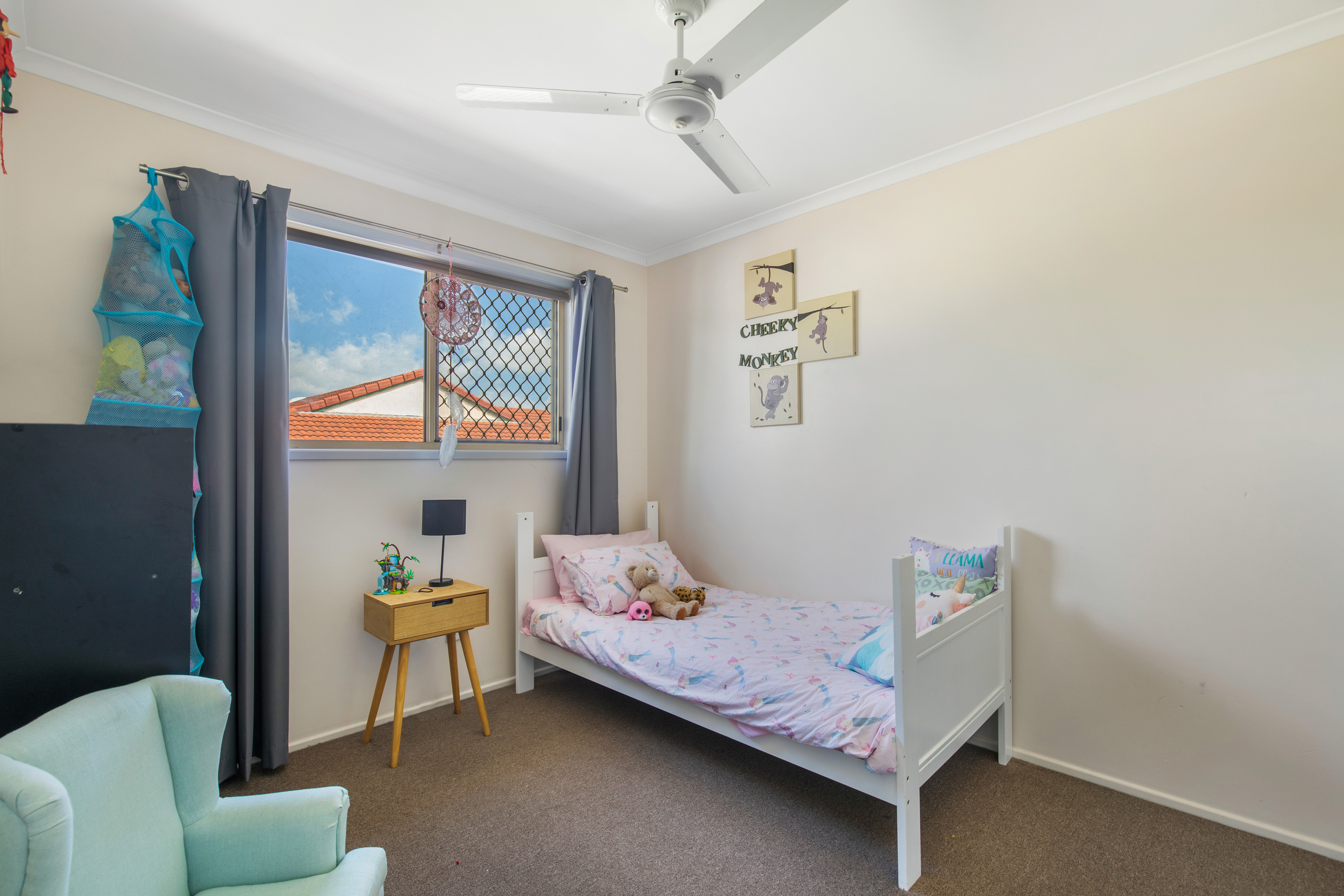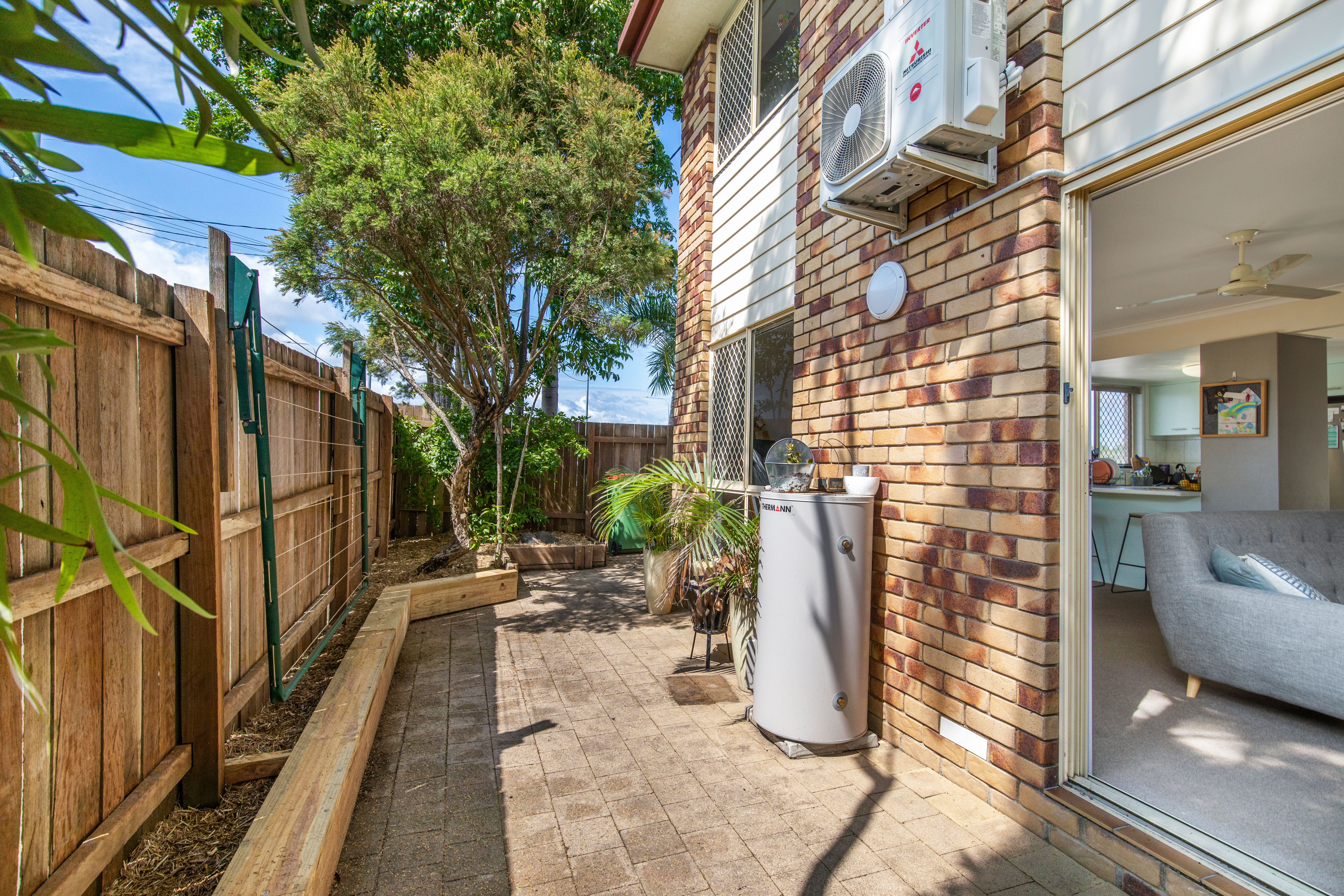 A staircase leads to the upper level offering three good sized bedrooms. The master is air-conditioned, and the second and third bedrooms also have built-in wardrobes and fans. The fenced and private courtyard is perfect for entertaining guests or enjoying the sunshine.