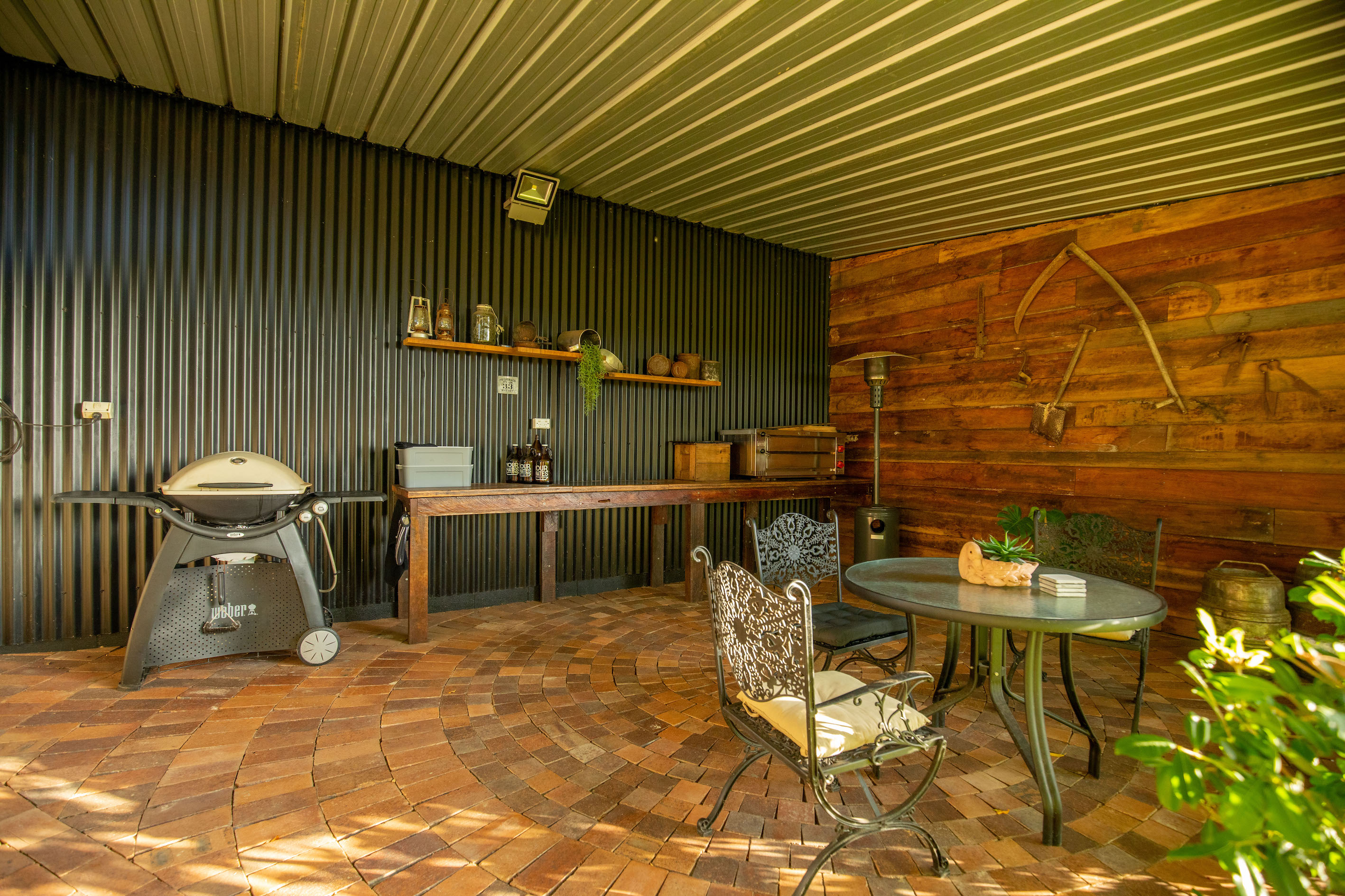 At the rear of the home is a huge American style shed 18x12m with laundry and toilet, 3-phase power and water connected, 3 x 3m roller doors, 2 x personal access doors, 3 x windows, mezzanine flooring, work benches and 7-metre container. A fabulous, covered BBQ area is alongside shed with built-in benches, lighting, power, and pizza oven and a picturesque outlook across property and beyond.