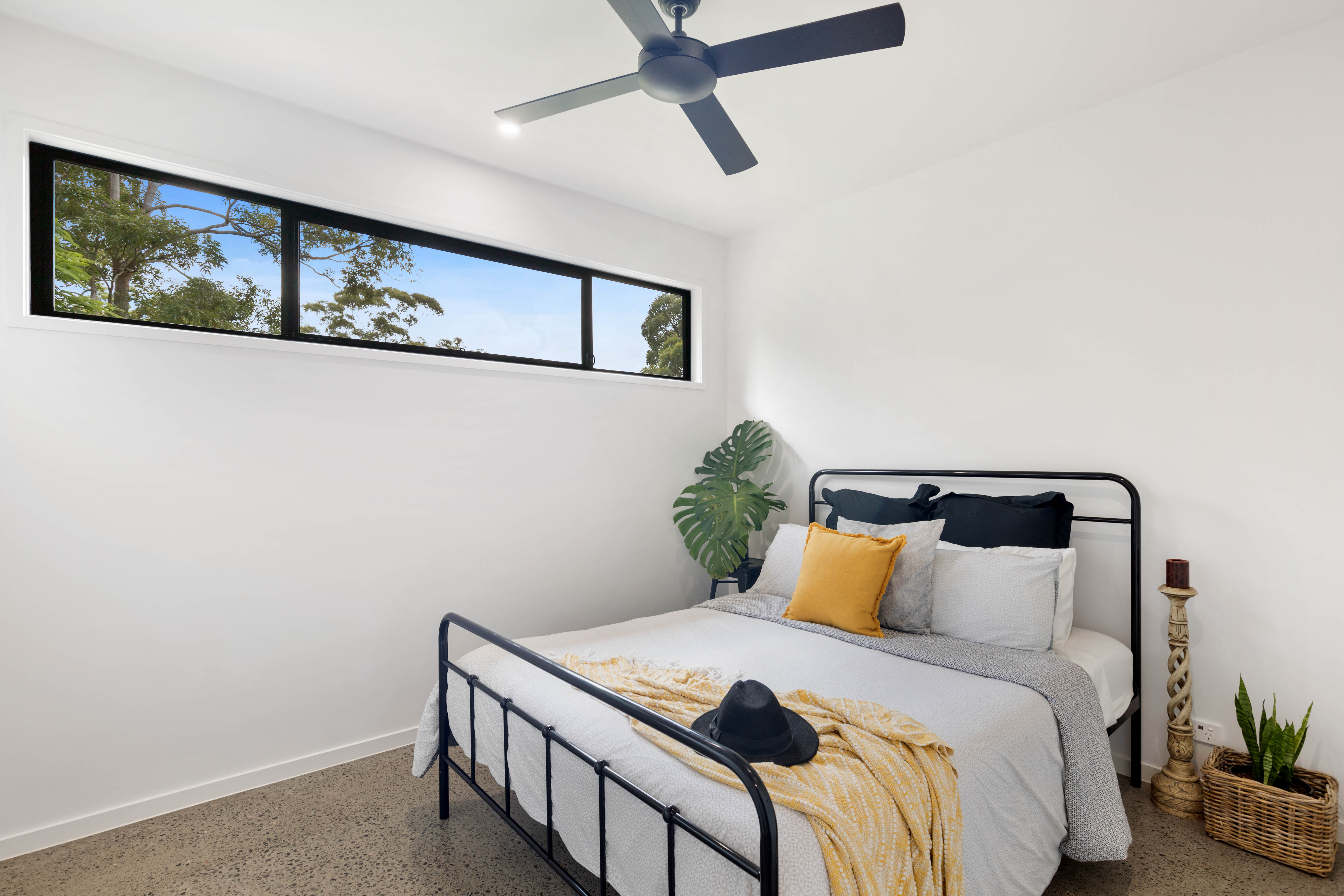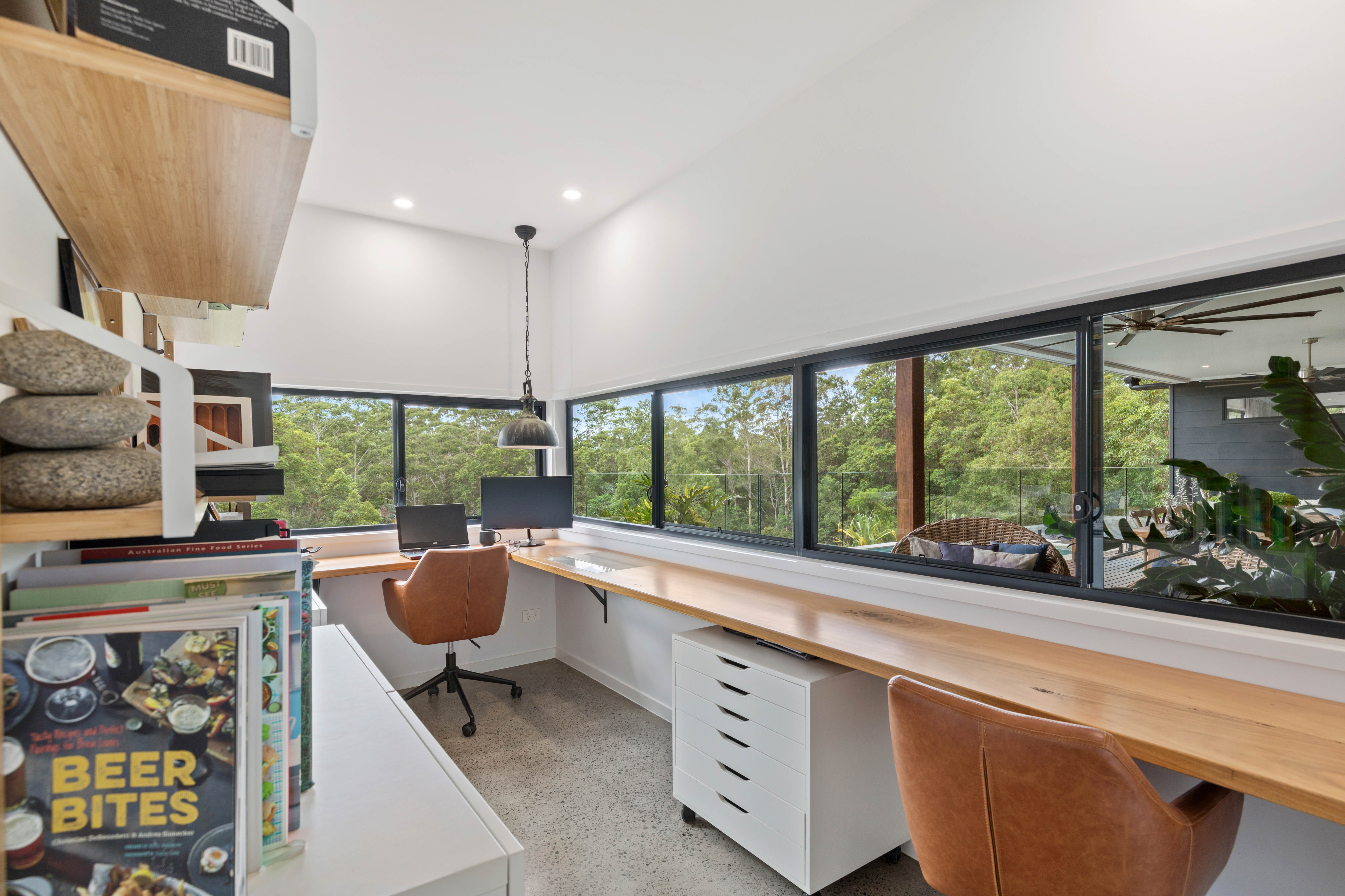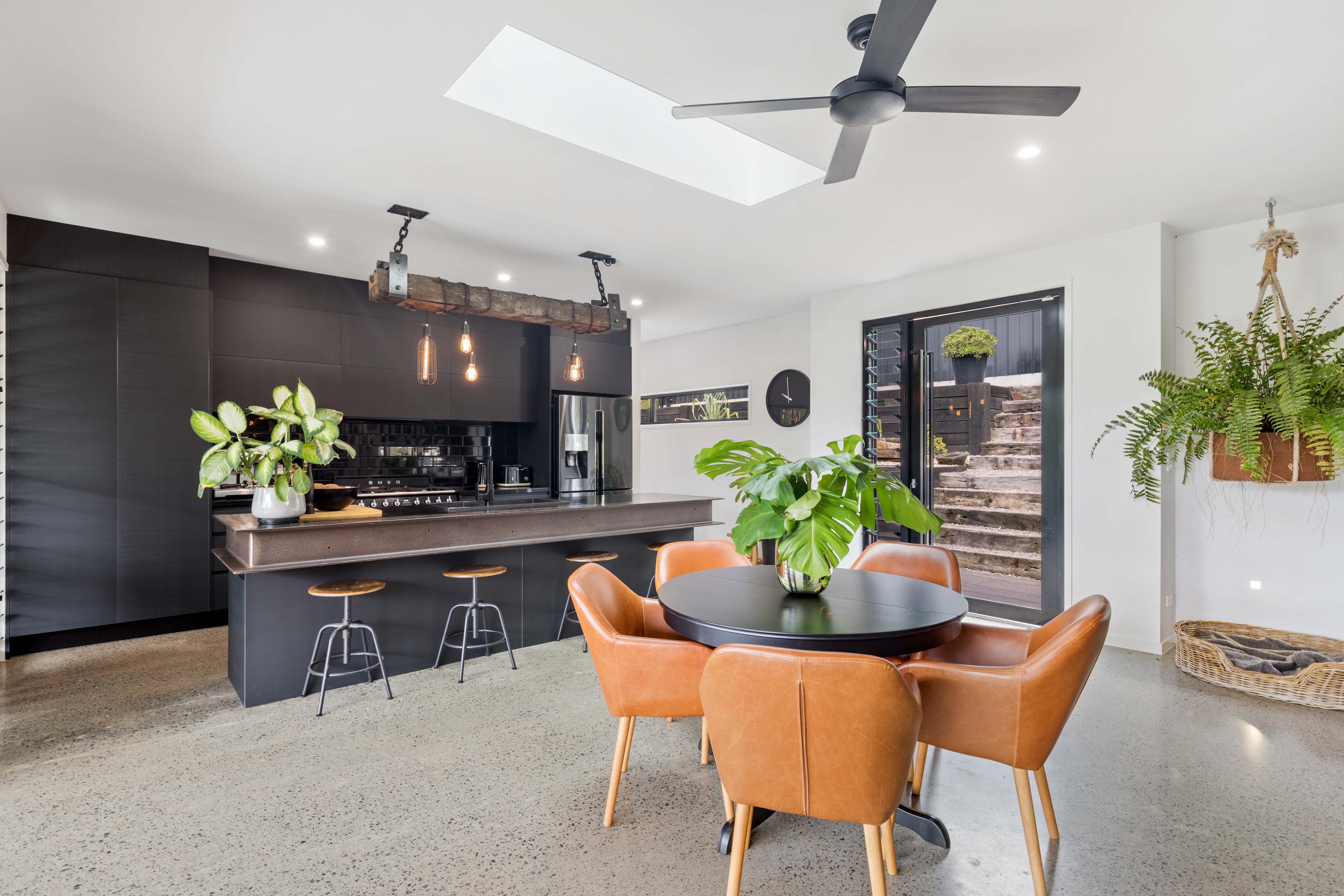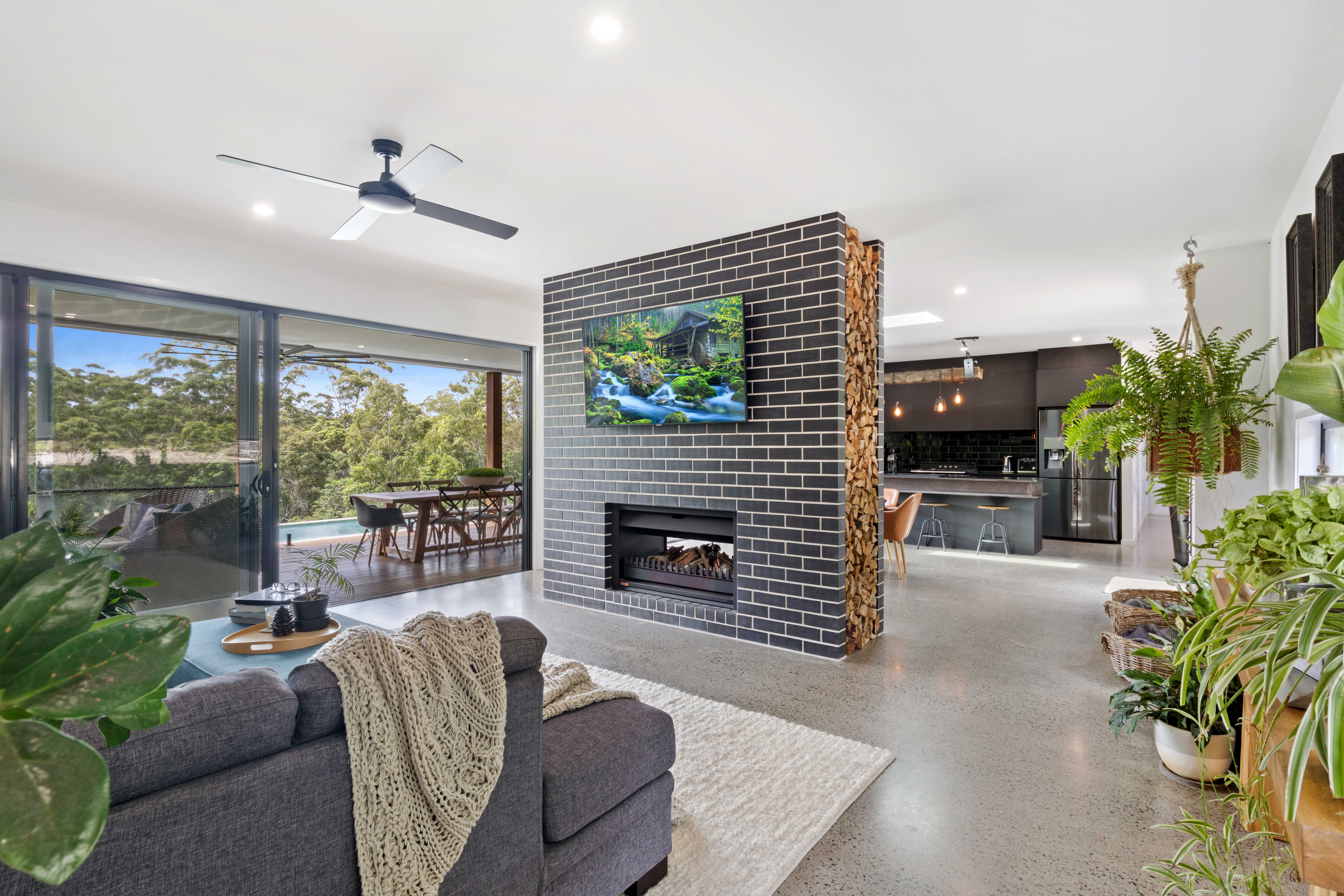High ceilings, polished concrete floors, spotted gum timber on decking, handsome double-sided fireplace in centre of living/dining, ceiling fans, air-conditioning, Smeg appliances, gas cooktop, soft close cabinetry, deck access from two of the bedrooms, large skylight, and sophisticated on-point décor throughout - are all features that enhance what is already a property with lashings of 'wow'!