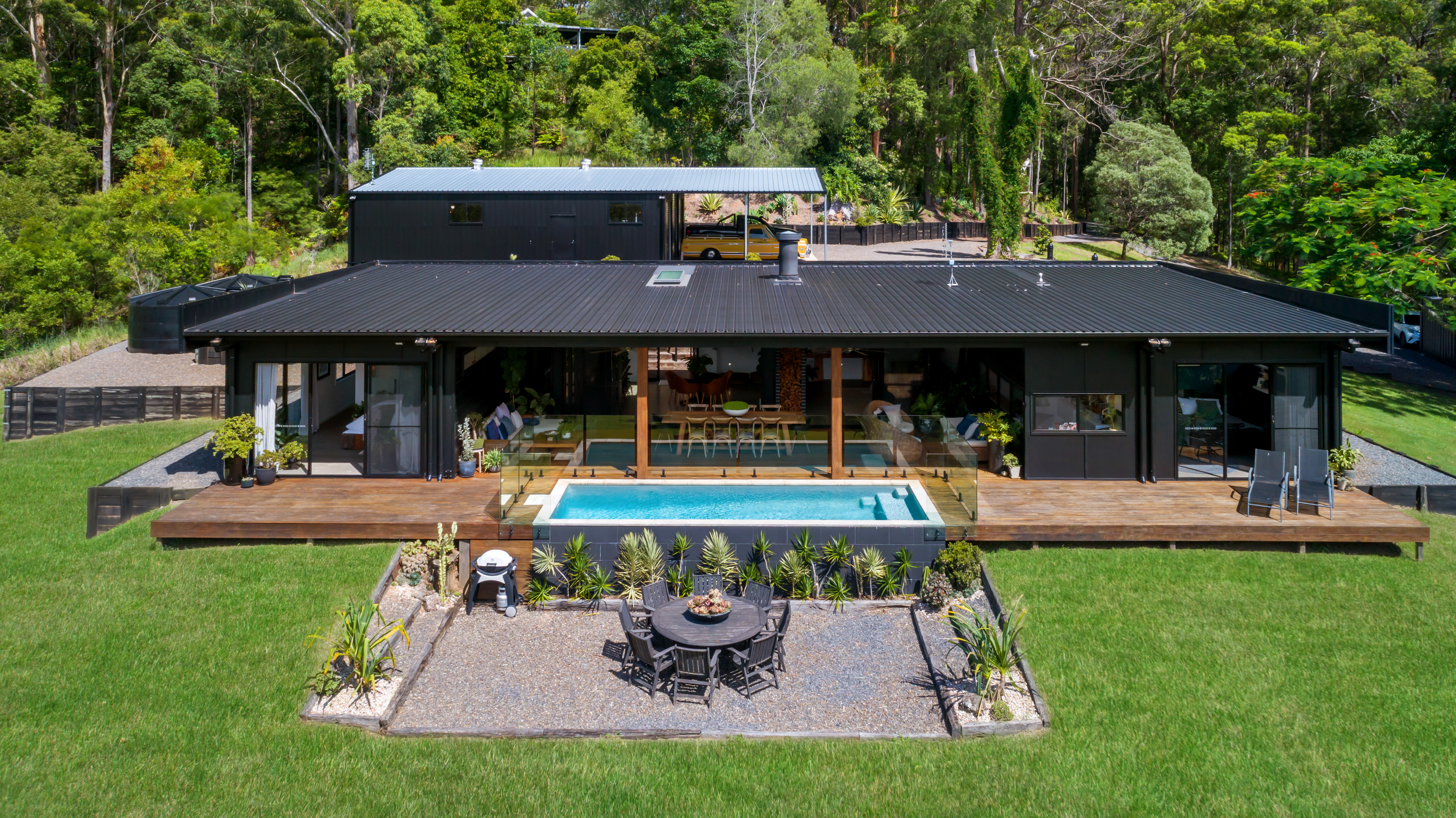 Comprising three bedrooms, two bathrooms plus powder room, custom-built office, generous- sized open plan living and dining, stunning galley style kitchen with high-end appliances, expansive decking overlooking inground pool and surrounding countryside, separate laundry, and huge 180m2 Colorbond 3-bay powered shed, toilet, TV aerial, and 36m2 mezzanine, that can accommodate up to nine vehicles, everything has been thought of!