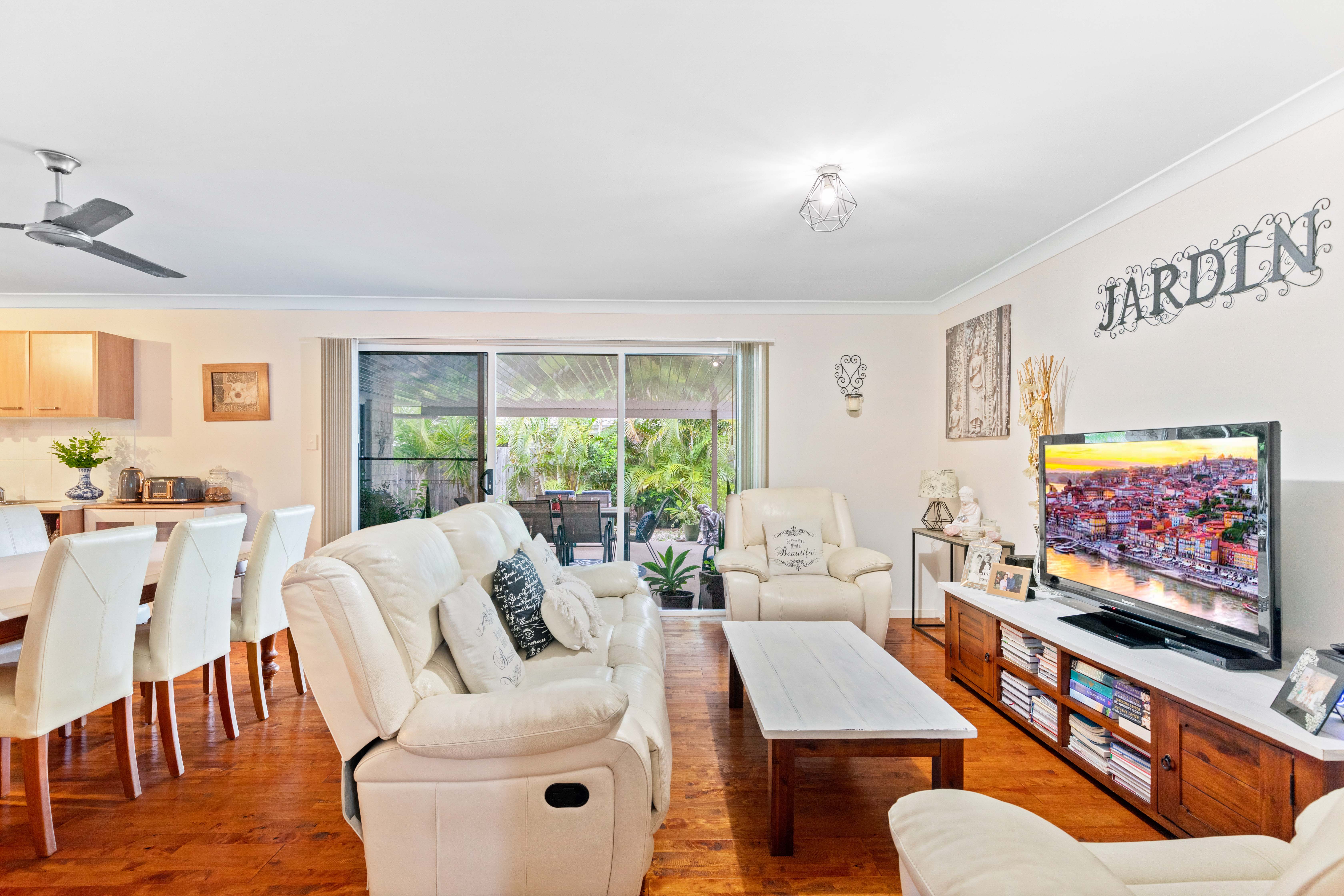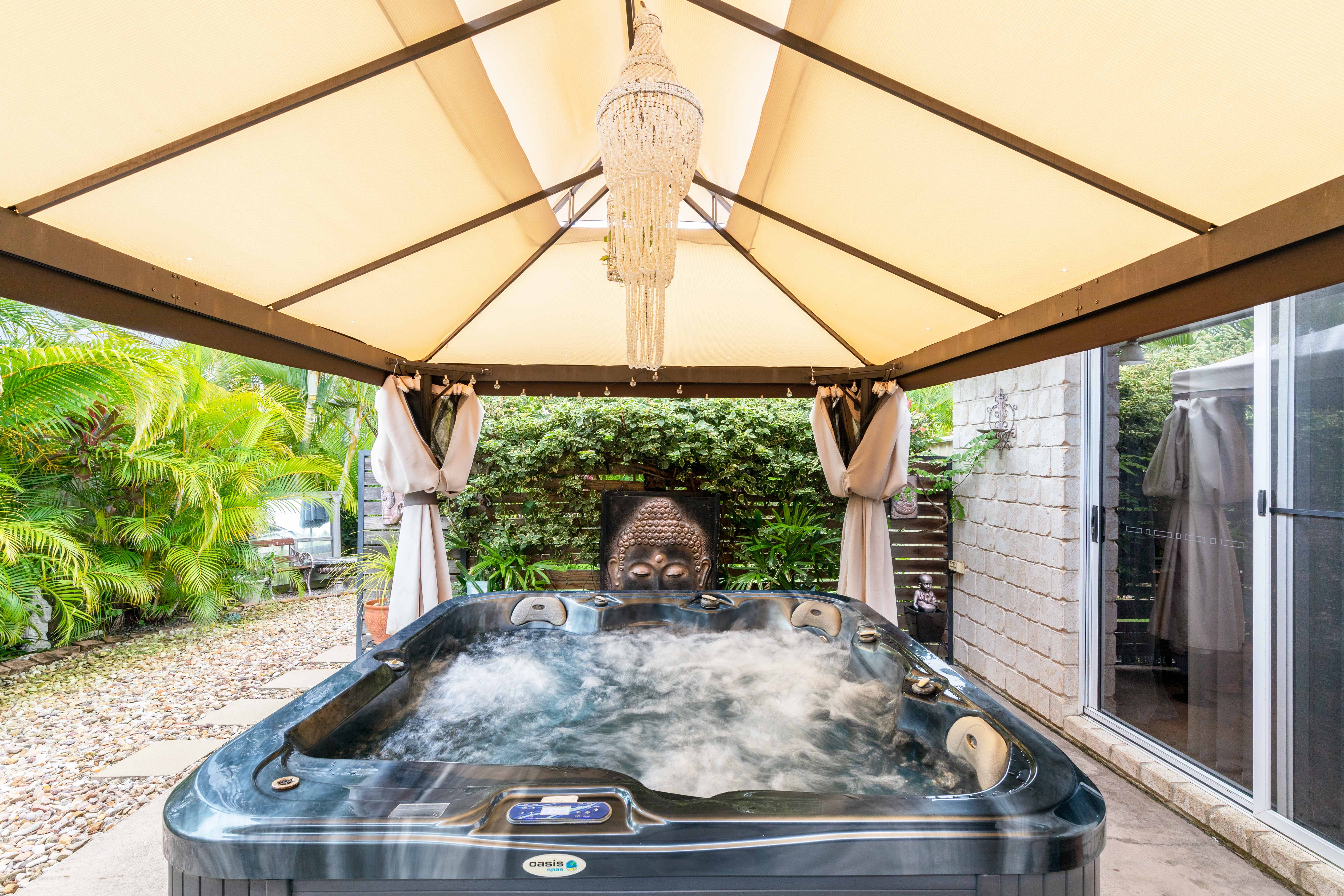 The entrance hallway opens to a large living room and leads through to a contemporary kitchen complete with stainless steel appliances and sit-up island. The kitchen flows into the central dining/living area and out to a private and leafy covered entertainment space and spa bath.