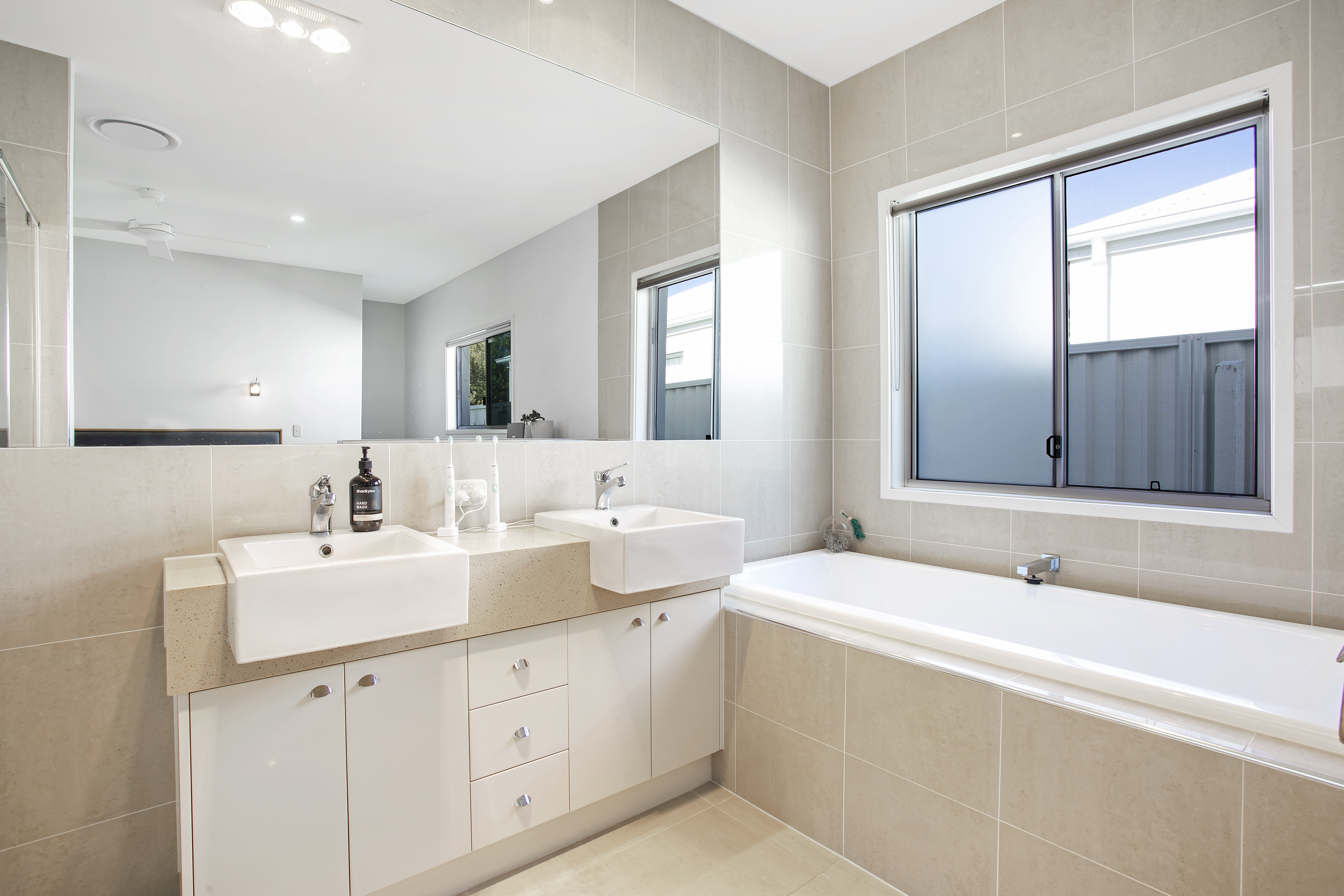 High ceilings, timber look vinyl flooring, ducted air-conditioning, ceiling fans, stone benches in kitchen, stainless steel appliances, gas cooktop, glass splashback, patio access from master, separate bath and shower in two of three bathrooms, dual vanities in ensuite, and roll down blind on patio; are some of the home's features.