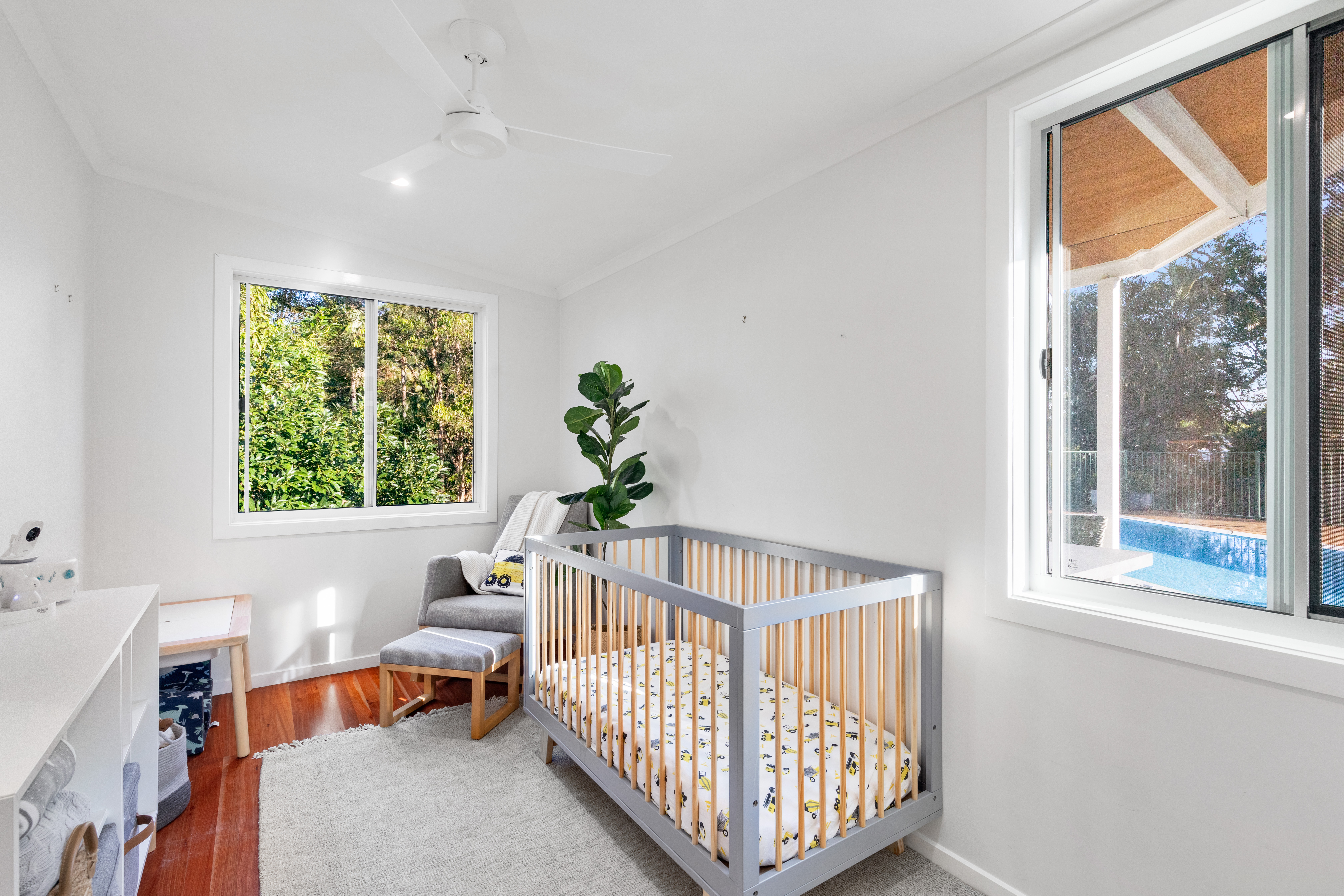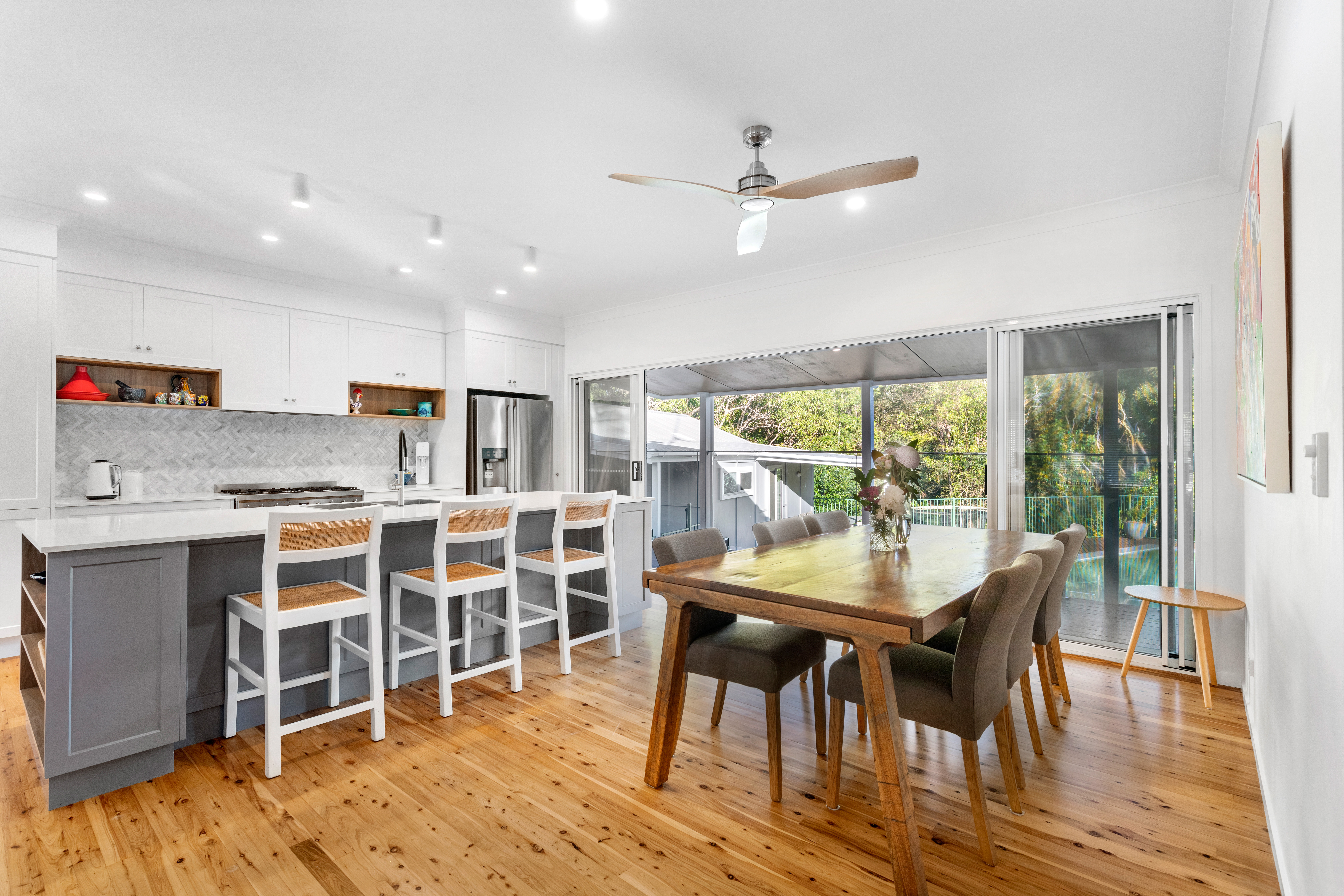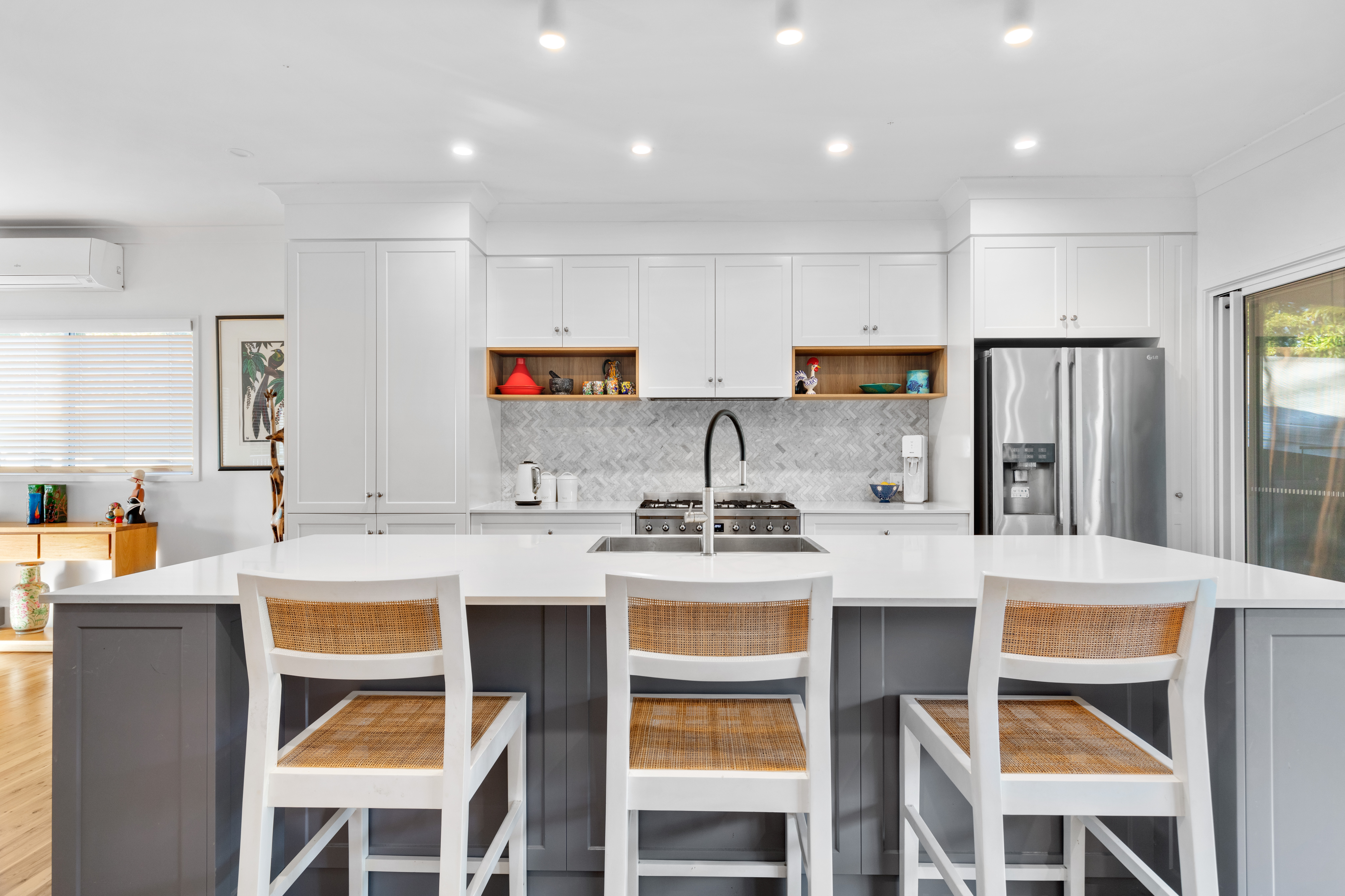 North facing, the home is light filled and showcases delightful views from the front verandah to Mount Ninderry; the gardens are landscaped and manicured, and there is a cosy firepit area to toast marshmallows under the stars, as well as a veggie patch. The cute white picket fence sets the tone for what is a thoroughly gracious property inside and out.