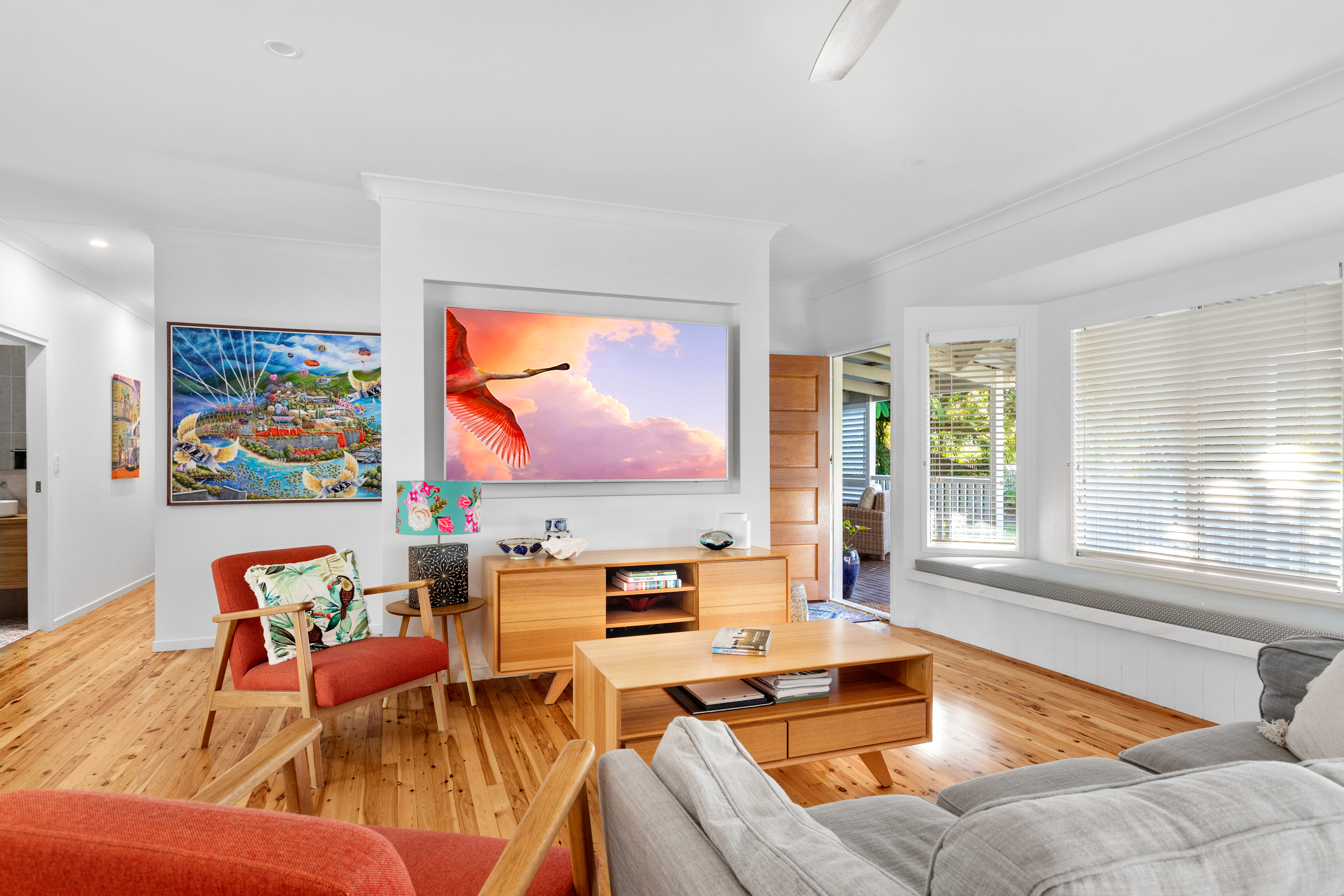 • Pine timber flooring, bay window with built-in seat