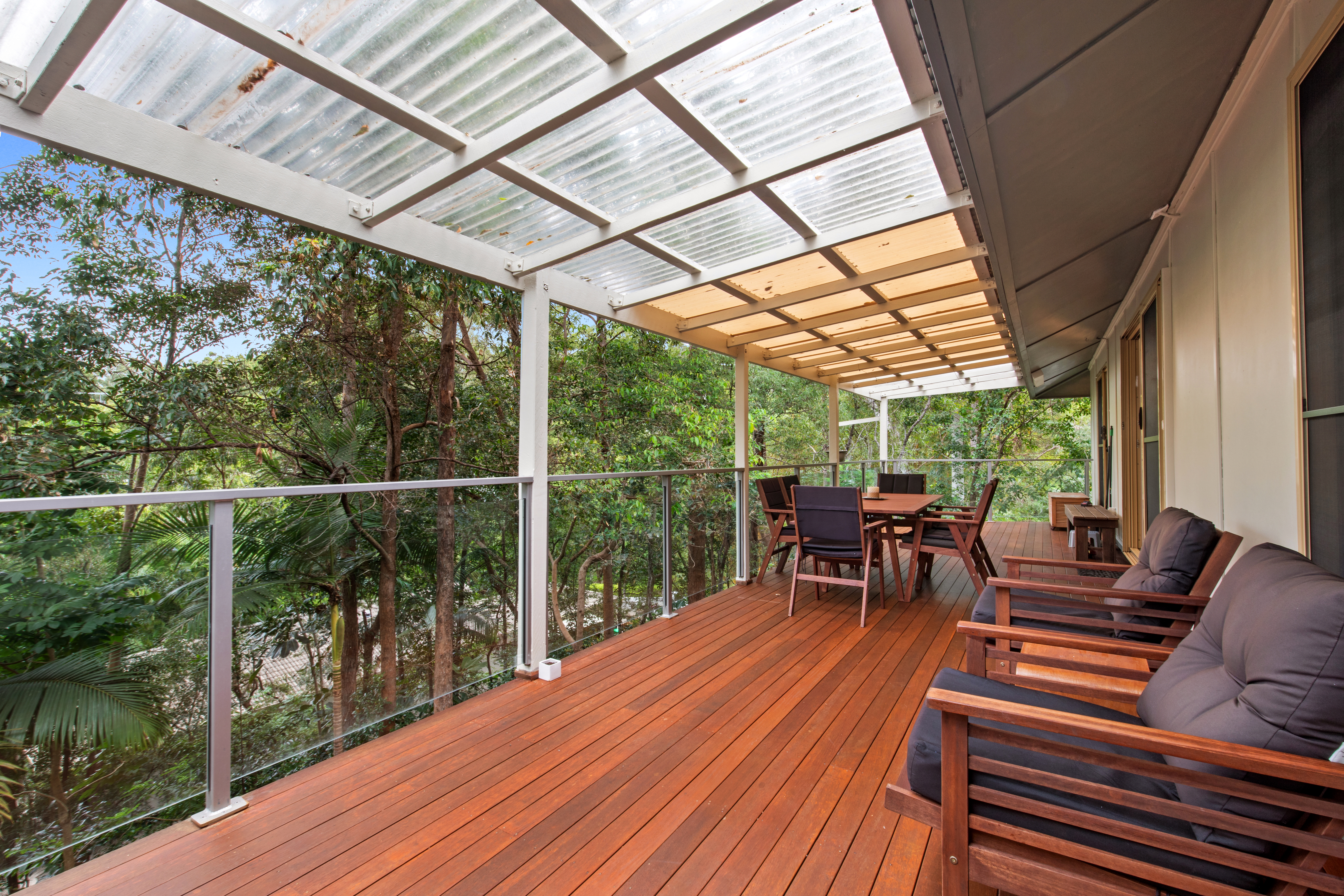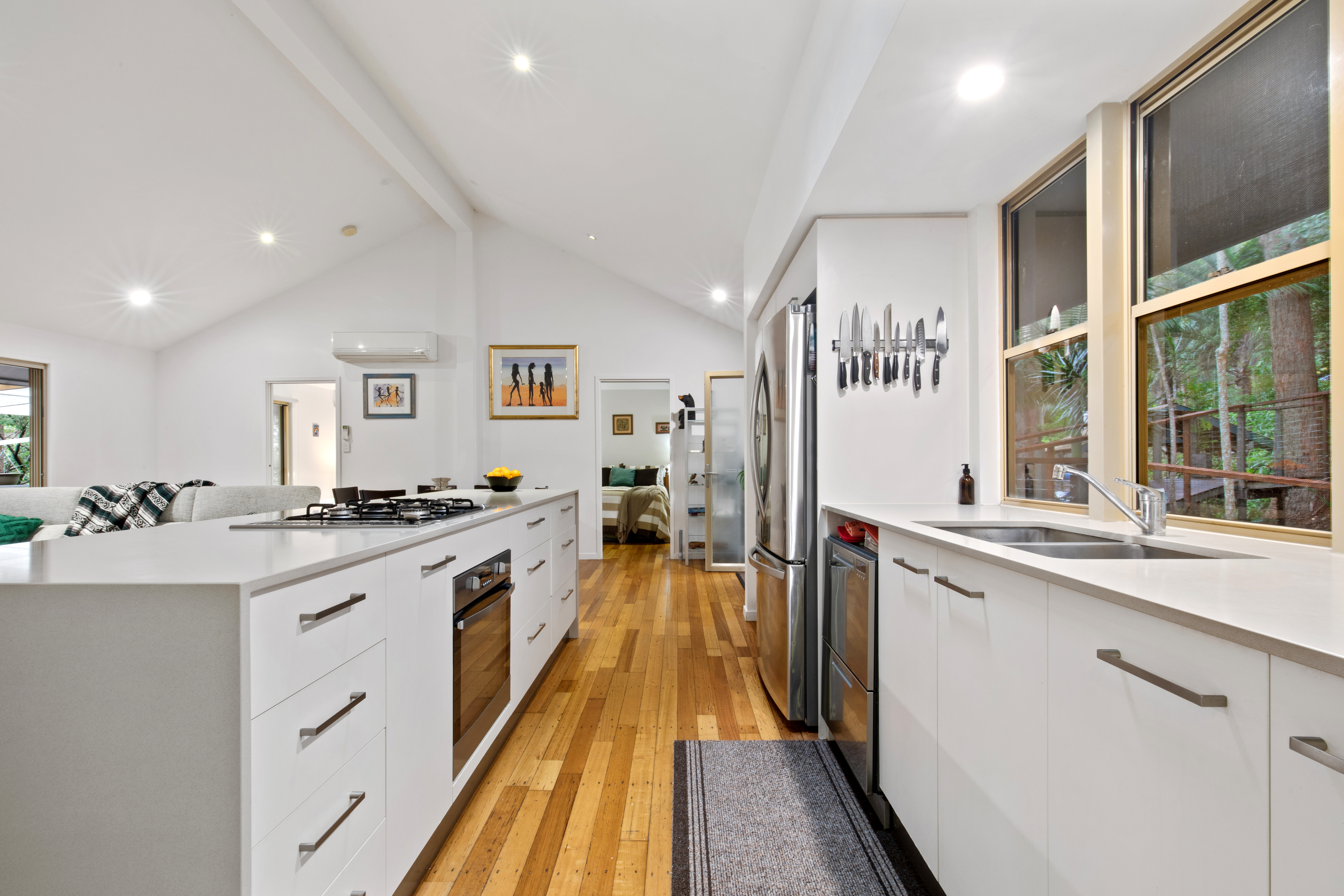 Elevated on an 817m2 block, with single level living, the home comprises three bedrooms, two bathrooms, open plan living flowing to an expansive covered deck with verdant forest outlook, and a quality kitchen. There is a separate lock-up garage with adjacent carport, workshop/storage alongside plus additional storage and laundry under.