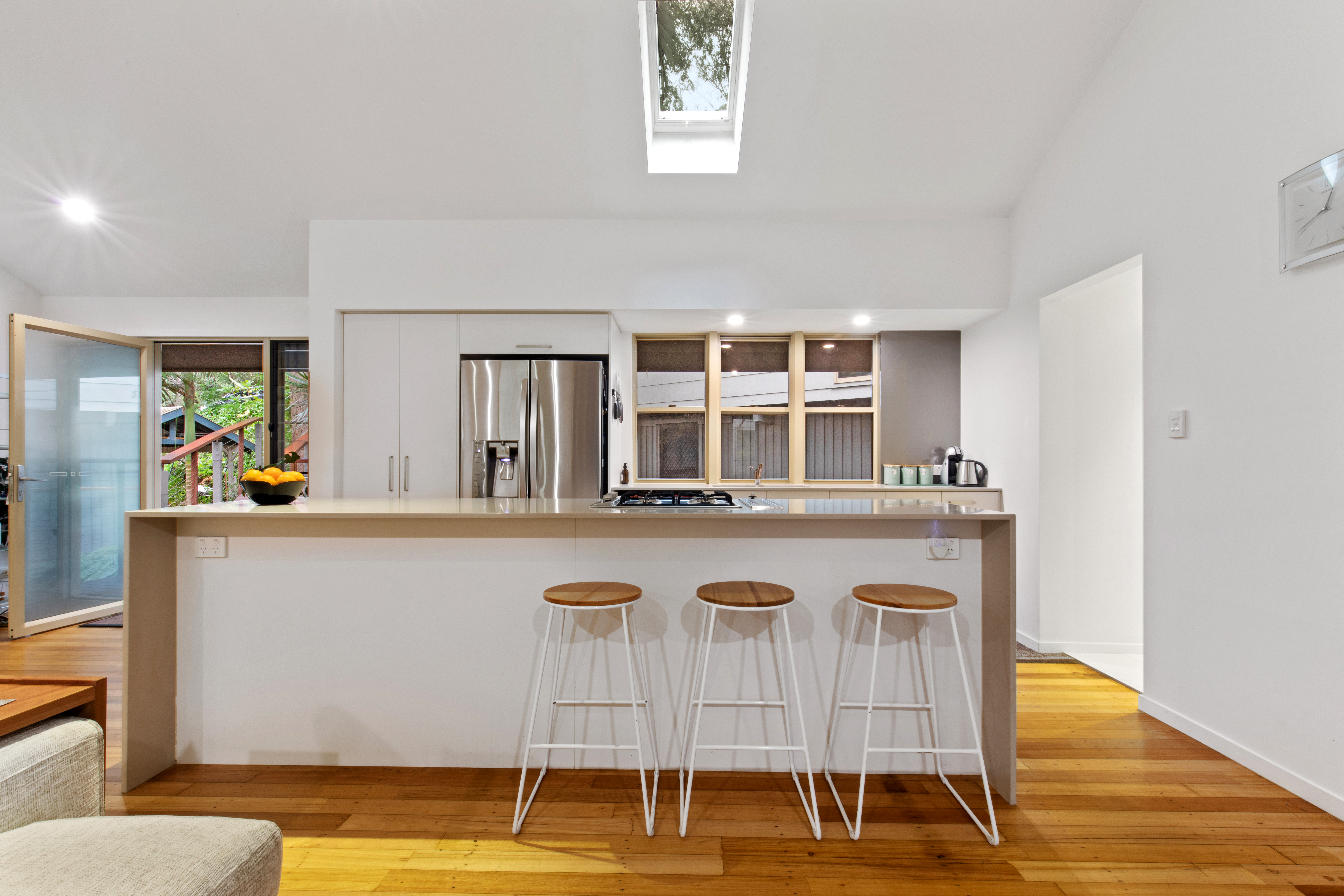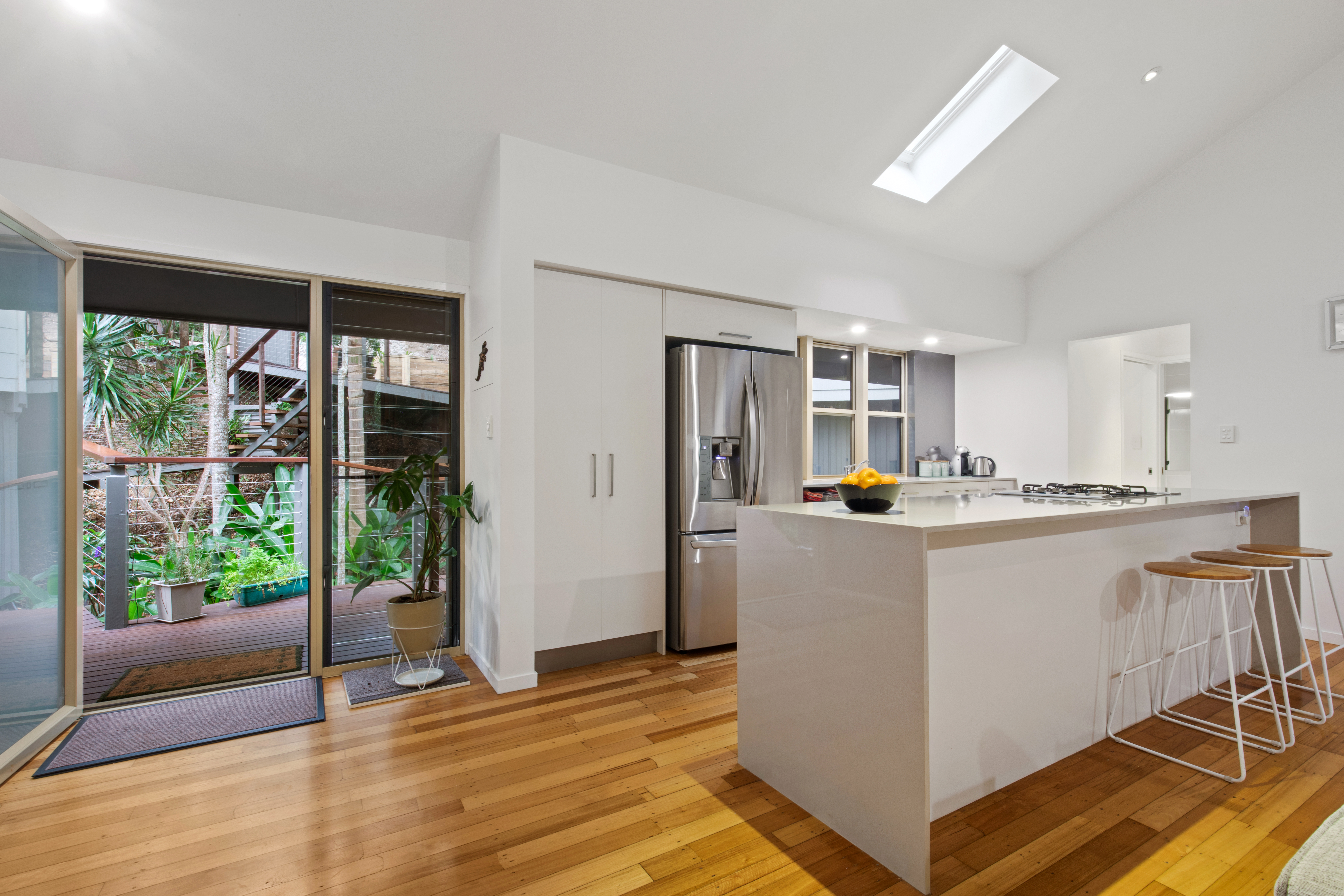 Soaring ceilings, stunning hardwood timber floors, sky window in the kitchen, stone benches, gas cooktop, ceiling fans, split system air-conditioning in master and living, banks of louvres to filter breezes, separate bath and shower in the main bathroom, deck access from two of three bedrooms, and a flat grassy space at the rear for children and pets to play - are all features of note.