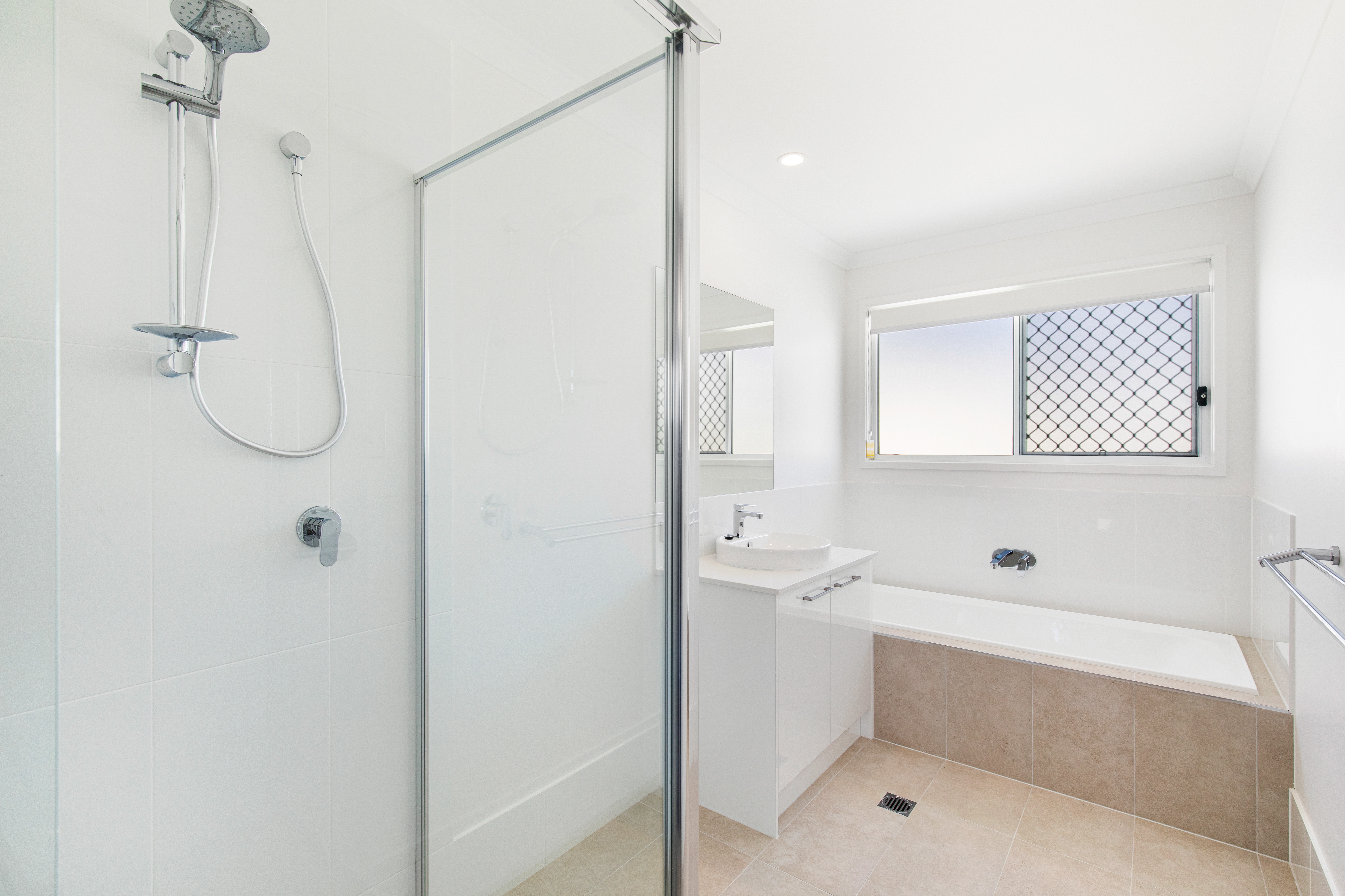 - Two well-appointed bathrooms with custom designed and made vanity, stone bench tops, frameless mirror, shower niche and 2m high wall tiles to showers
