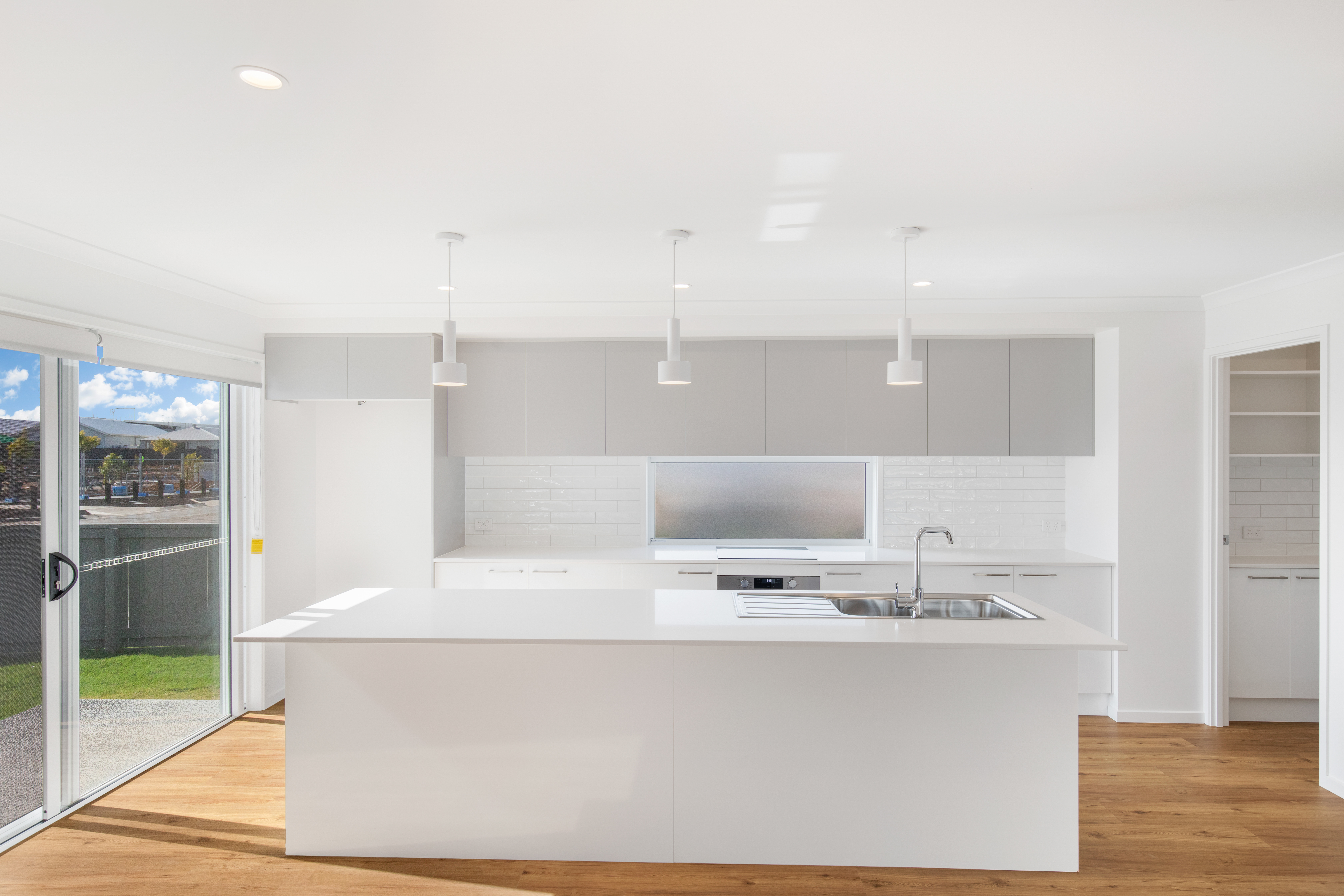 - Walk-in pantry with stone bench tops, power, under-bench cupboards and open shelves above