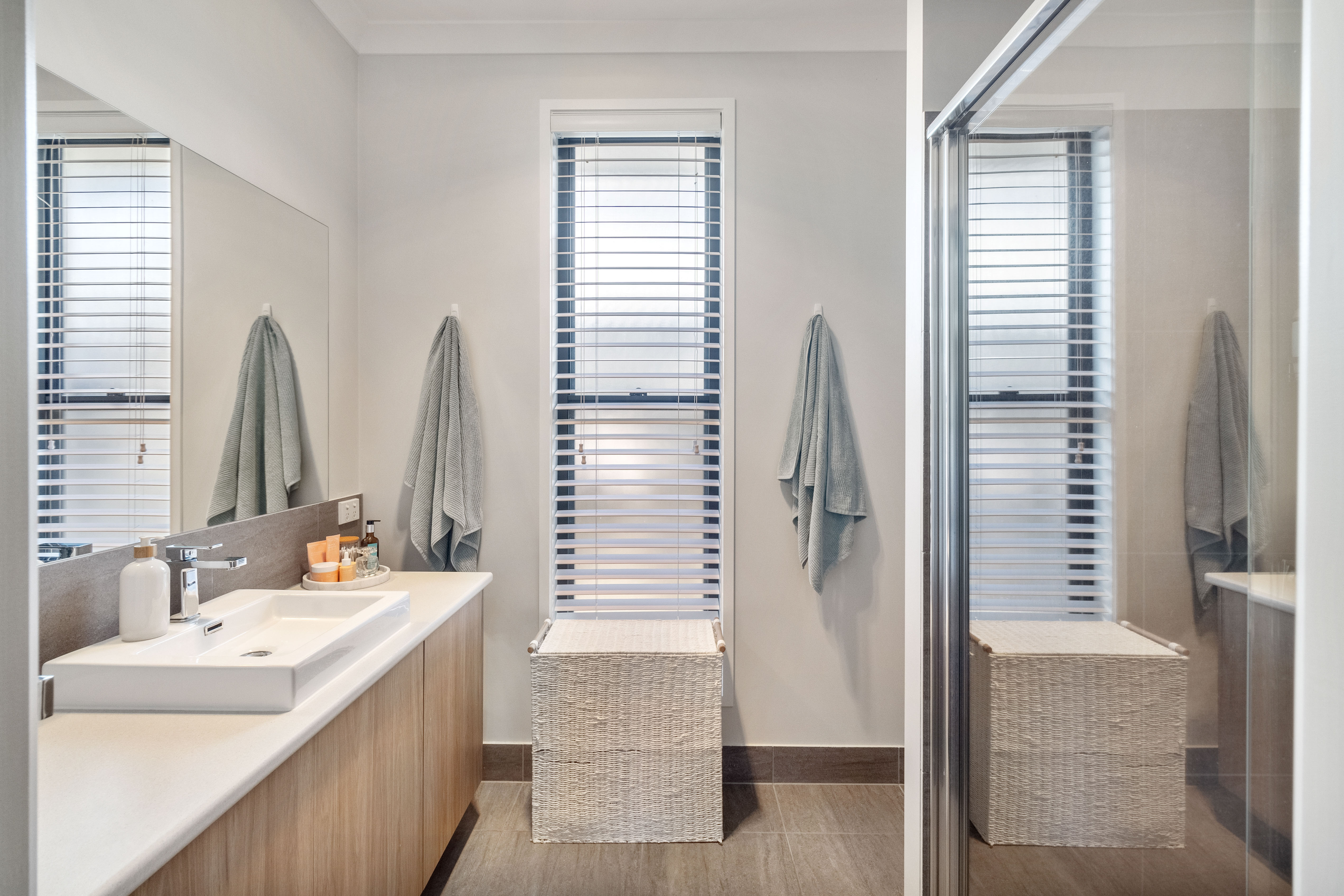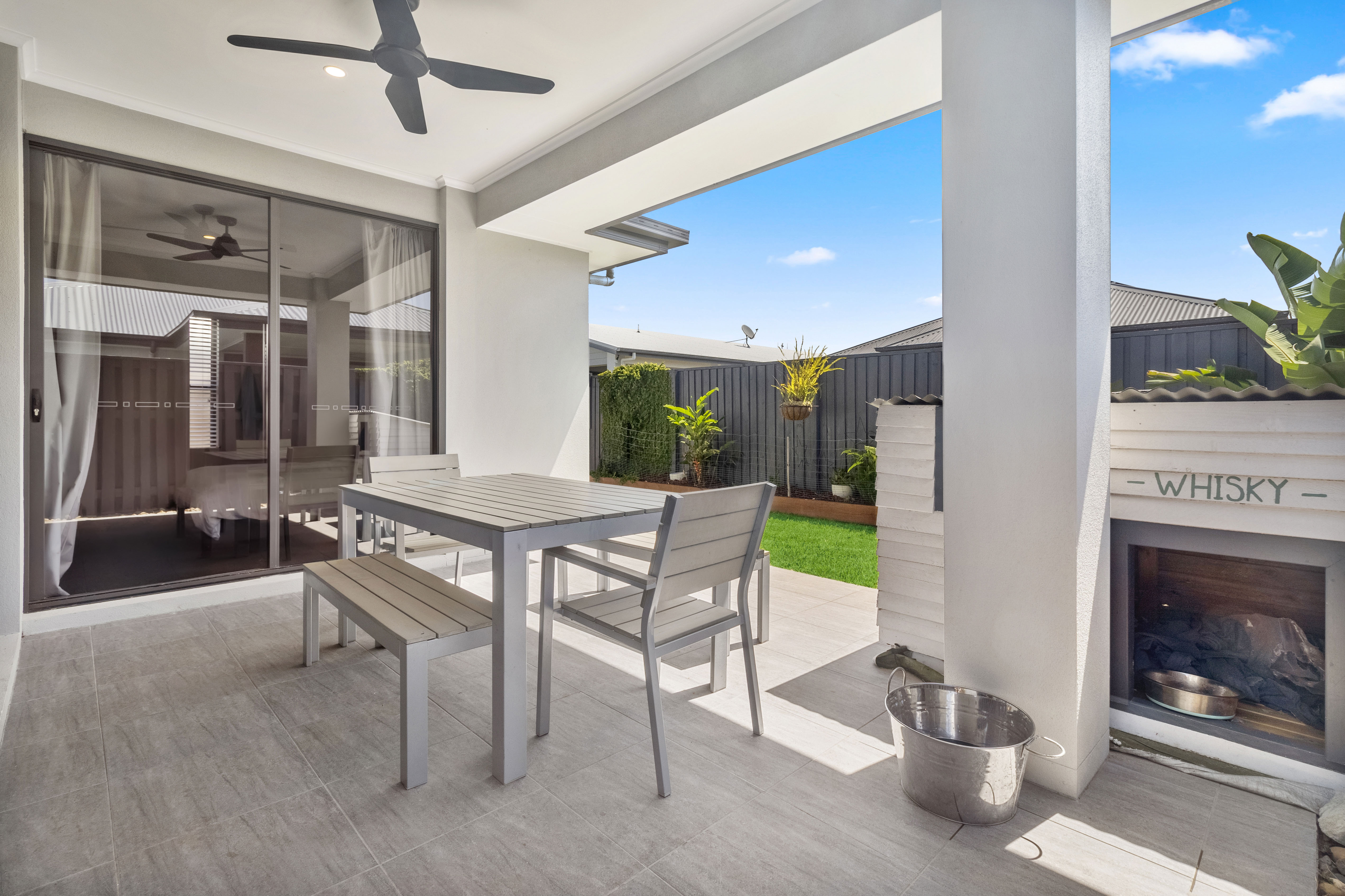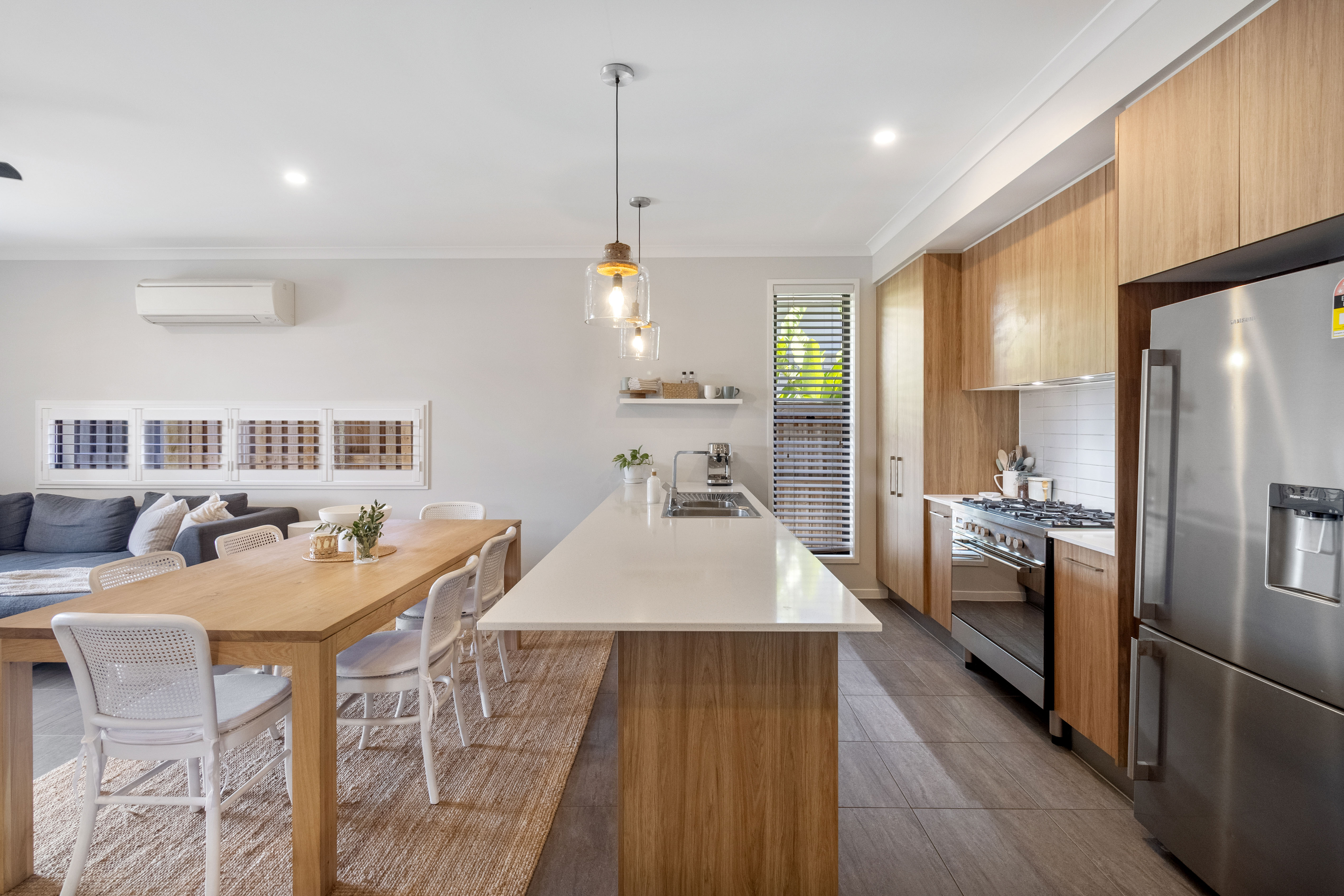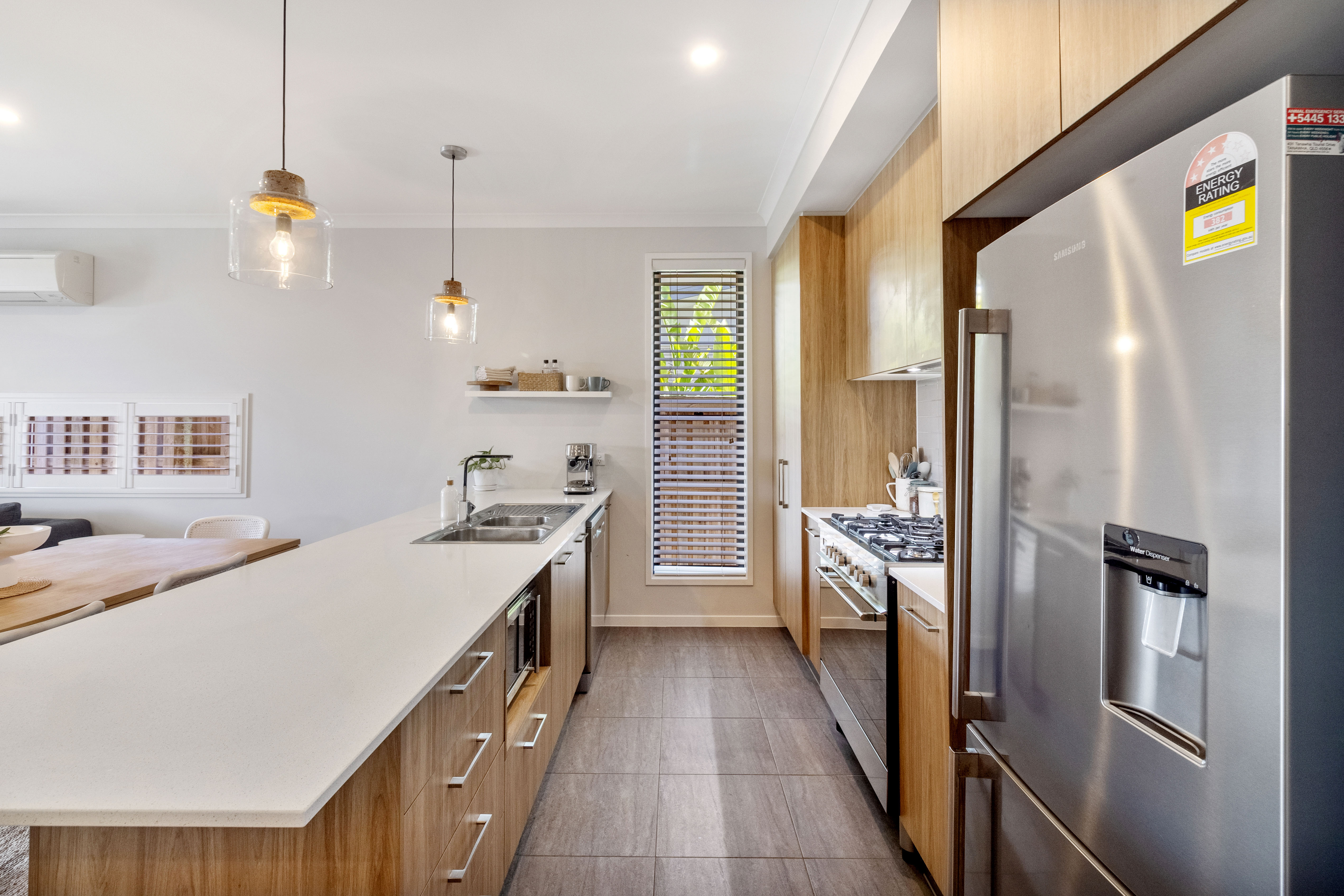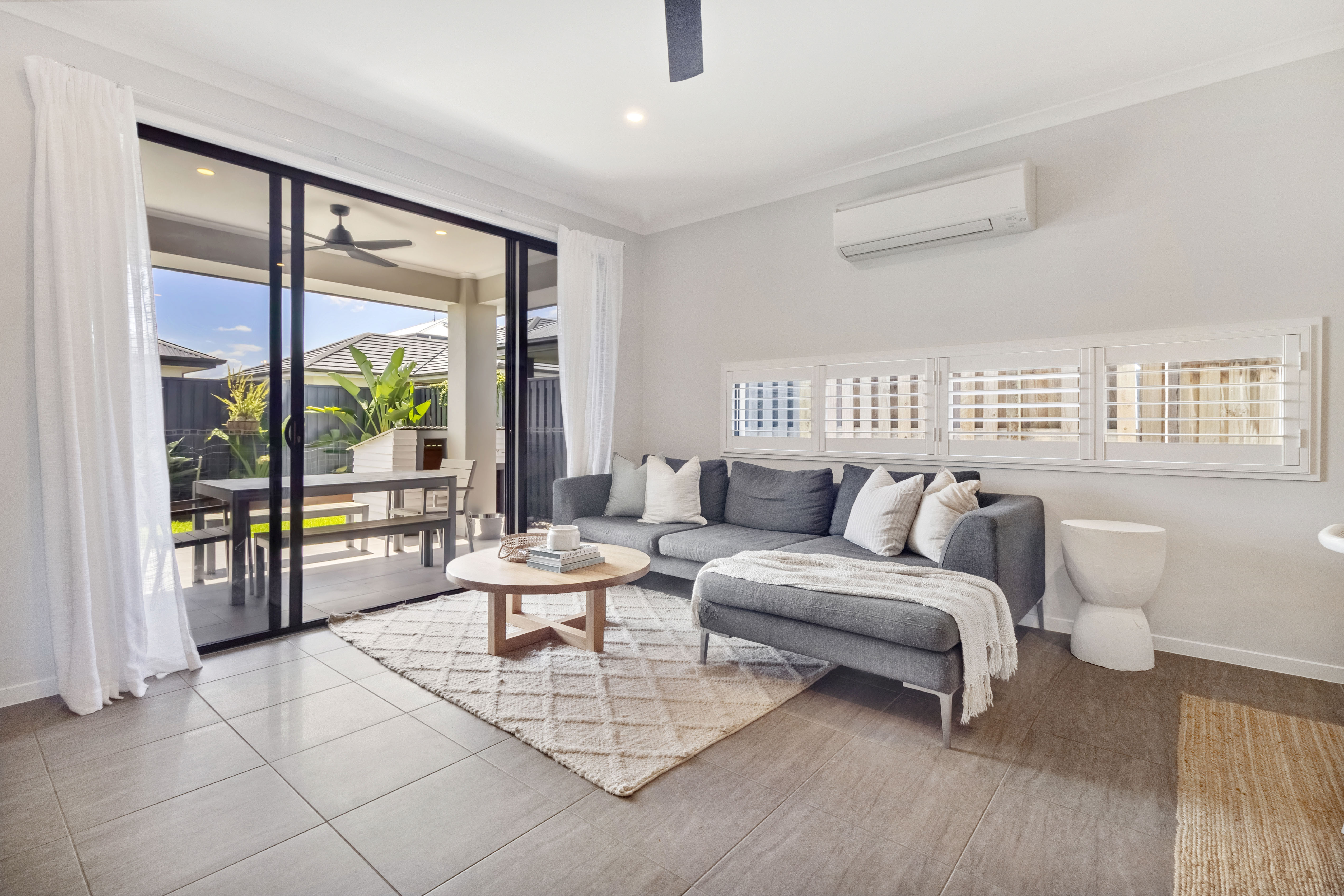 A fresh, crisp contemporary colour palette is easy on the eye and suits all furniture styles; other features include split system air-conditioning, ceiling fans, stone benches in kitchen, stainless steel appliances, 900mm electric oven with gas cooktop, separate shower and bath in main bathroom, direct patio access from master, external access from media, 2700 high ceilings, and pedestrian access from rear to garage (as well as internal access).