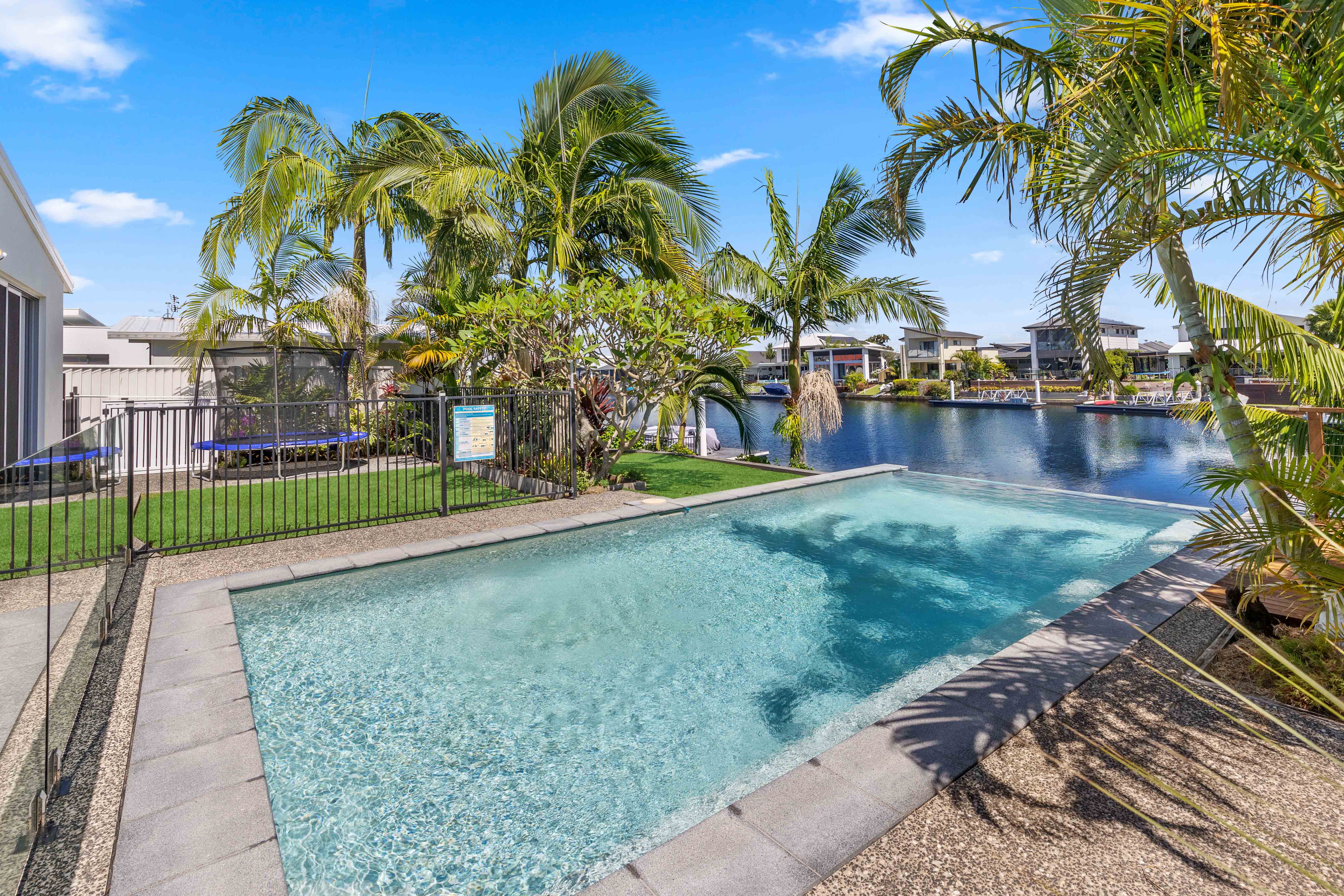 The home itself offers expansive, light-filled living covering approximately 330 square metres, comprising four bedrooms, two bathrooms plus powder room, two separate living areas, well-equipped galley kitchen with butler's pantry, covered alfresco terrace overlooking inground saltwater pool and canal, separate laundry with large linen press, and double lock up garage, plus double side access for boat/trailer.