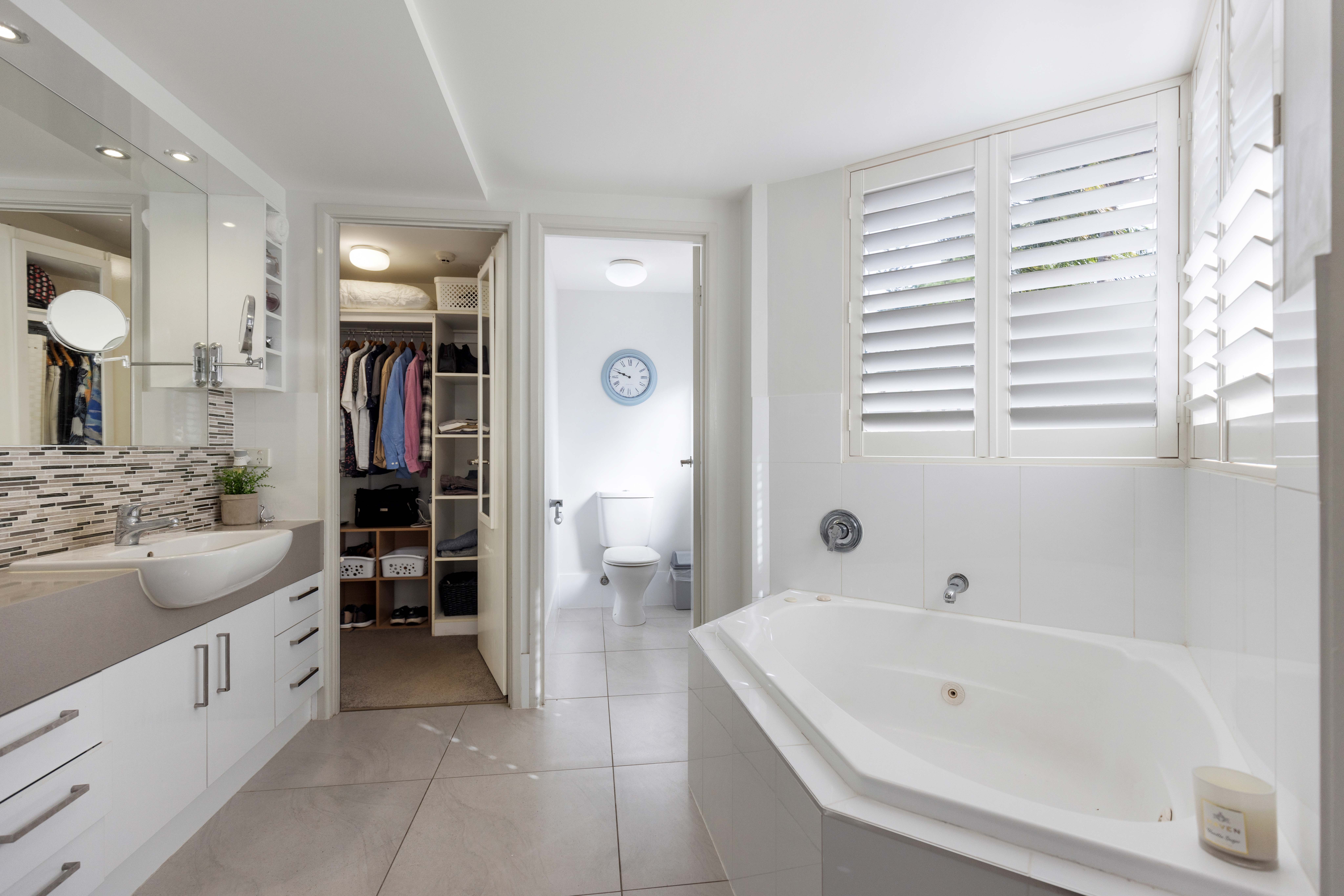 Features include split system air-conditioning, ceiling fans, plantation shutters, stone benches in kitchen, stainless steel appliances, spa bath in ensuite, separate bath and shower in main bathroom, private patio off master, security screens and easy-care tiled flooring.