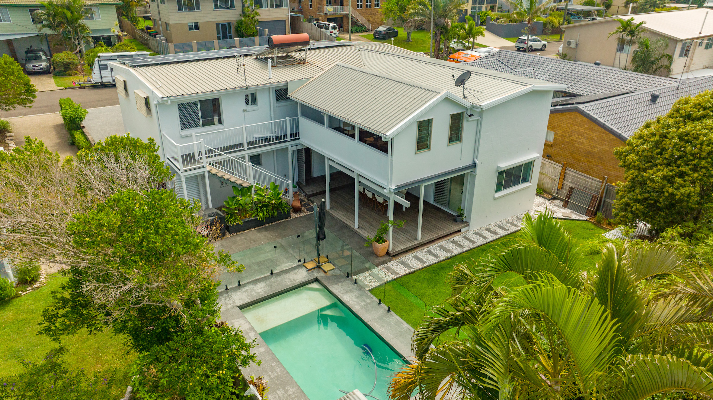 Freshly painted inside and out, other features include hardwood timber floors, ceiling fans, dual shower in upper bathroom, air-conditioning on ground level, internal and external stairs, solar hot water, 6.5kW solar power, water tank, garden shed, 6x3m concrete inground pool with glass pool fencing, and ocean glimpses to Moffat Beach and shipping channels from upstairs kitchen and dining.