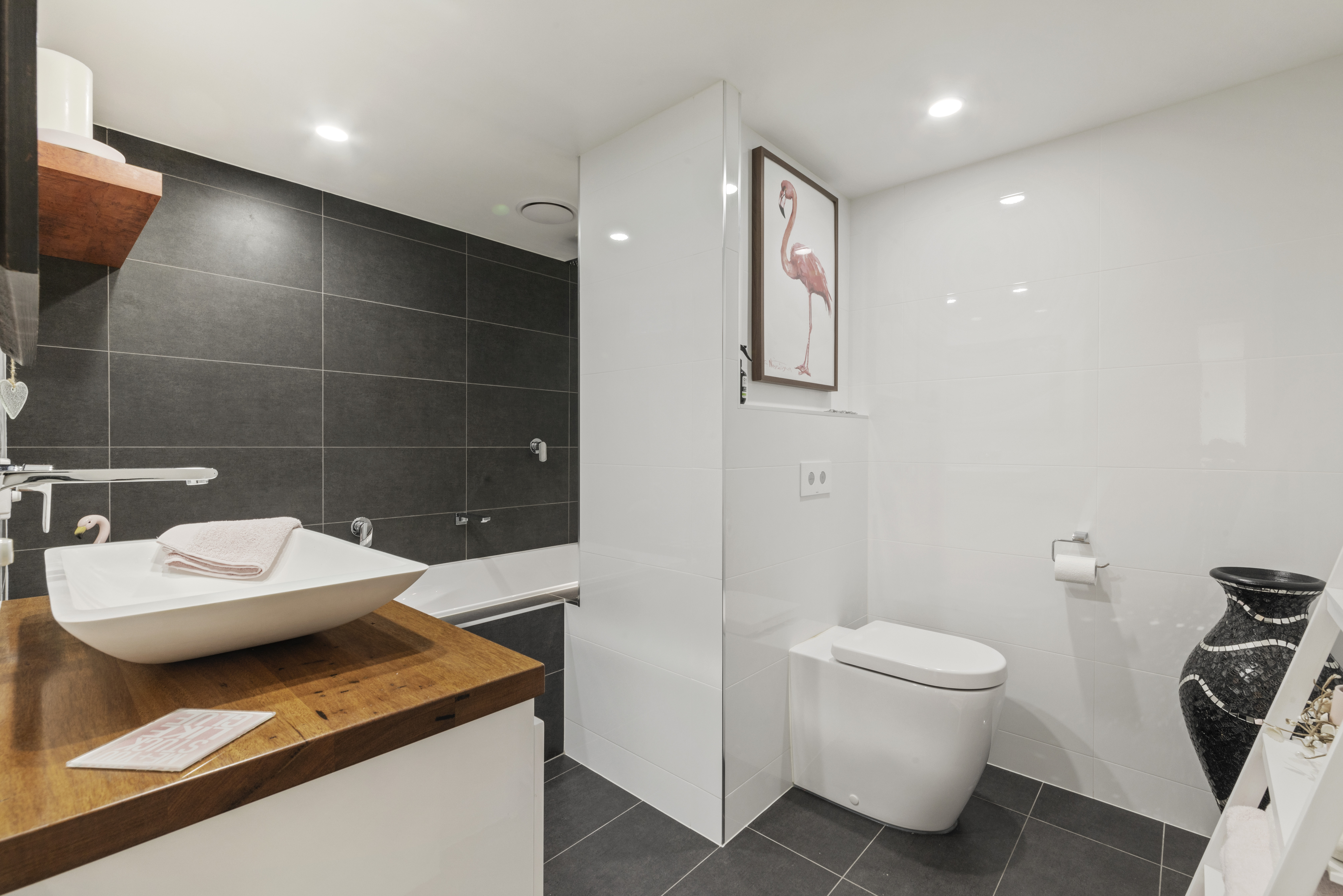 The luxury continues in the main bathroom with floor to ceiling tiles feature timber bench tops plus a soaker tub and mood lighting to relax after a long day. The apartment also features a house sized laundry.
