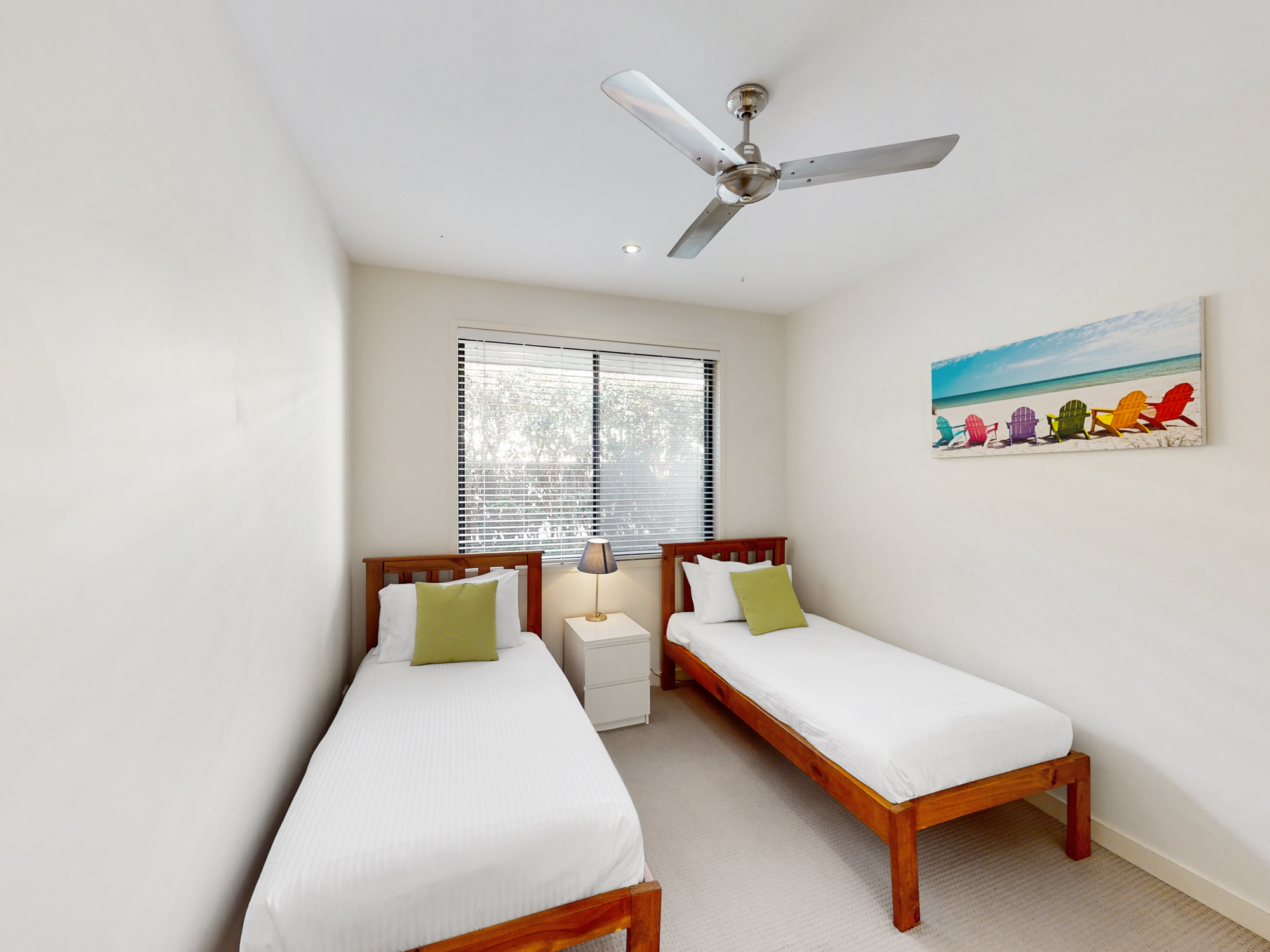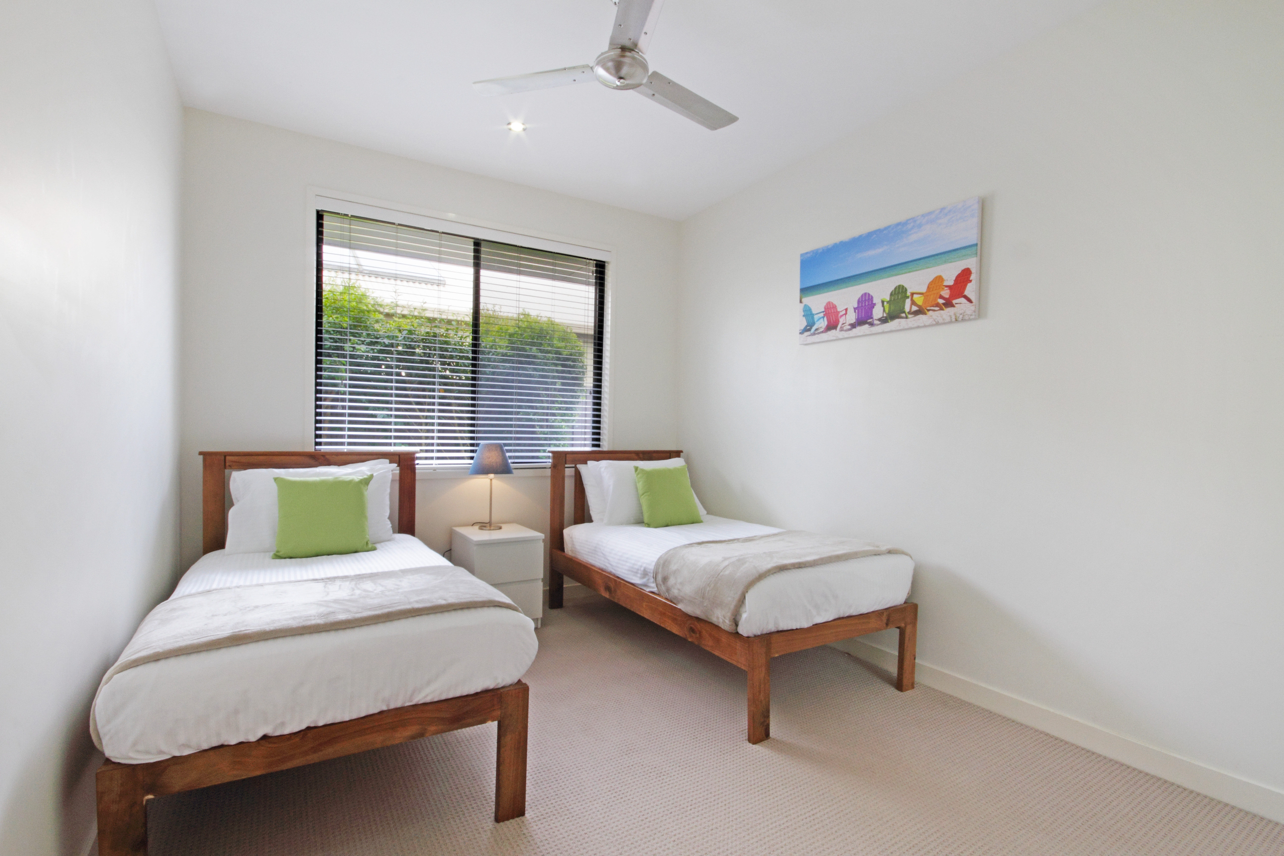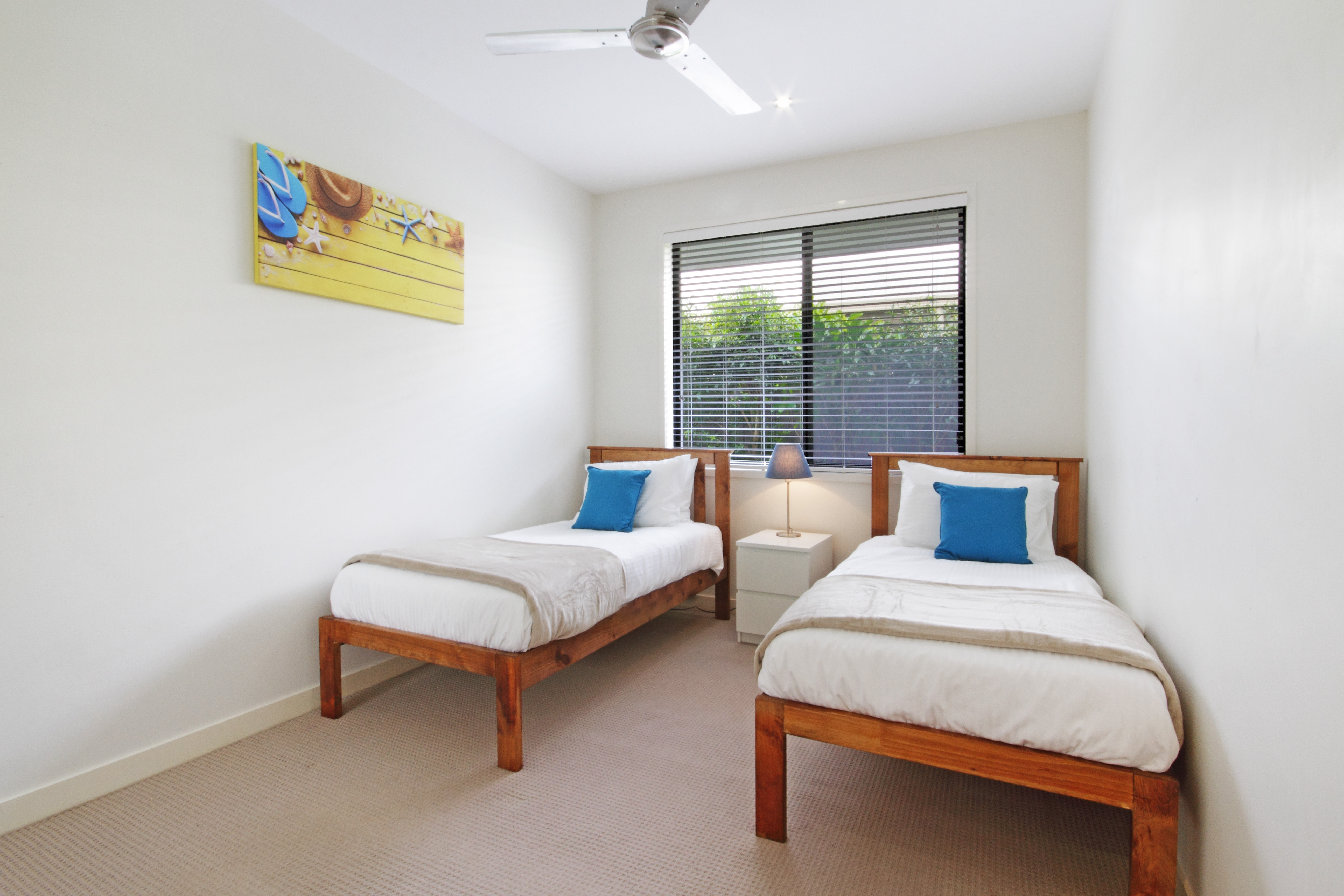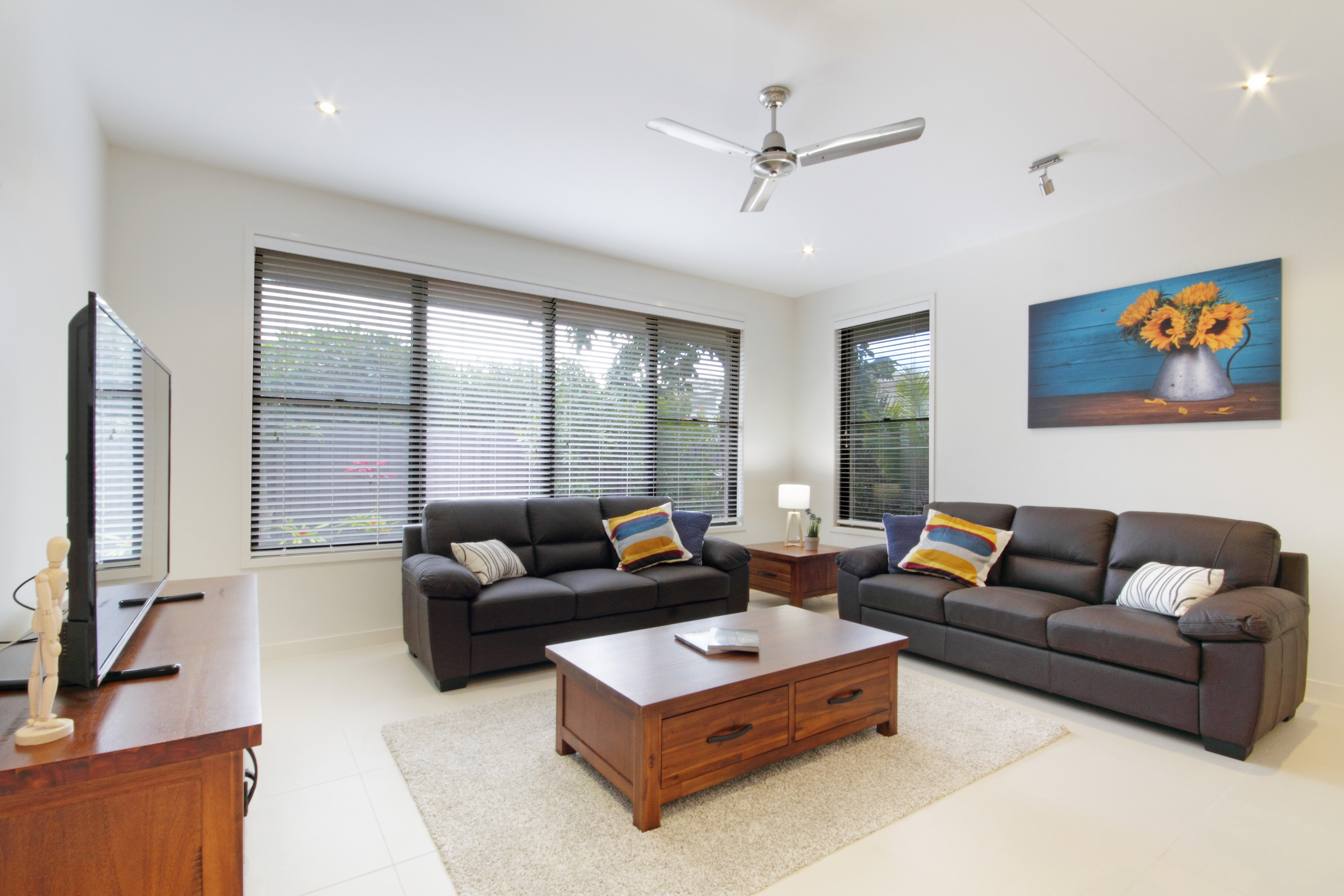 Bedrooms 2, 3, and 4 located at the back of the house have built-in robes, ceiling fans, and blinds