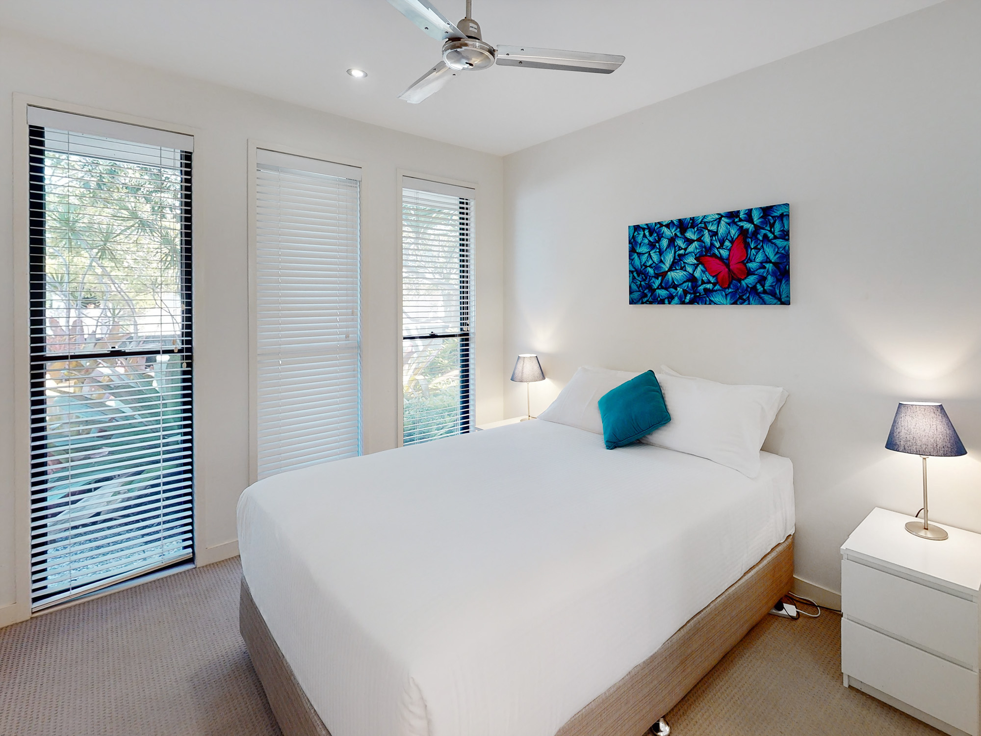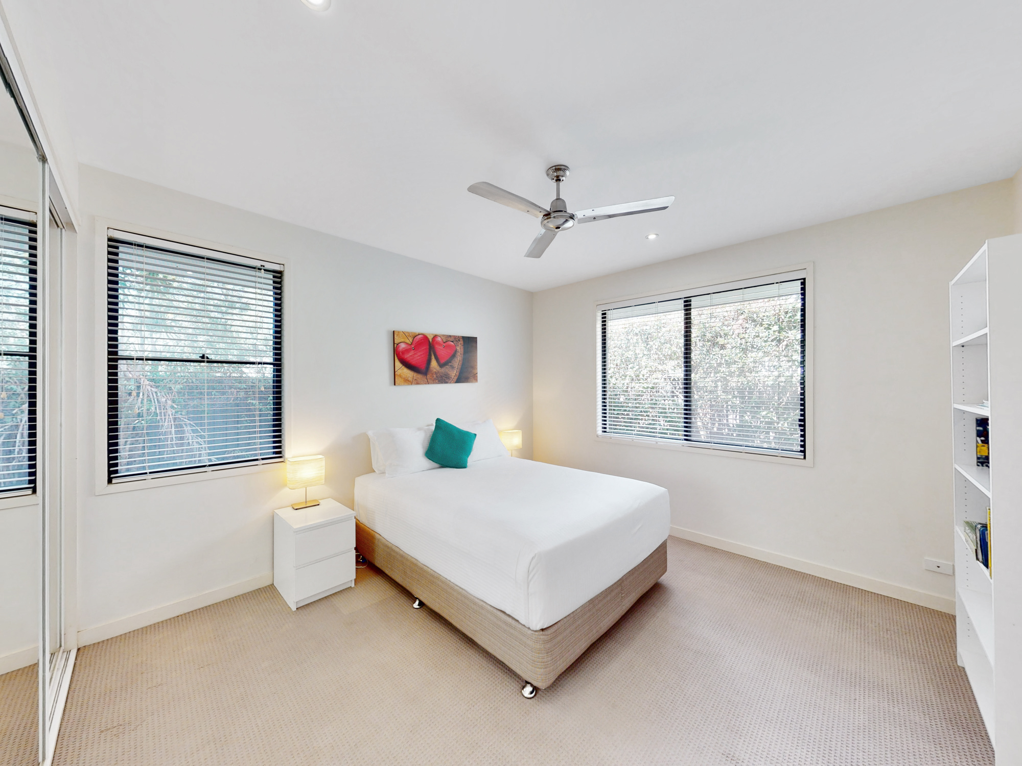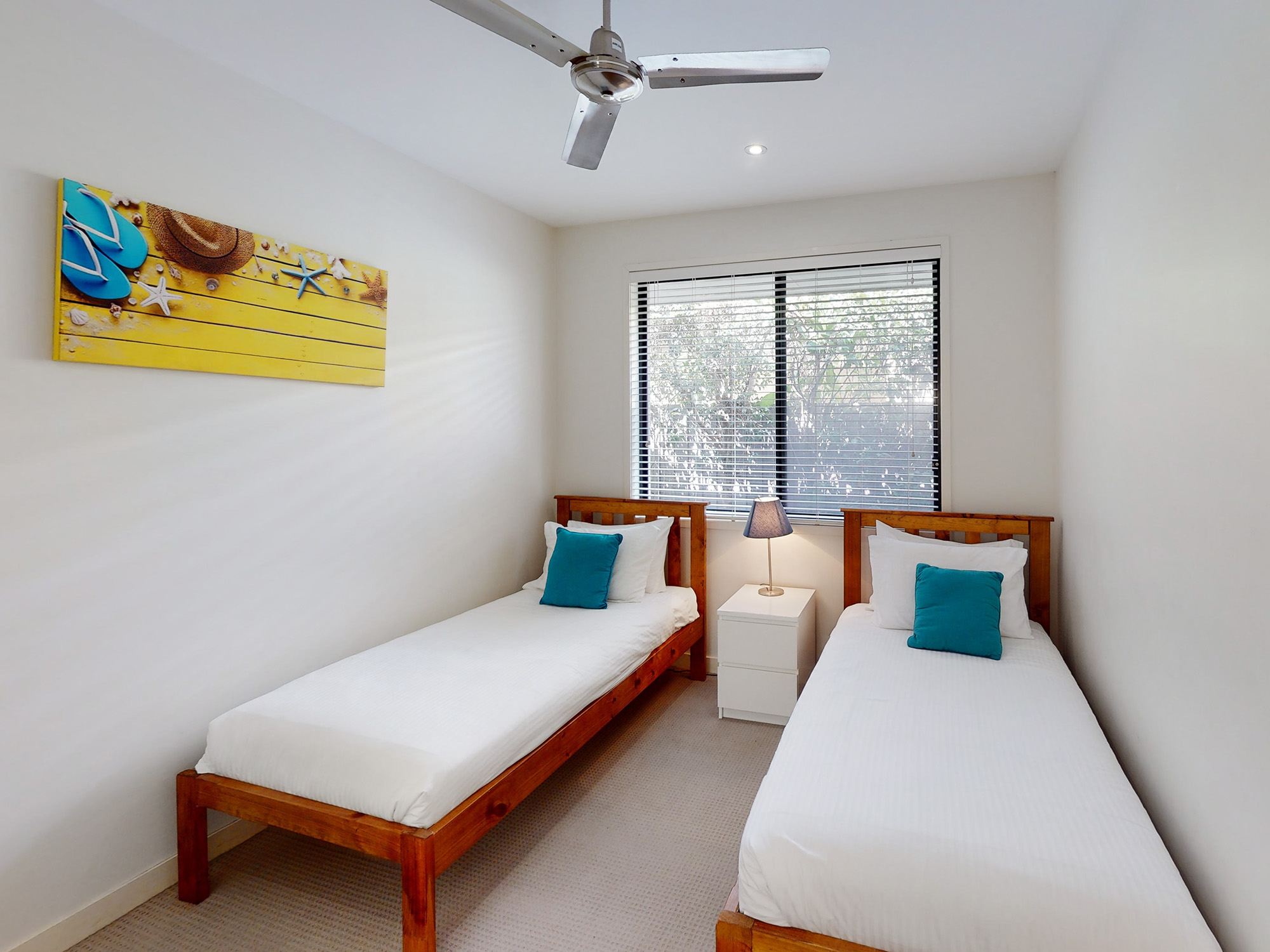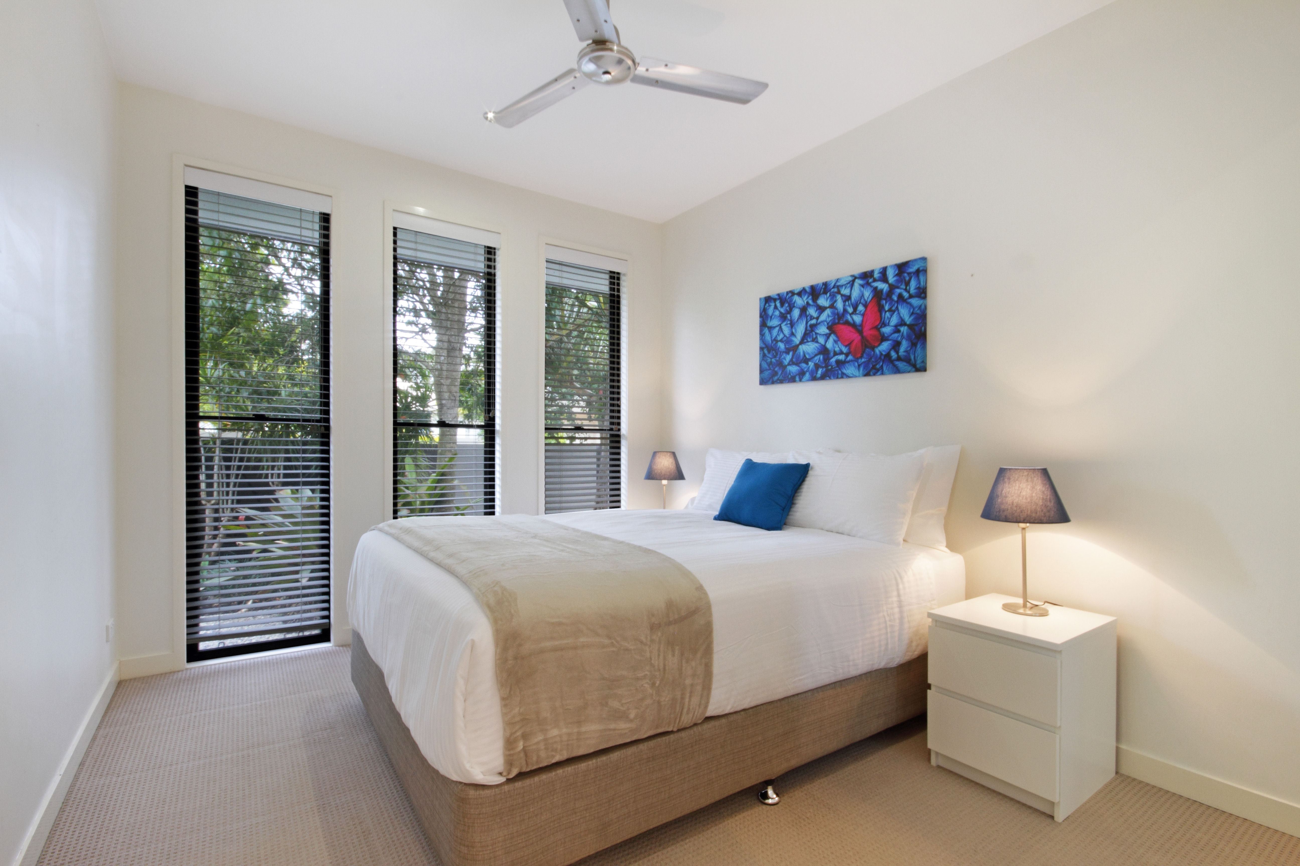 Bedrooms 2, 3, and 4 located at the back of the house have built-in robes, ceiling fans, and blinds