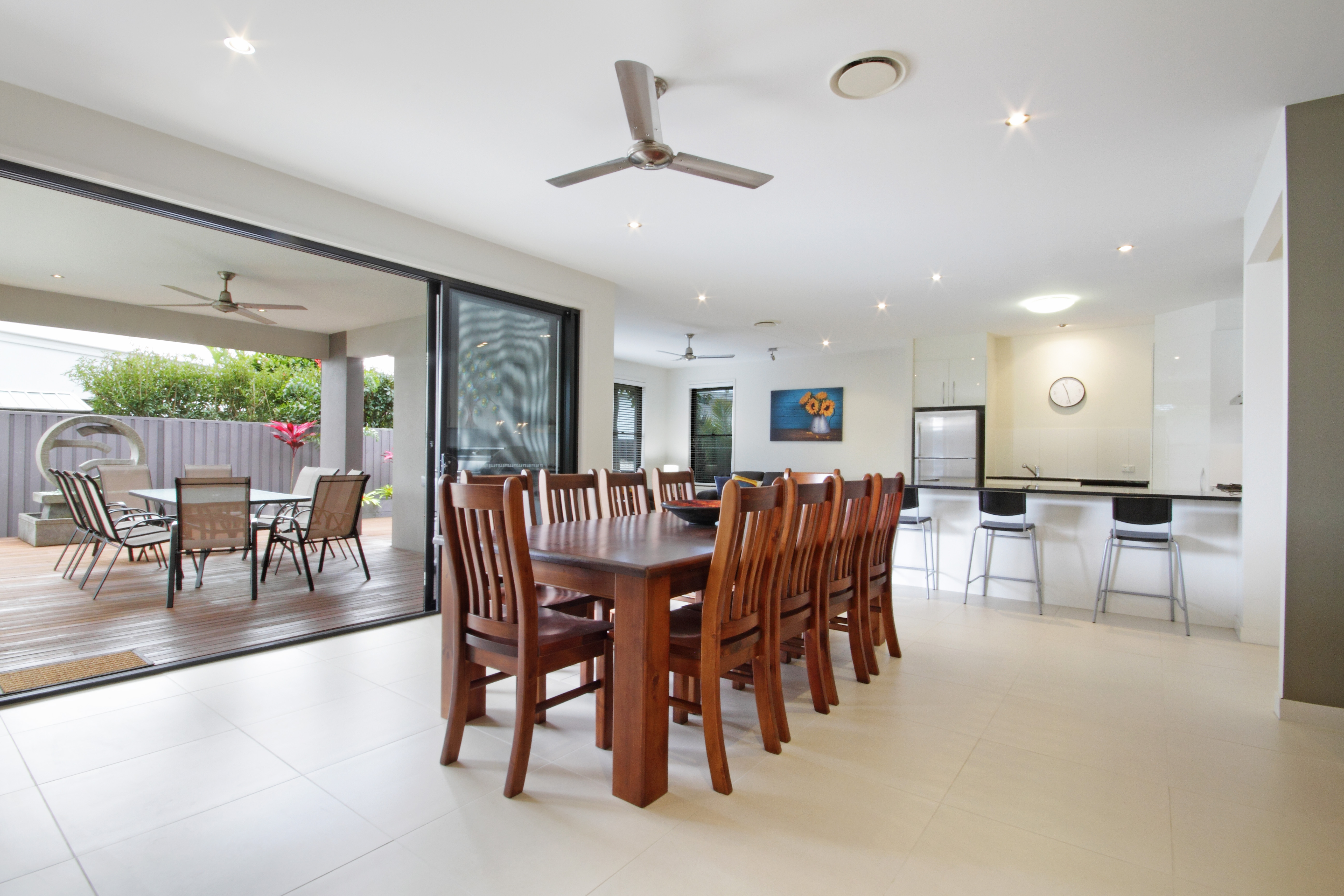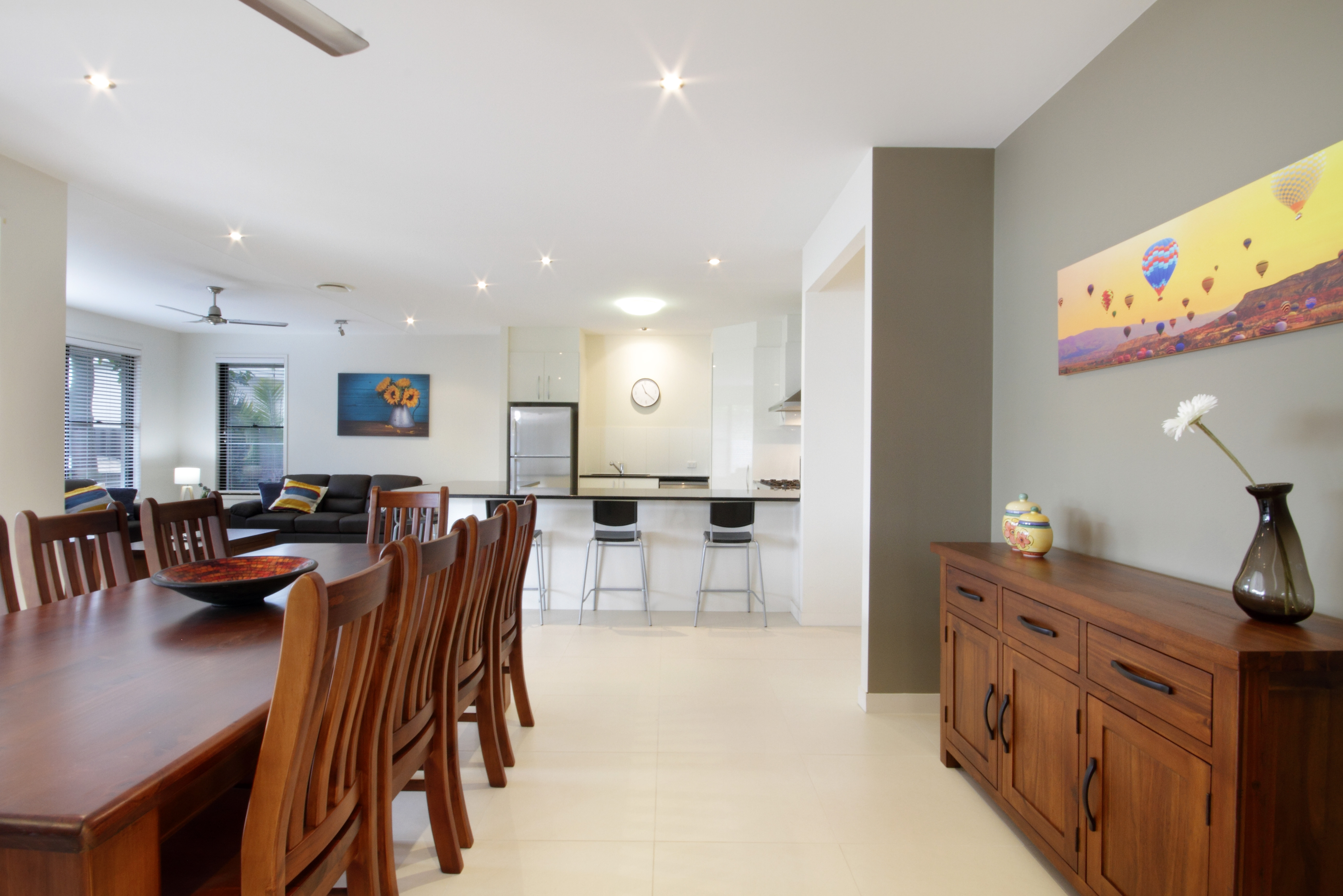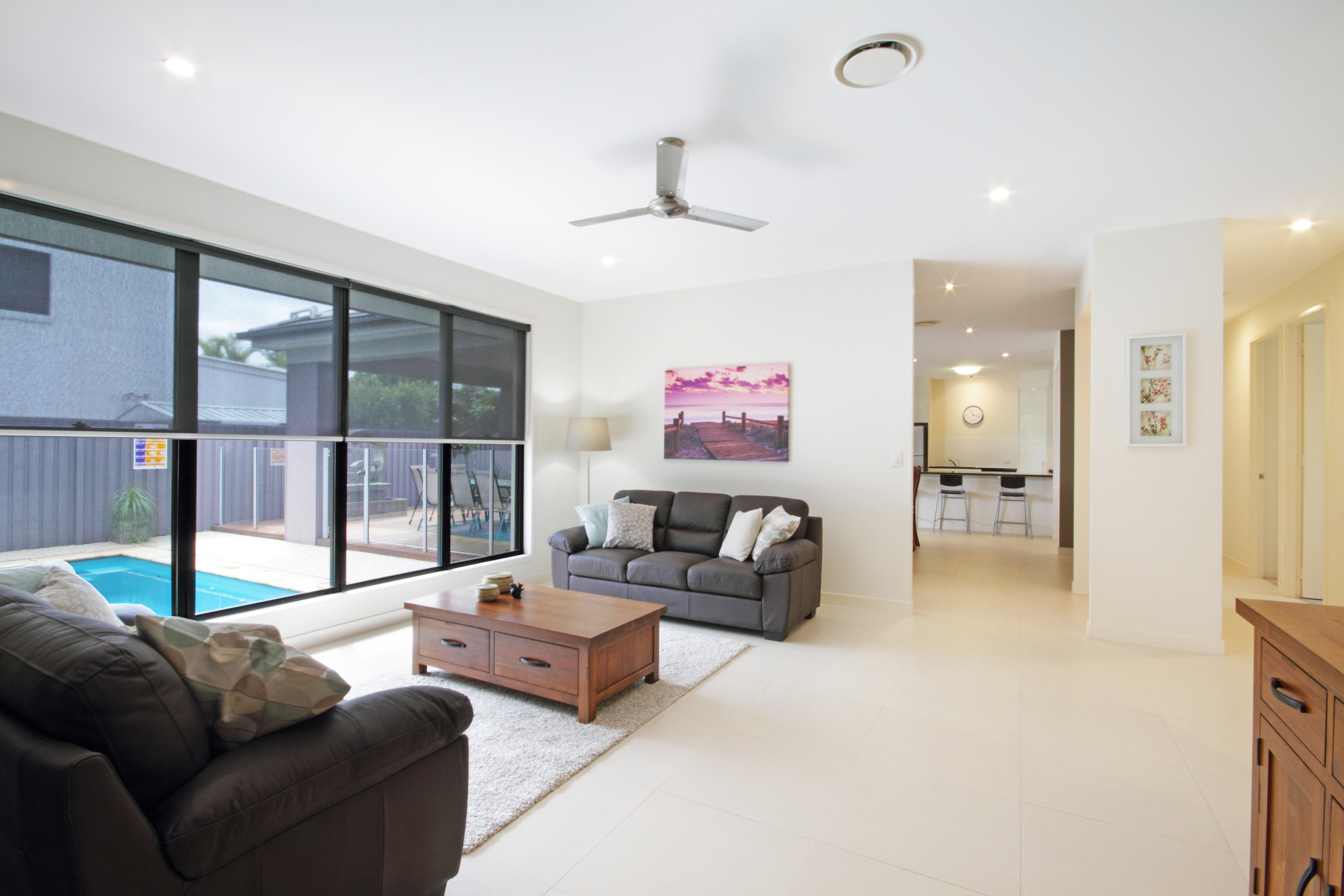 This modern and contemporary home features 5 spacious bedrooms, making it perfect for families or groups of friends. All five bedrooms (Including the master) have ceiling fans, blinds, generous storage and air-con. The master bedroom also boasts a modern ensuite and walk in robe.