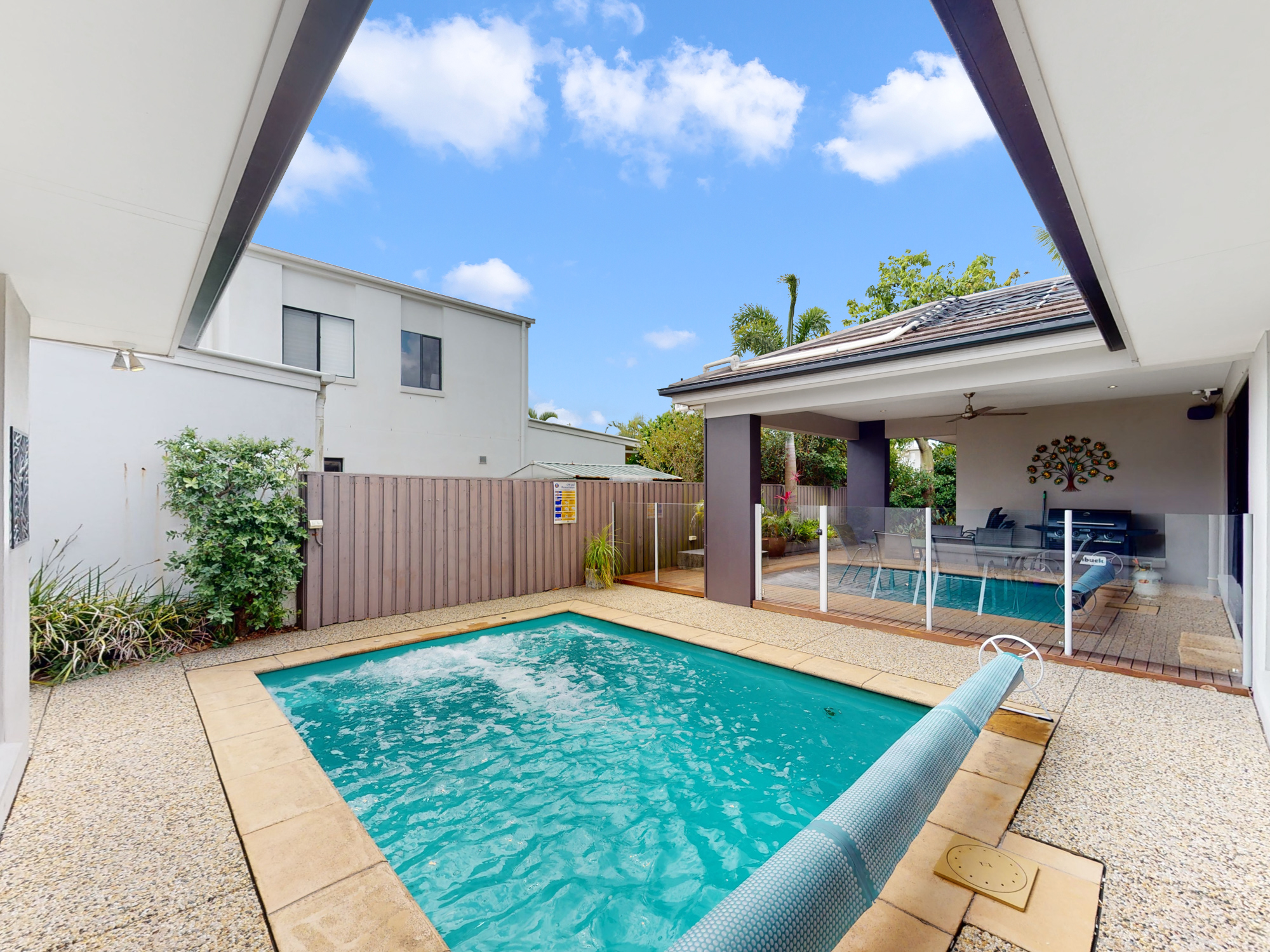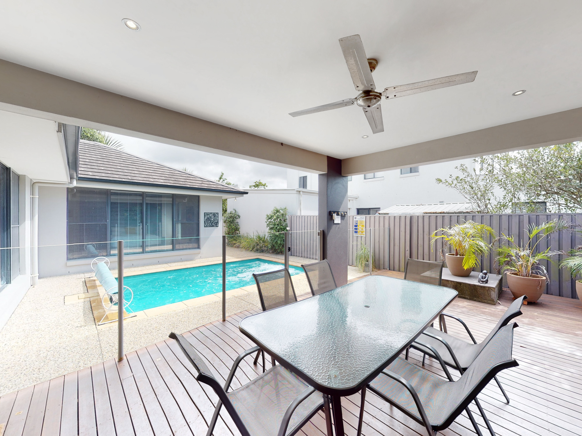 In-ground pool with a covered alfresco and a deck
