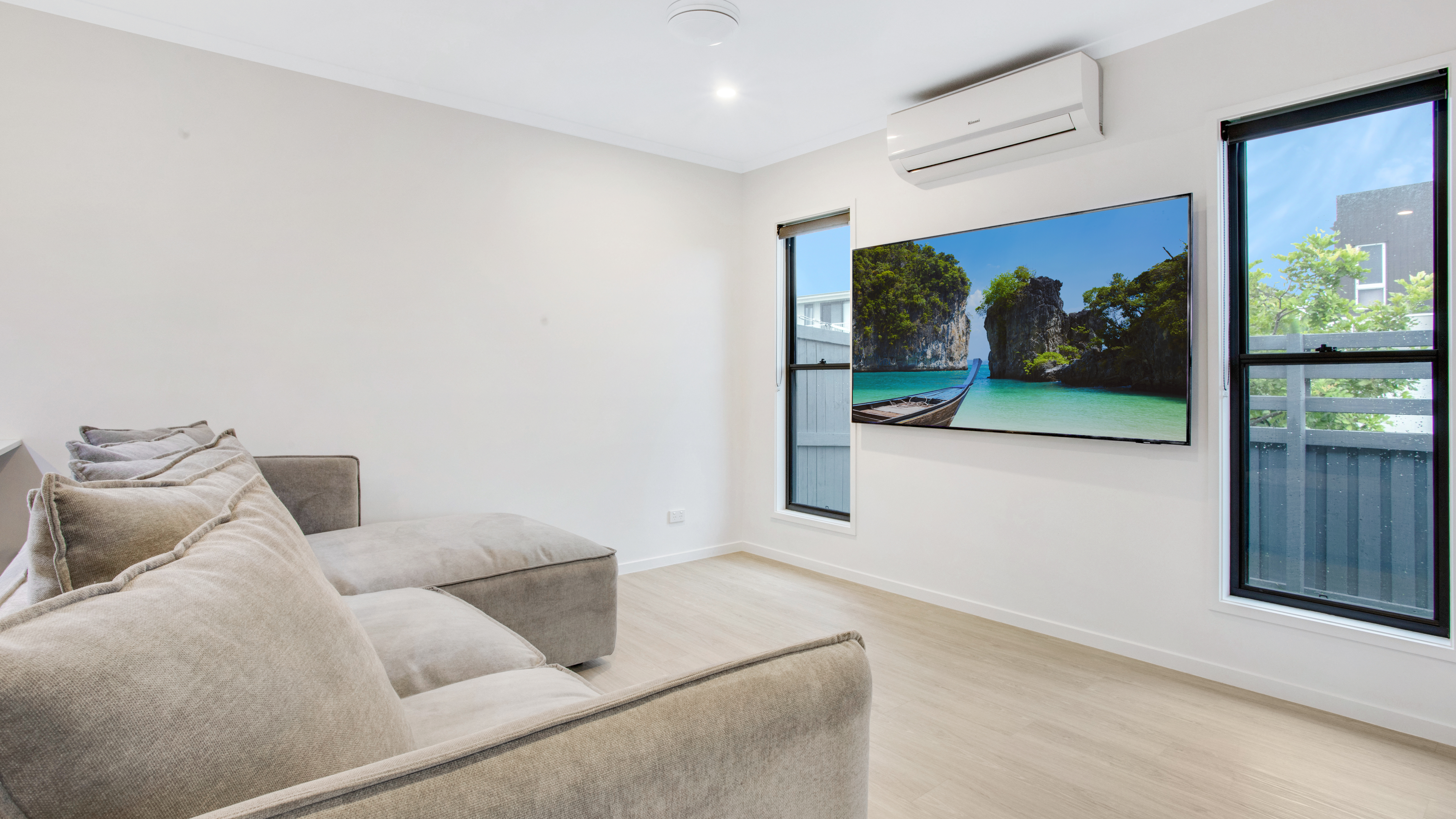 Window Treatments: Roller blinds adorn the windows, offering privacy, light control, and a touch of contemporary elegance.