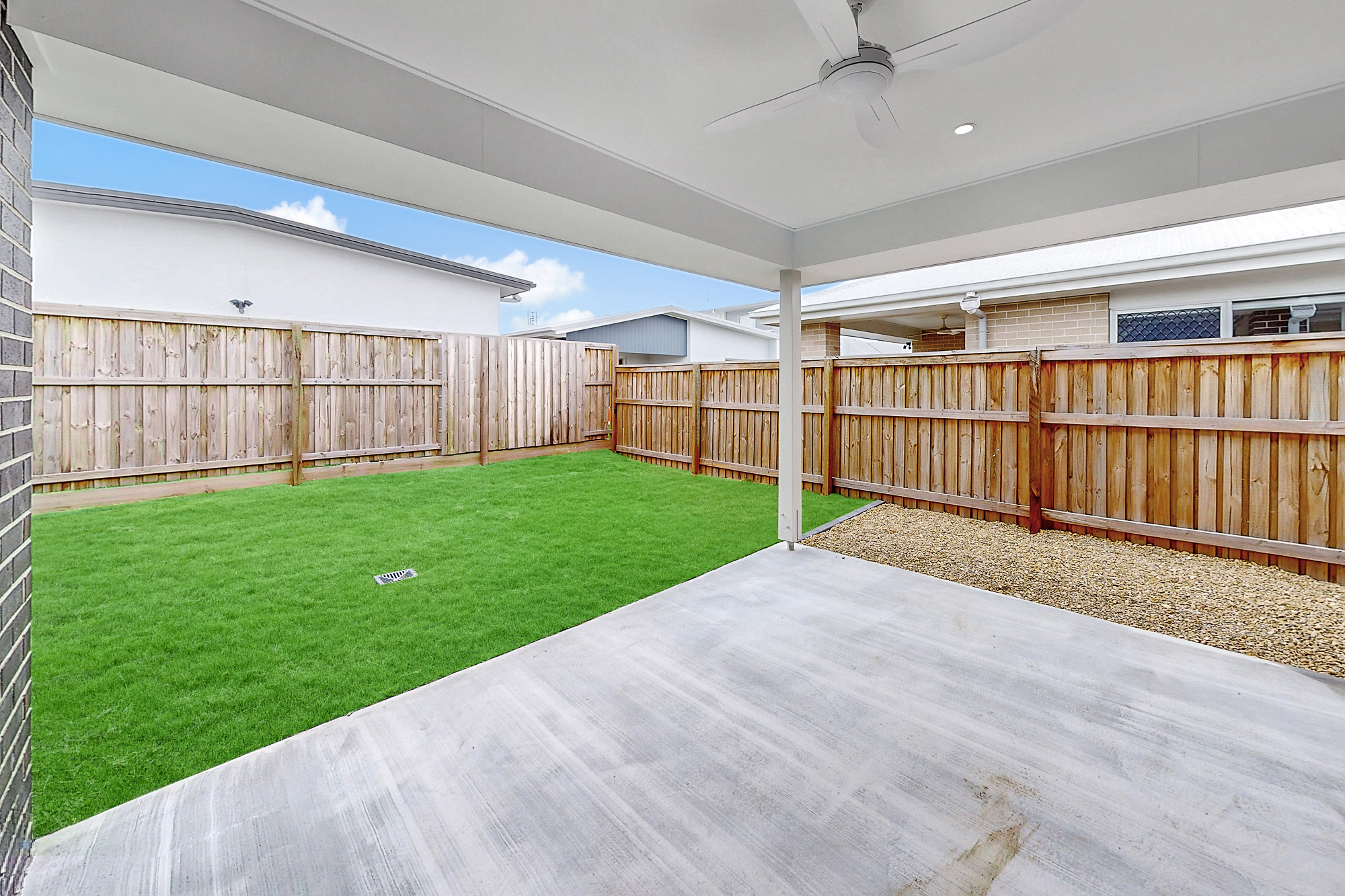 The heart of the home is an open-plan living area that combines a large L-shaped dining and kitchen space, which opens out to a covered terrace complete with a ceiling fan—perfect for outdoor relaxation.