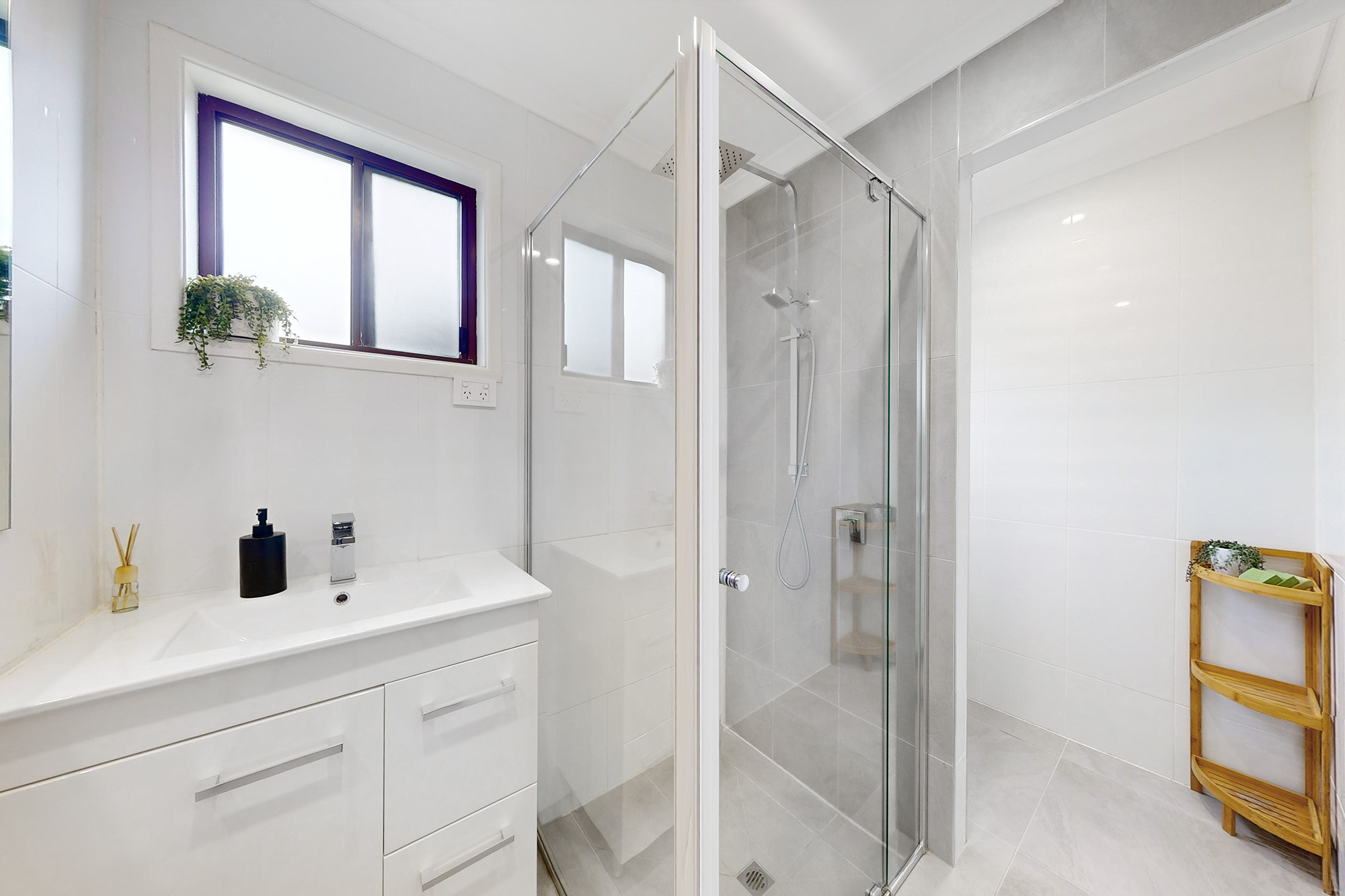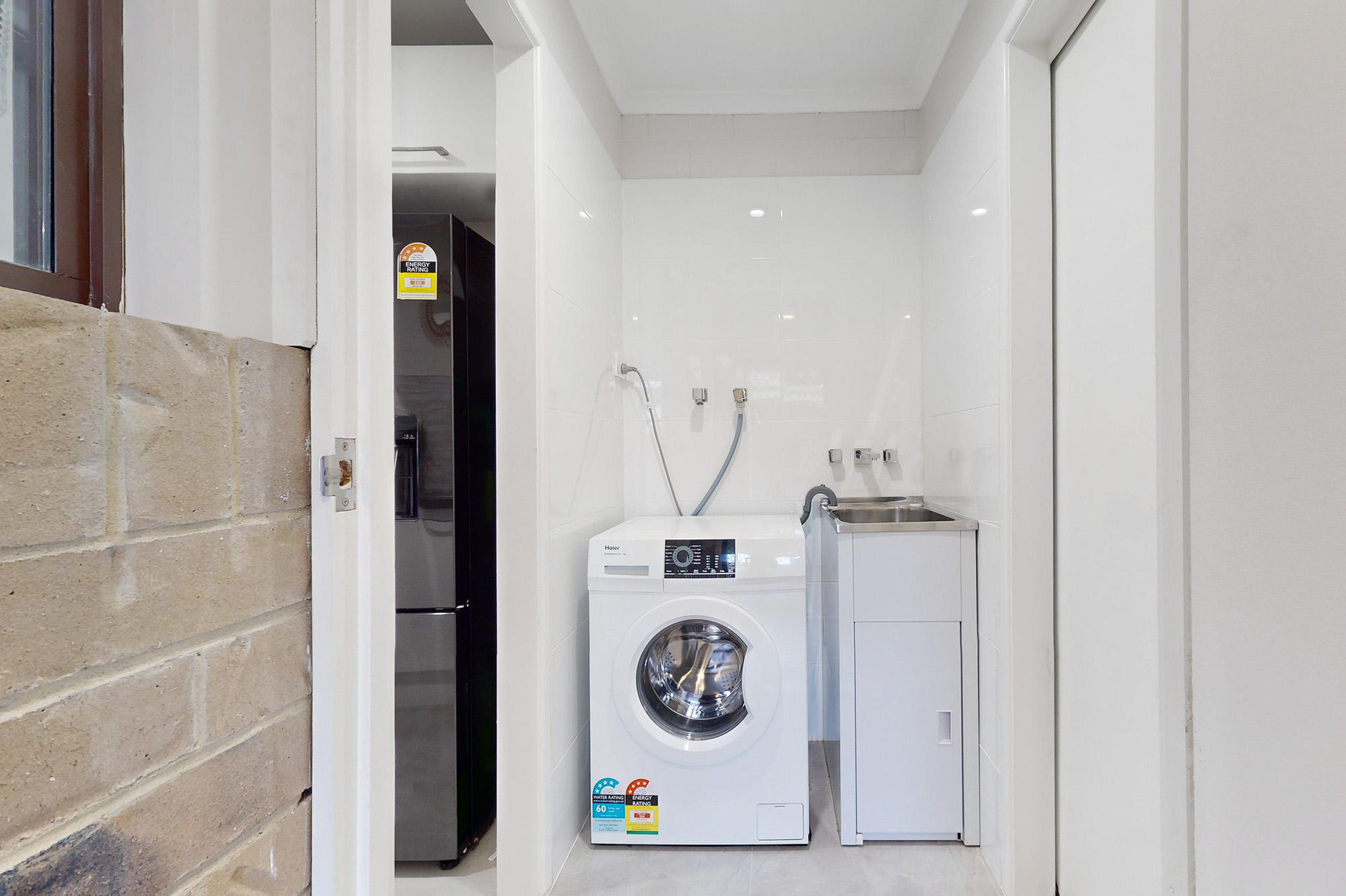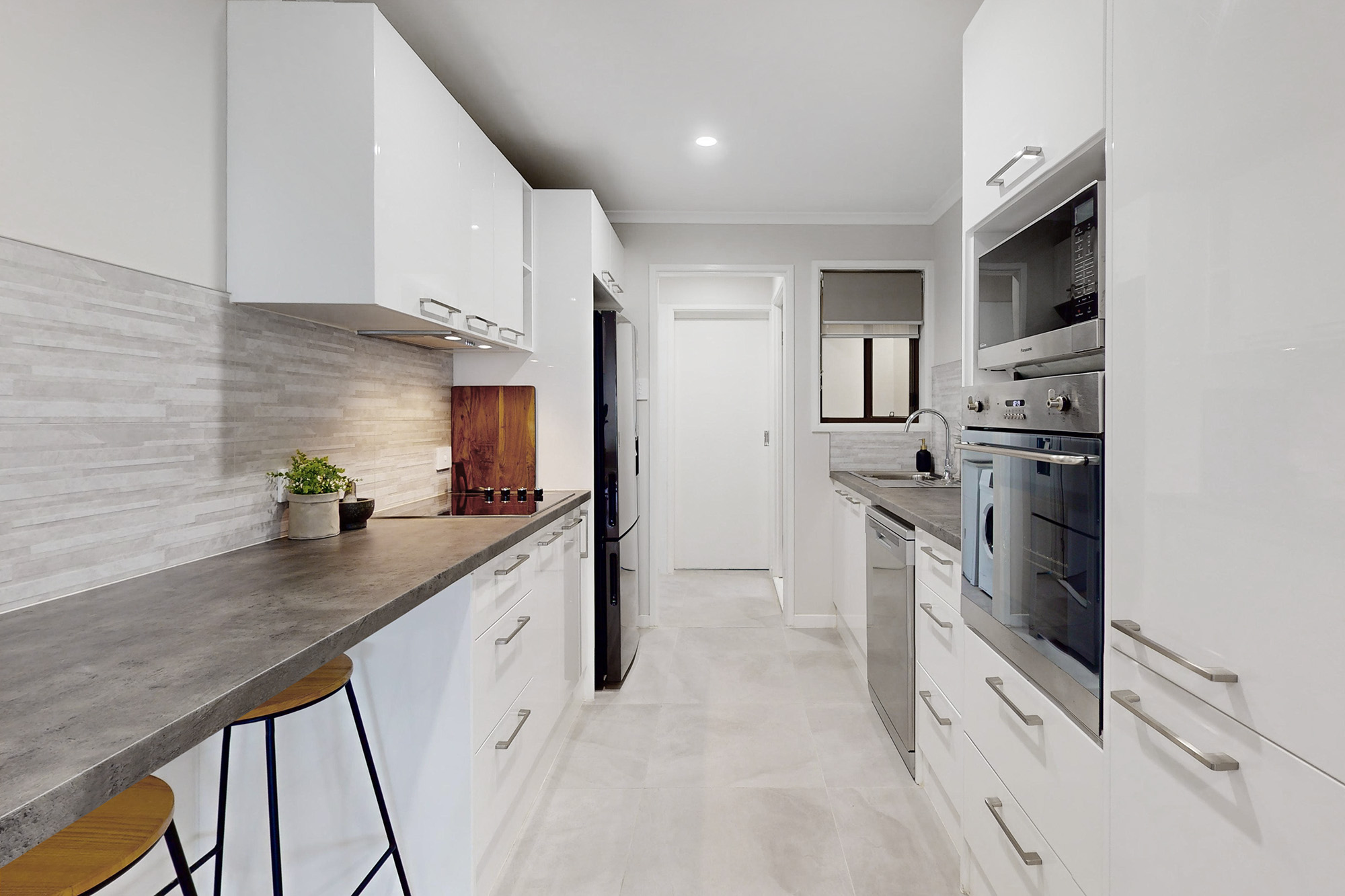 The beautifully presented interior showcases clean, modern lines with a chic grey and white color palette, complemented by tiled living areas and a cozy carpeted bedroom. The bathroom is sleek and functional, featuring a shower and toilet. A well-appointed laundry adds to the practicality of the home.