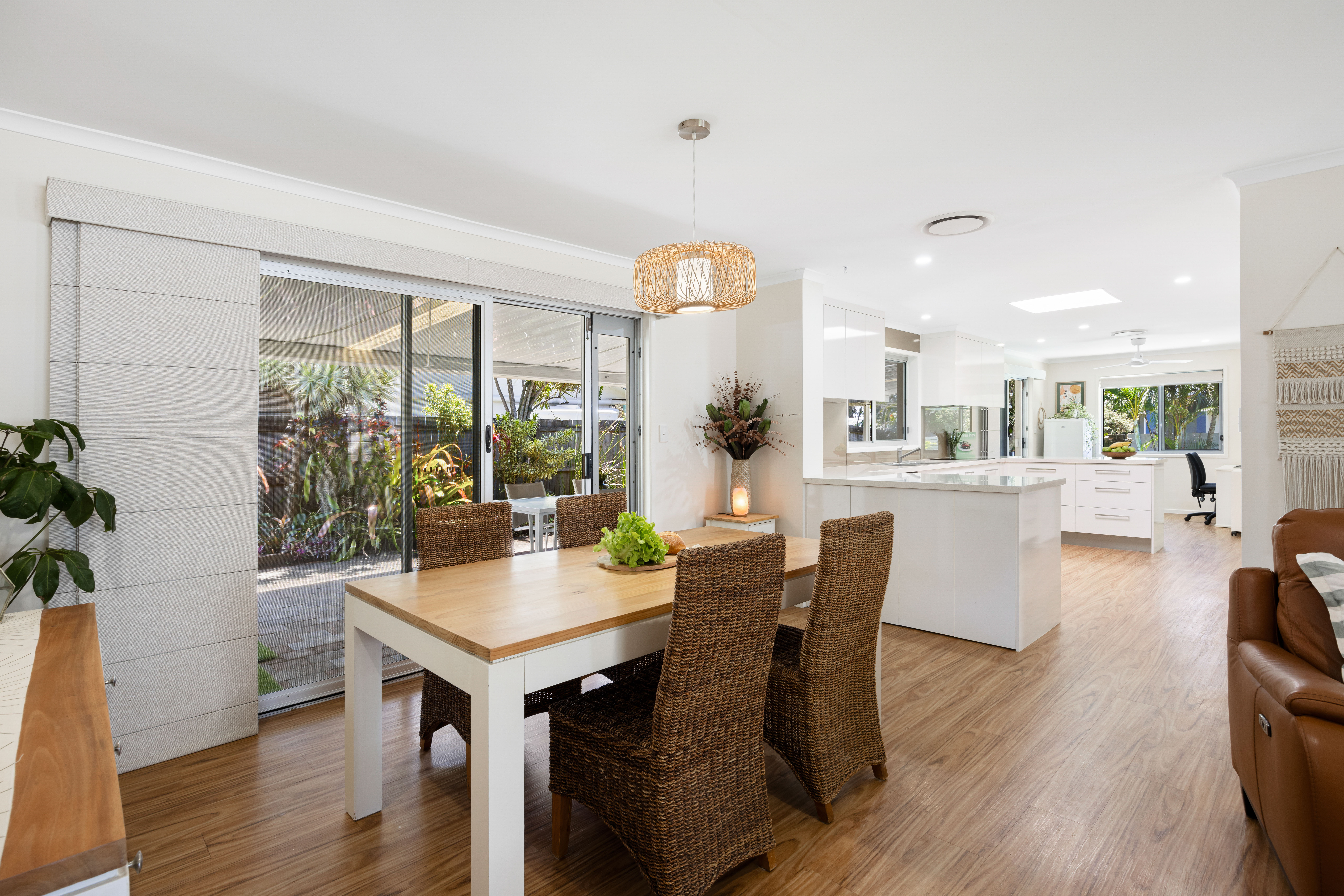 The open-plan living area is filled with natural light, creating a bright and inviting atmosphere throughout the home. The recently renovated kitchen is equipped with modern appliances and plenty of storage, making meal preparation a breeze. The living and dining areas are spacious and flow seamlessly into the outdoor entertainment space, perfect for both relaxing and entertaining guests.