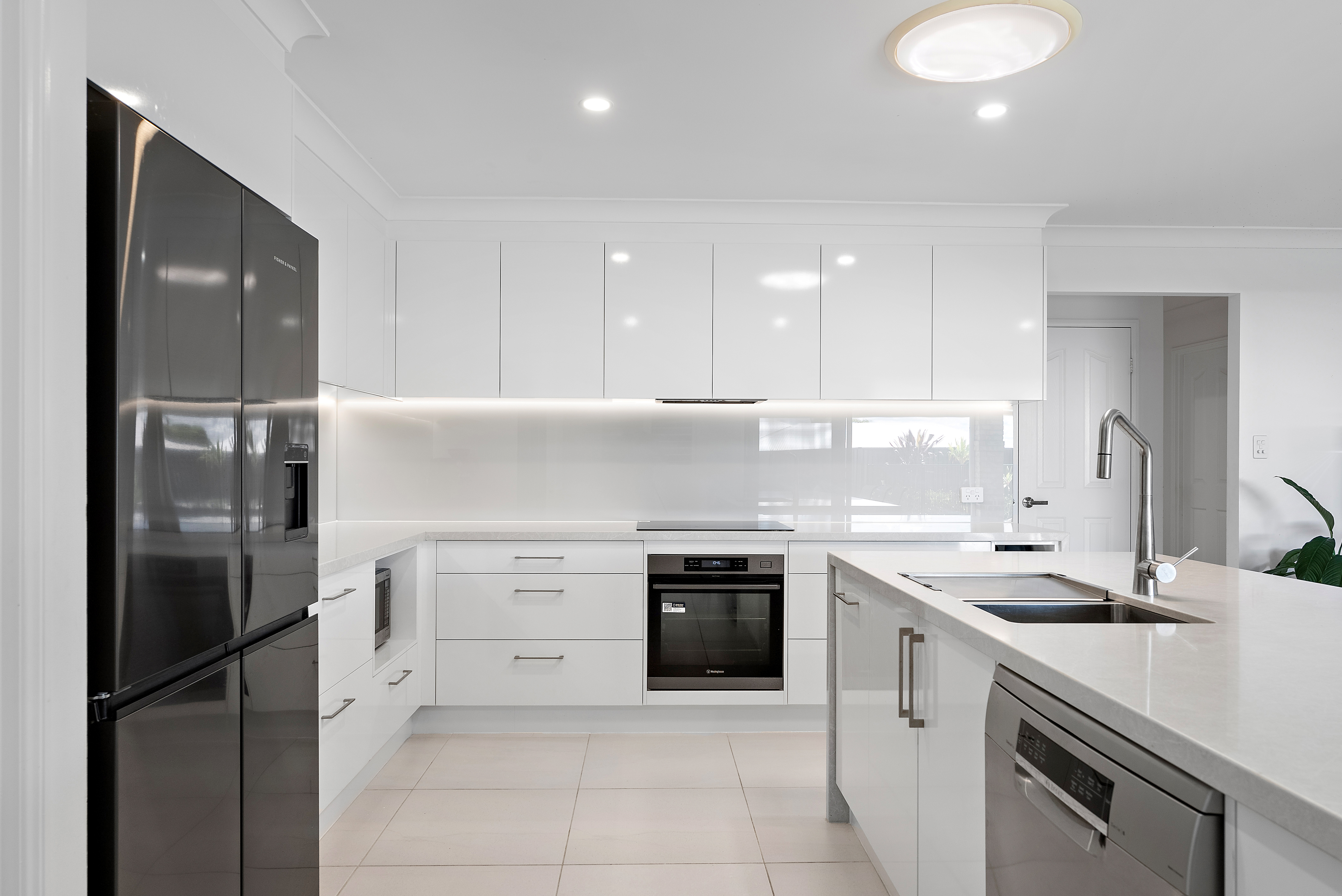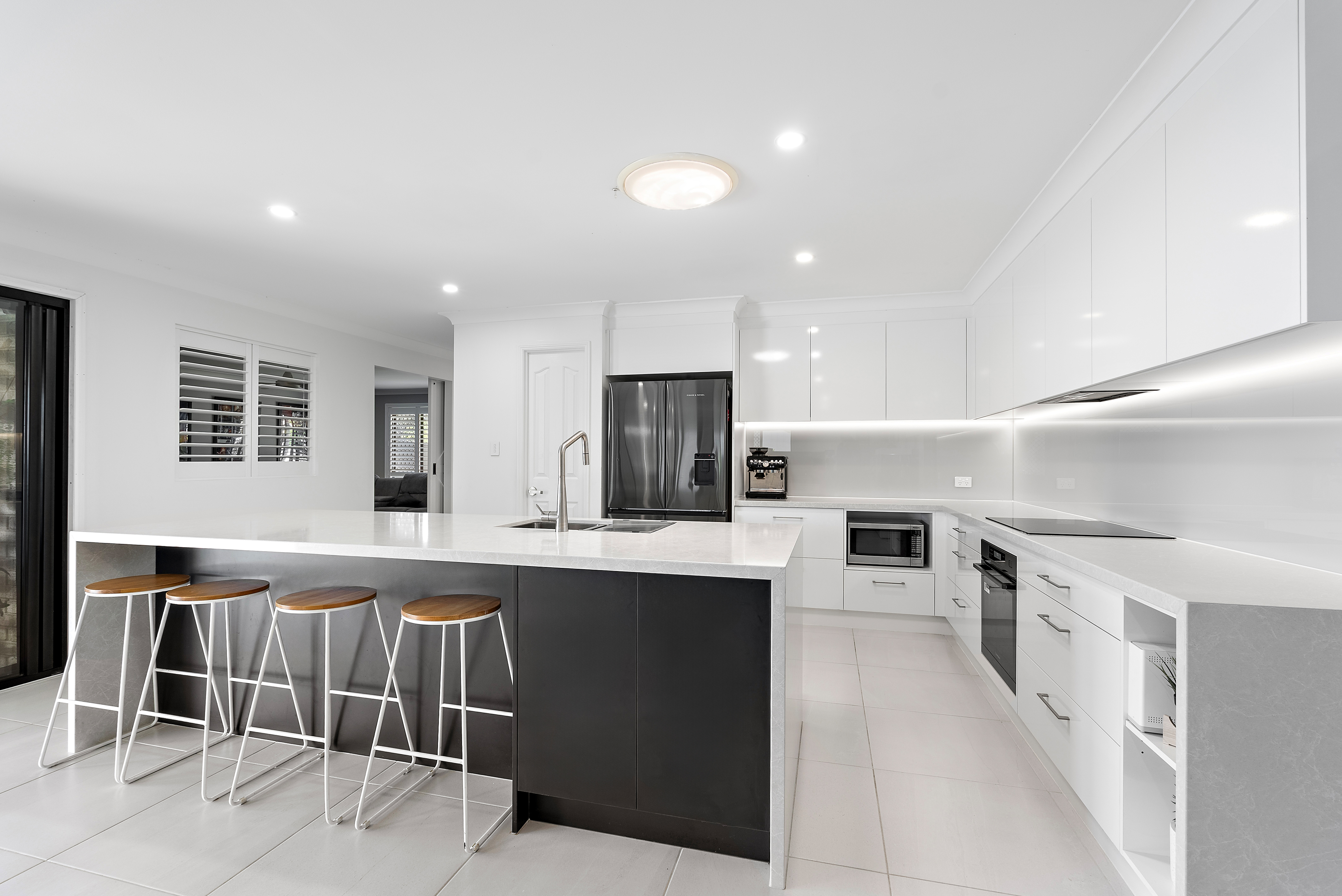 The heart of the home is the designer kitchen, boasting stone benchtops with waterfall edges, a large breakfast bar, walk-in pantry, dishwasher and quality appliances – perfect for everyday living and entertaining alike. Large glass sliding doors seamlessly connect the main living space to the expansive covered alfresco area, where you’ll find your own private outdoor oasis.