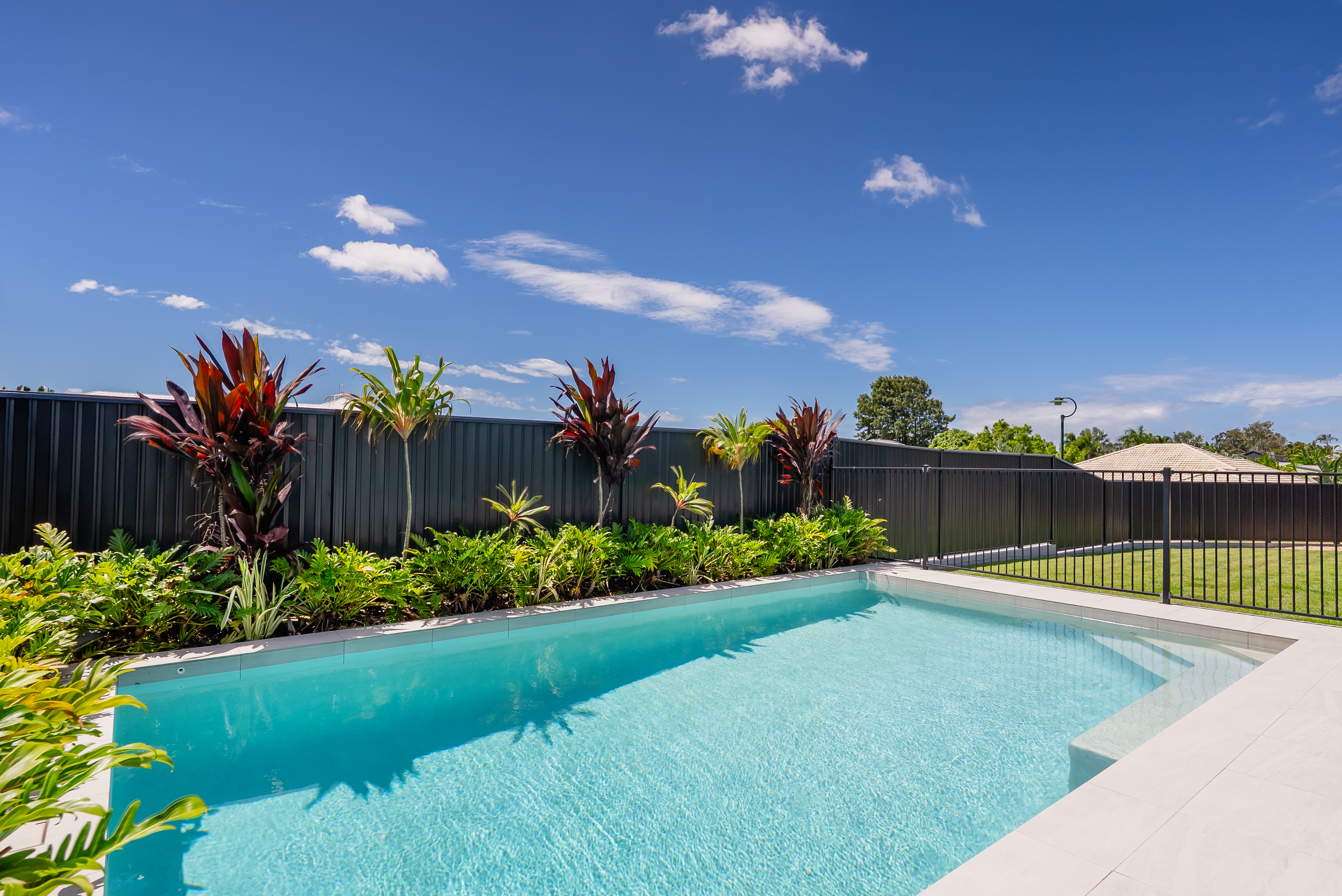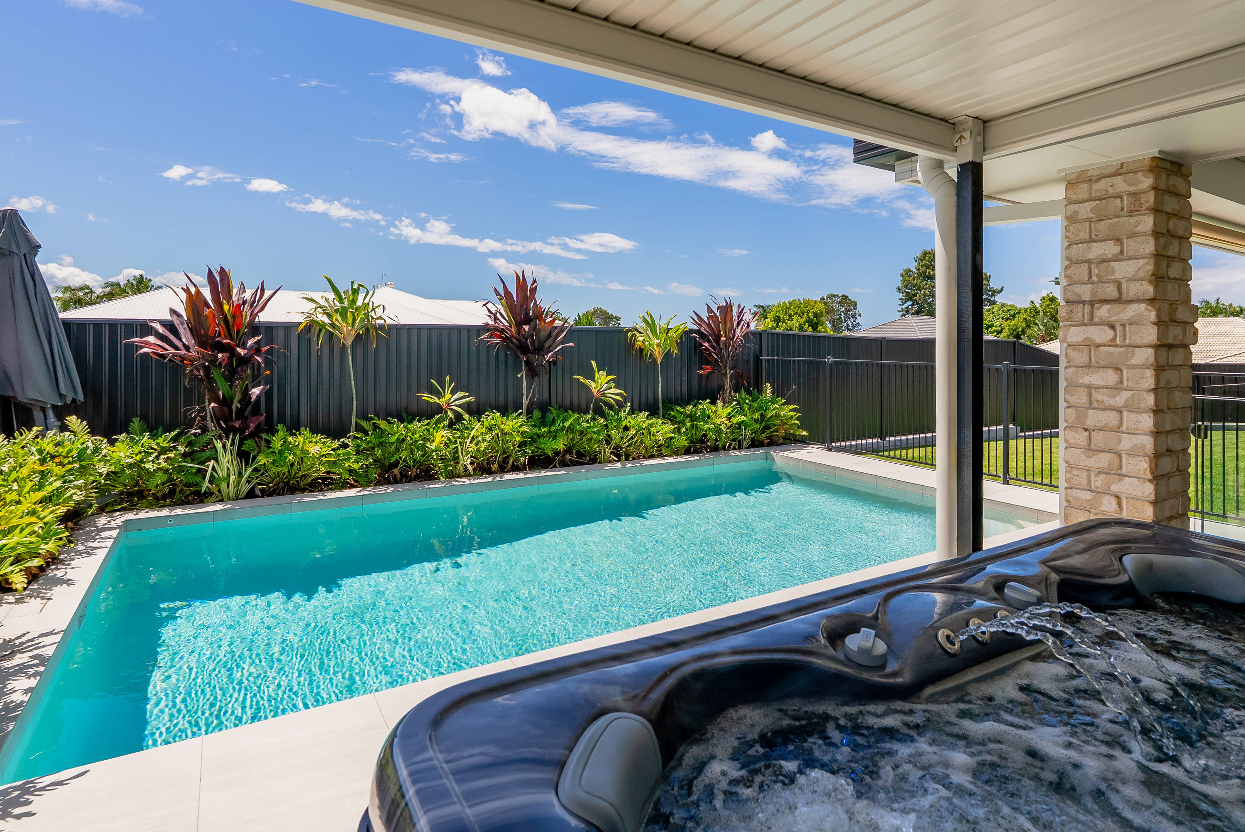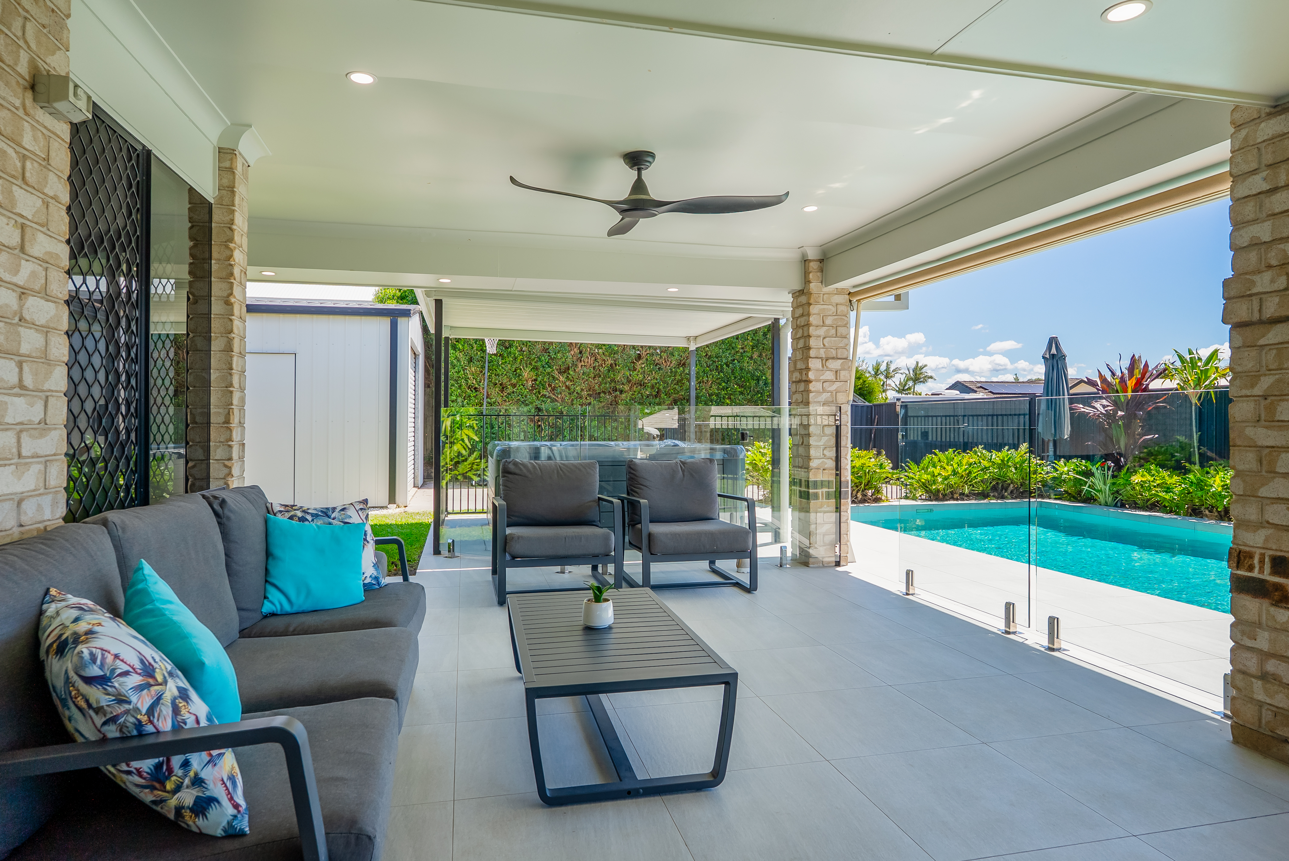 The master suite is privately positioned at the rear of the home and offers peaceful views over the pool and spa. It also features a walk-in robe and luxurious ensuite with double vanity, floor-to-ceiling tiles and a spacious shower. Three additional bedrooms all include built-in robes and ceiling fans, while the main bathroom is well-appointed with a bath, floating vanity and floor-to-ceiling tiles.