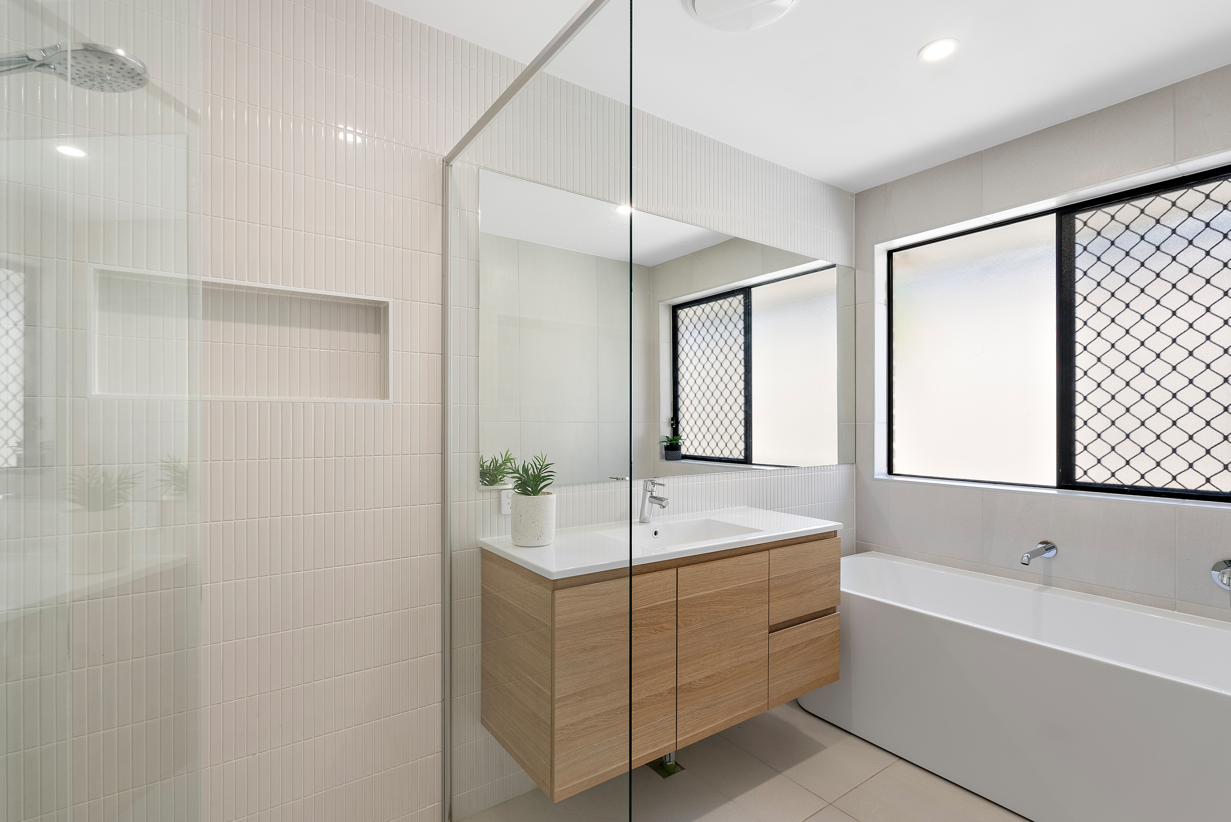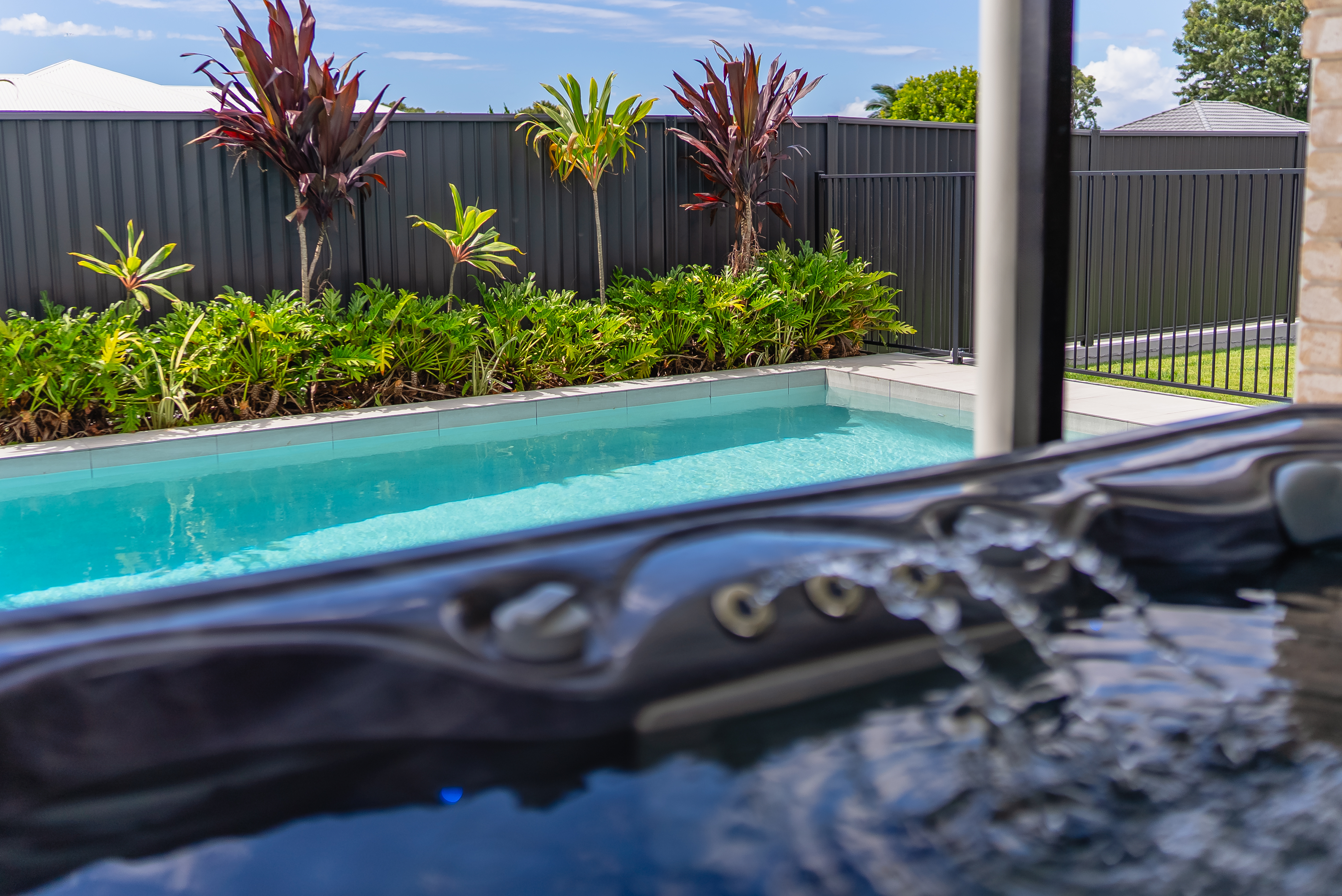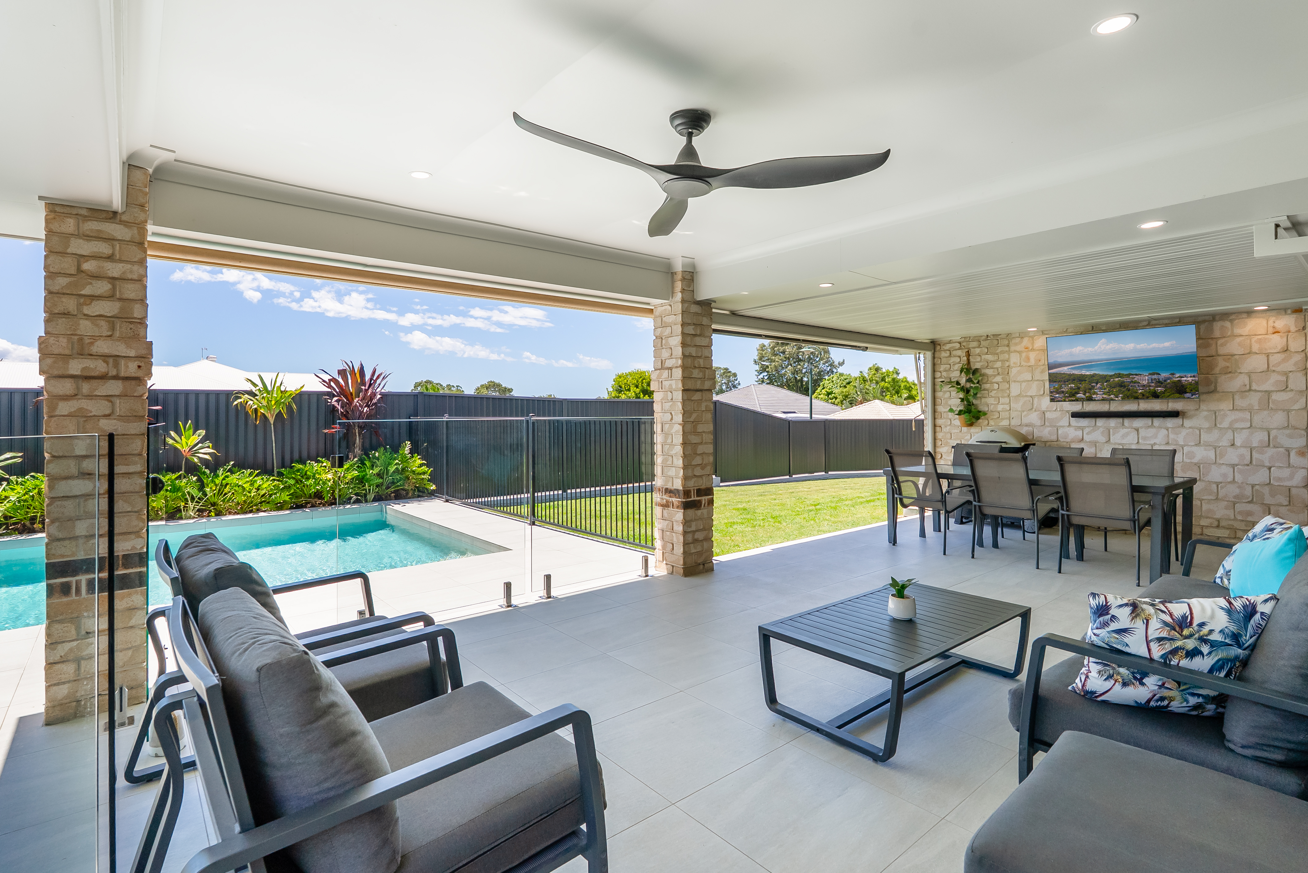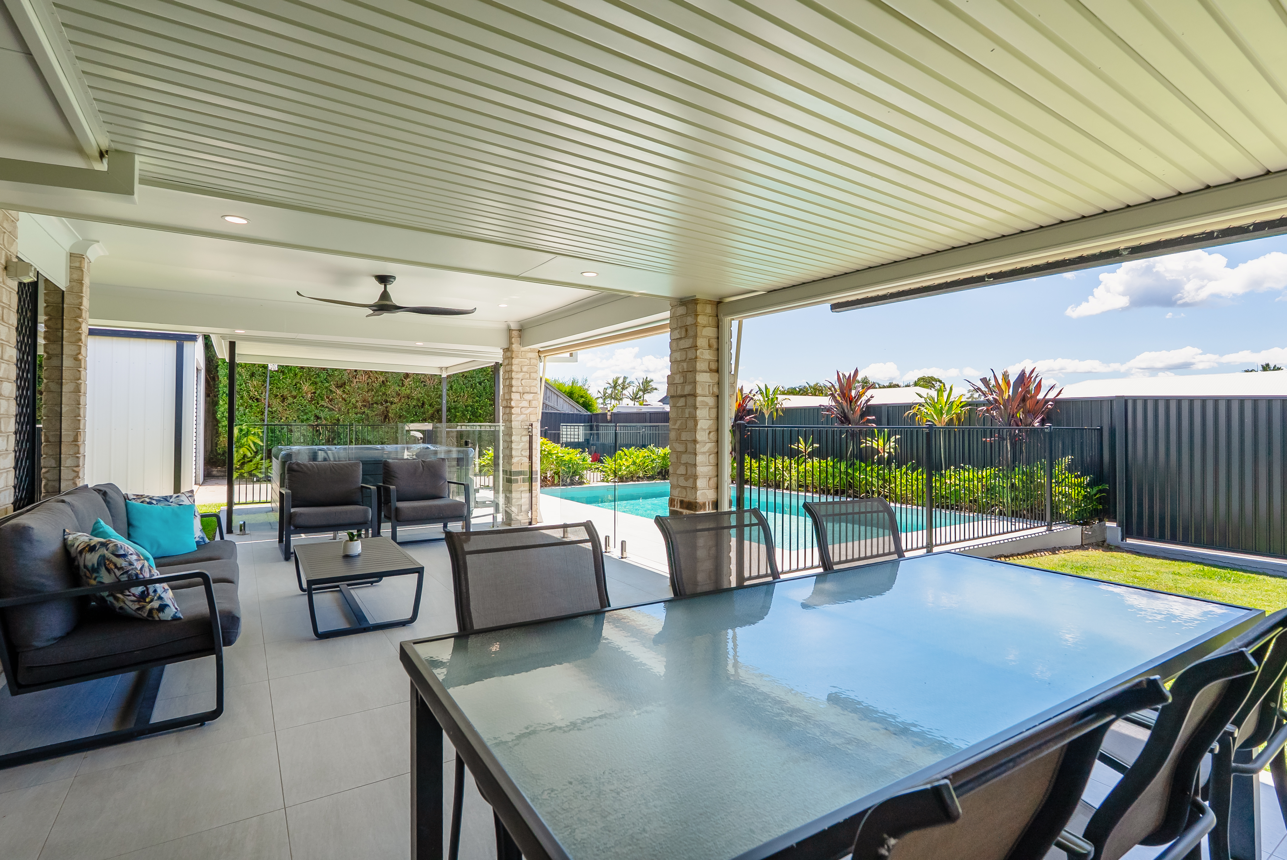 The master suite is privately positioned at the rear of the home and offers peaceful views over the pool and spa. It also features a walk-in robe and luxurious ensuite with double vanity, floor-to-ceiling tiles and a spacious shower. Three additional bedrooms all include built-in robes and ceiling fans, while the main bathroom is well-appointed with a bath, floating vanity and floor-to-ceiling tiles.