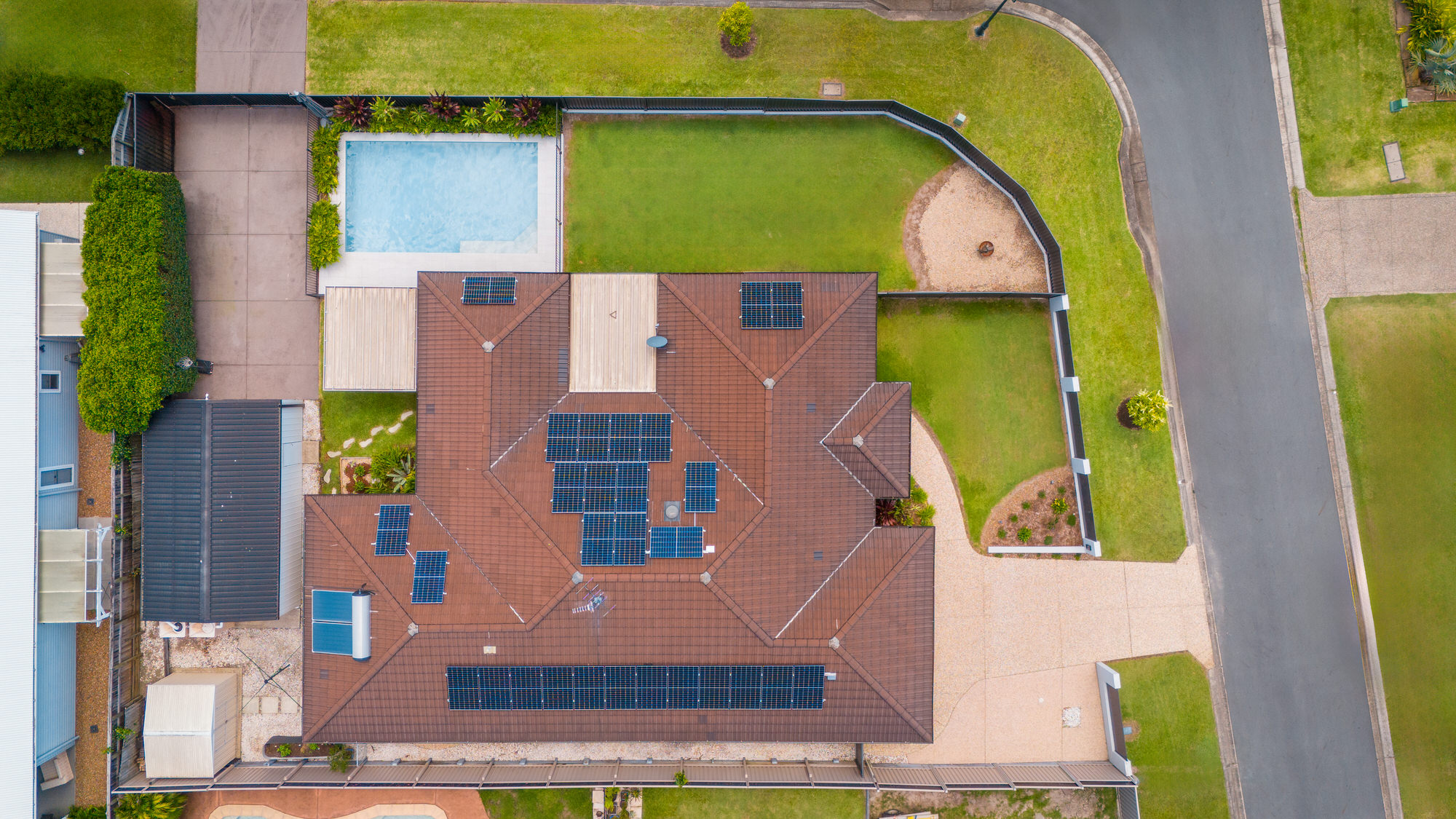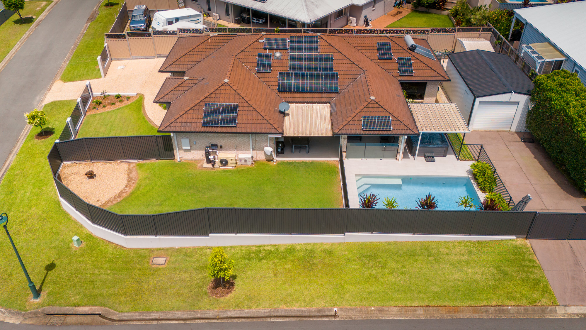 Additional highlights include air conditioning to the media room, master and main living space, ceiling fans throughout, security screens, solar panels, a rainwater tank, and a large internal laundry with stone benchtops and outdoor access.