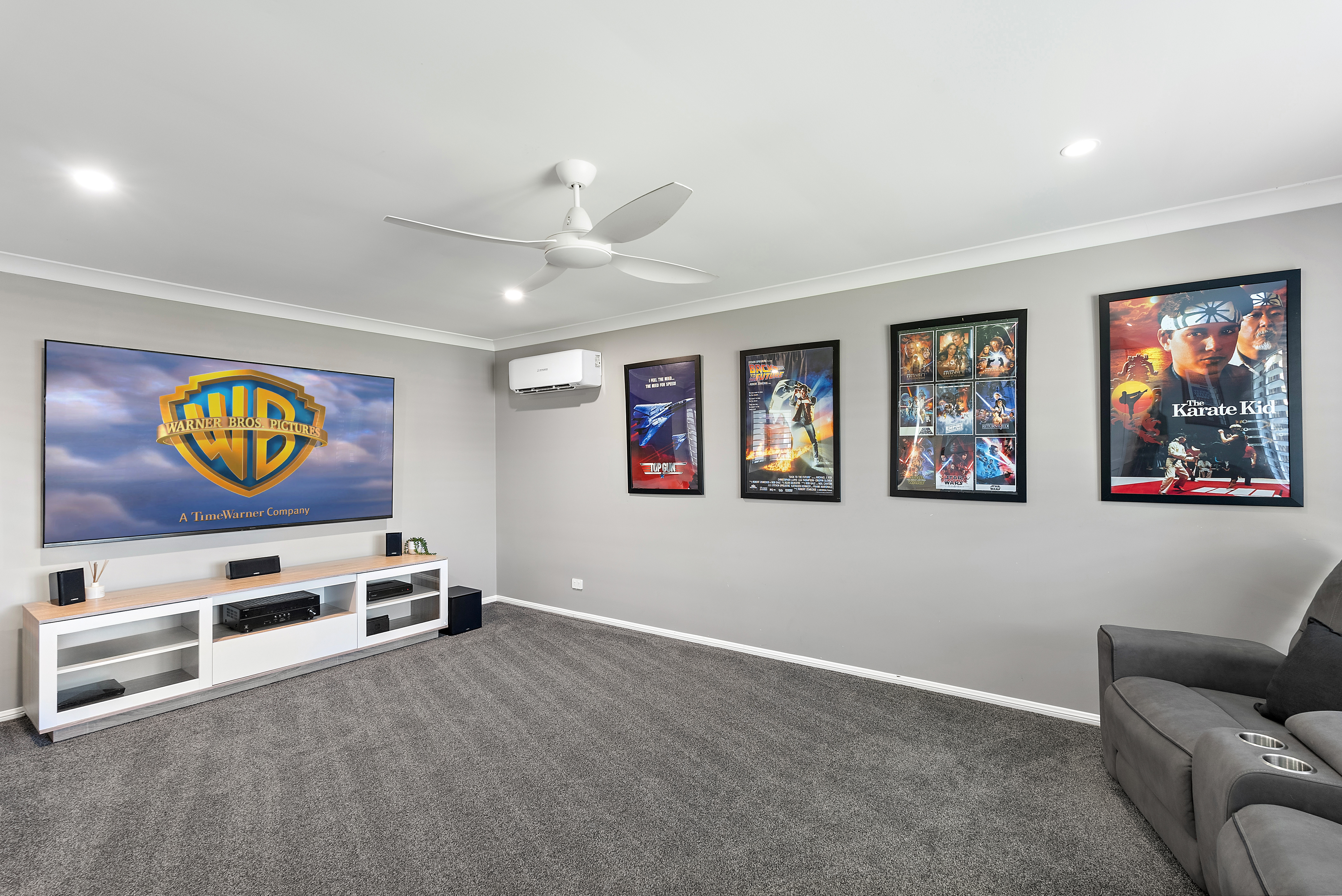 Inside, the home features two generous living zones – a spacious open-plan living, kitchen and dining area, and a separate carpeted media room complete with charming barn door, plantation shutters, ceiling fan and air conditioning.