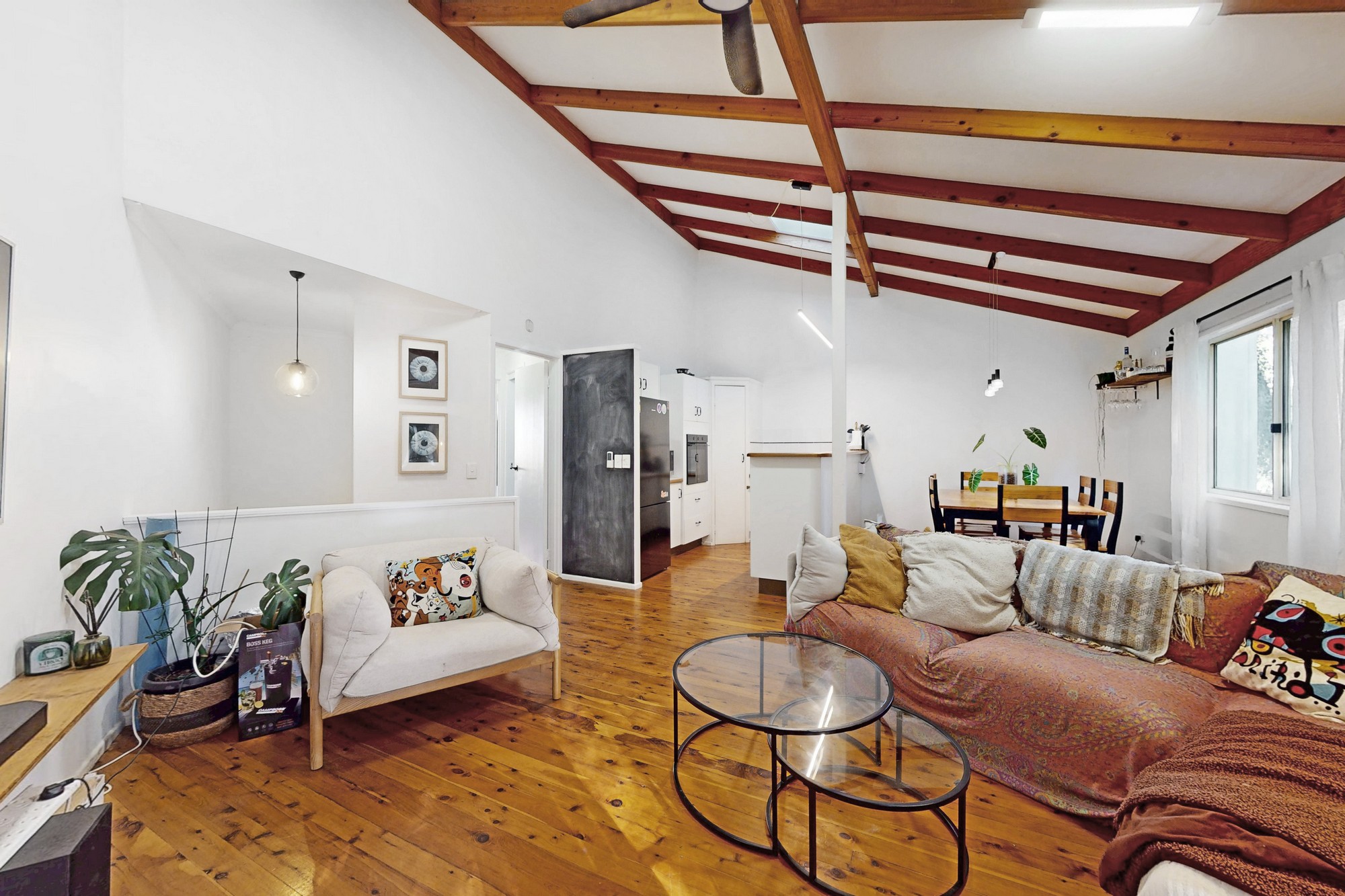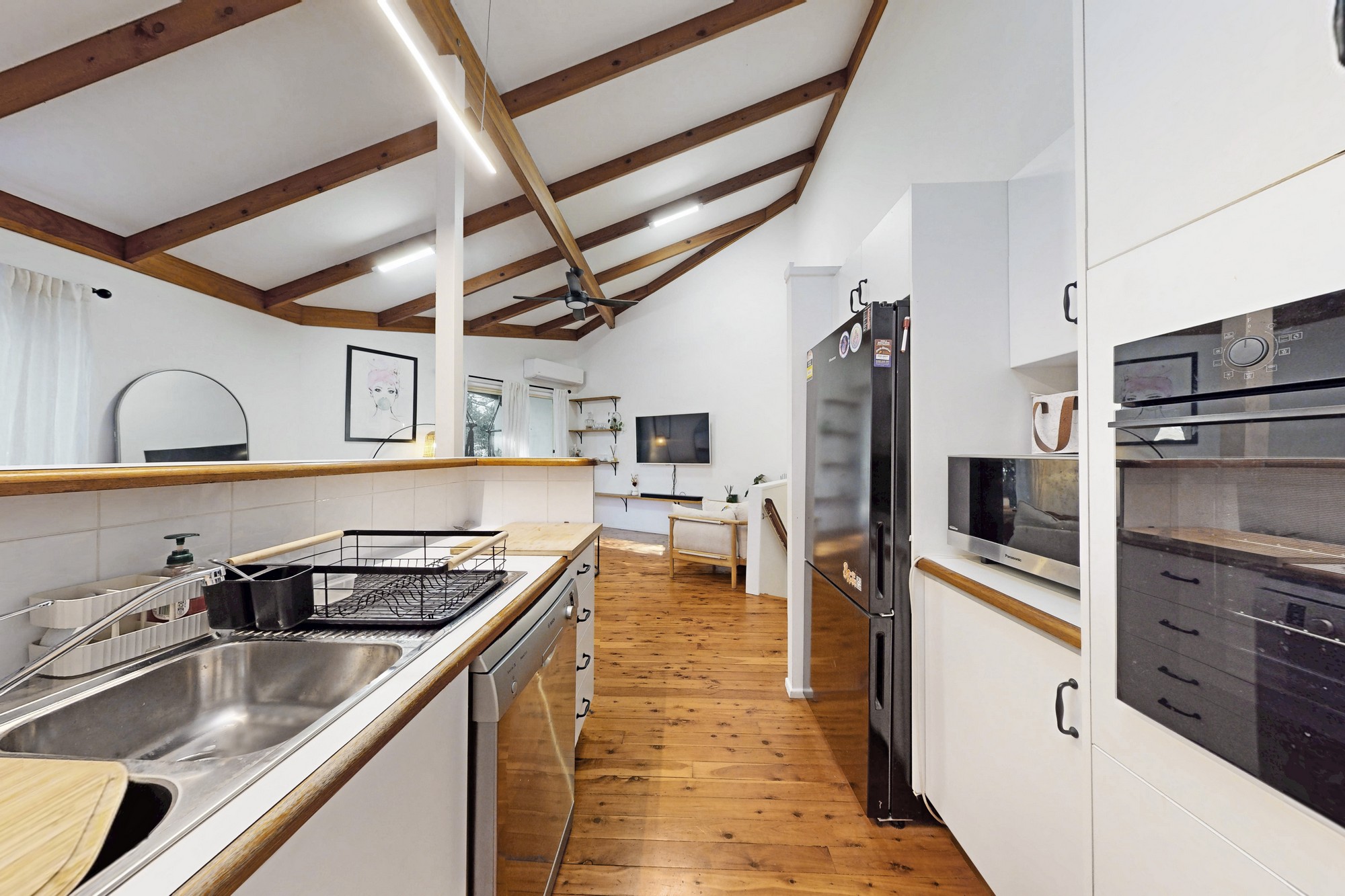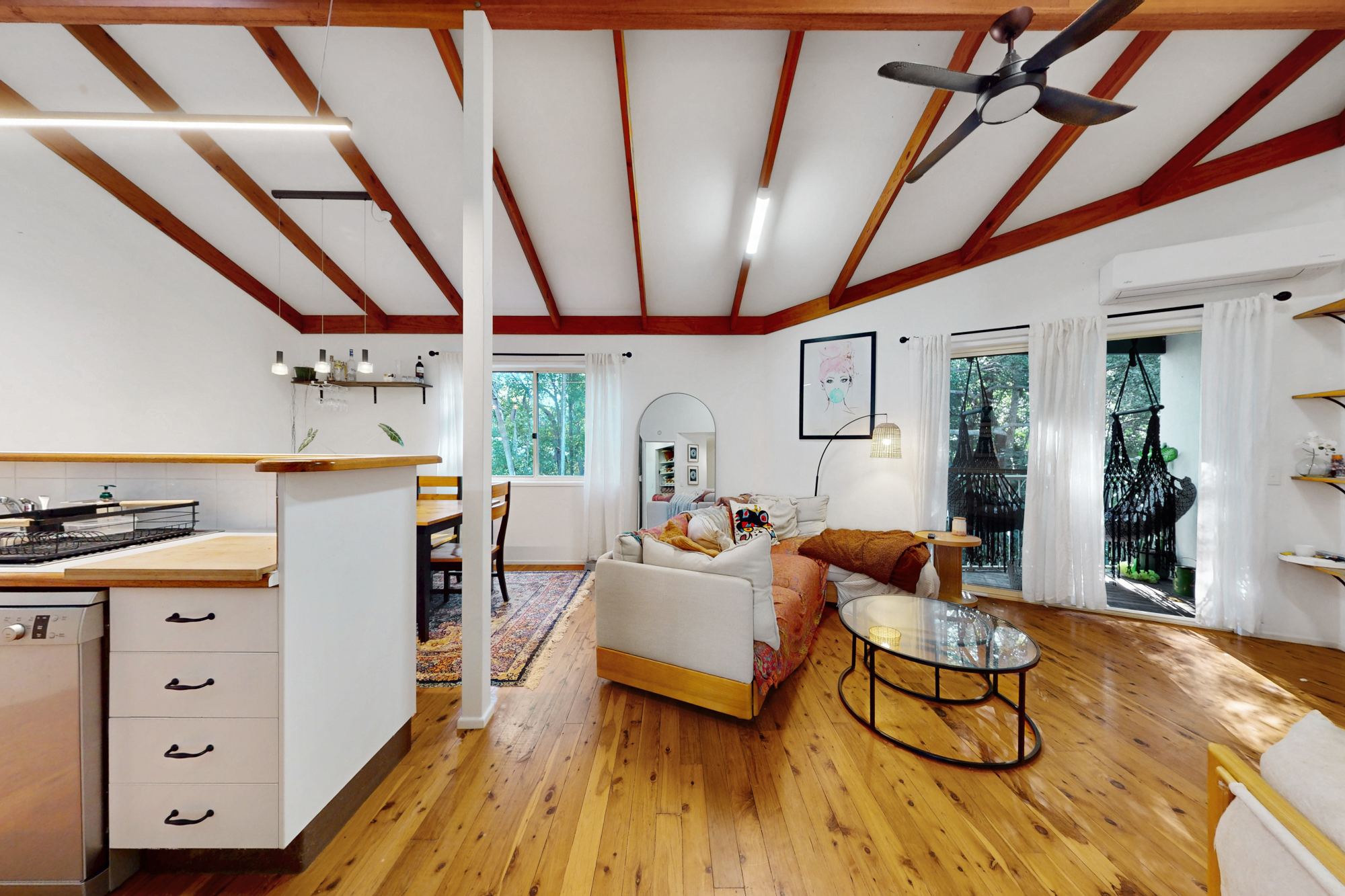Upstairs, enjoy open-plan living with soaring raked ceilings, exposed beams, and polished timber floors. The light-filled kitchen and dining area open onto a balcony with tranquil bushland views — ideal for relaxing or entertaining.