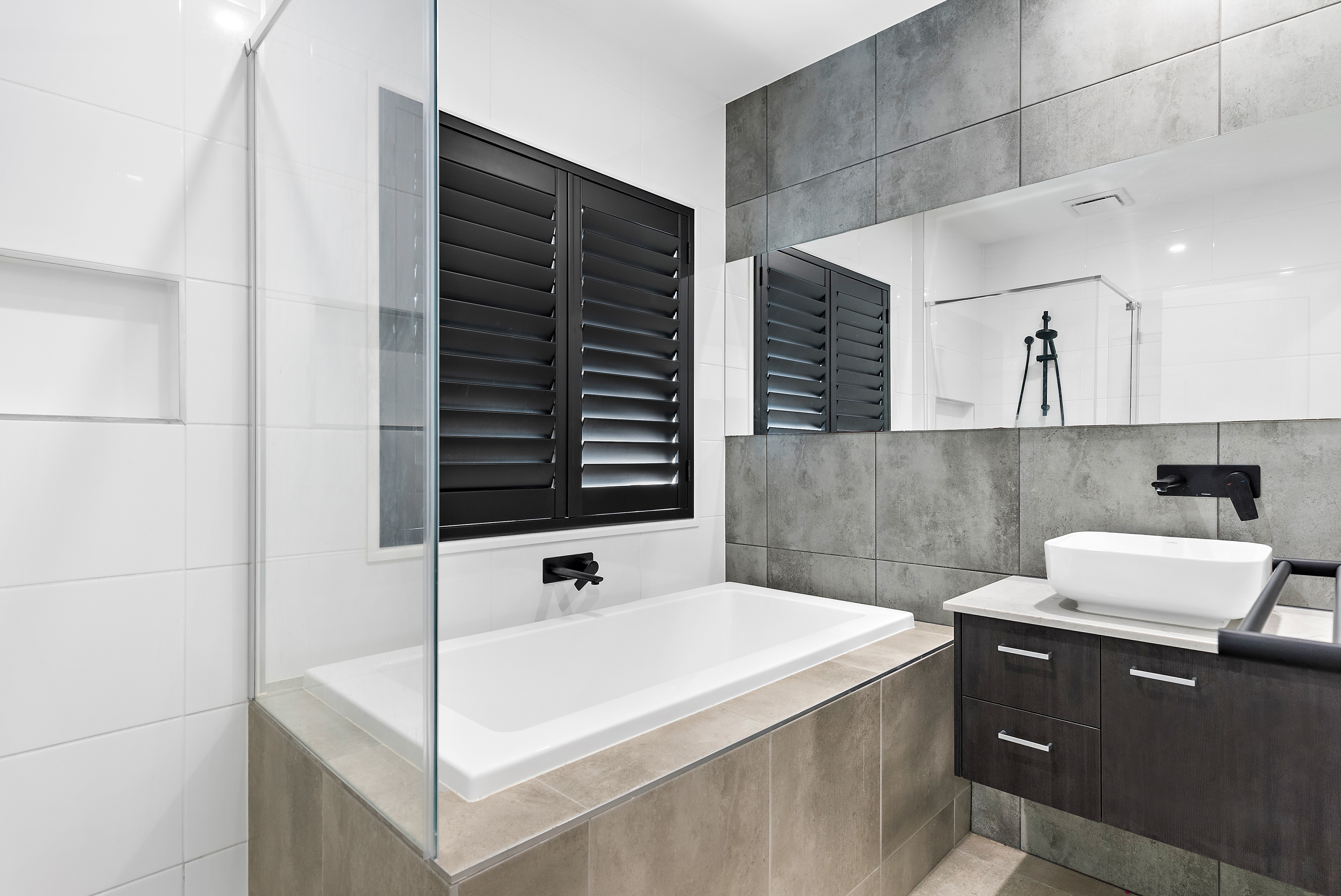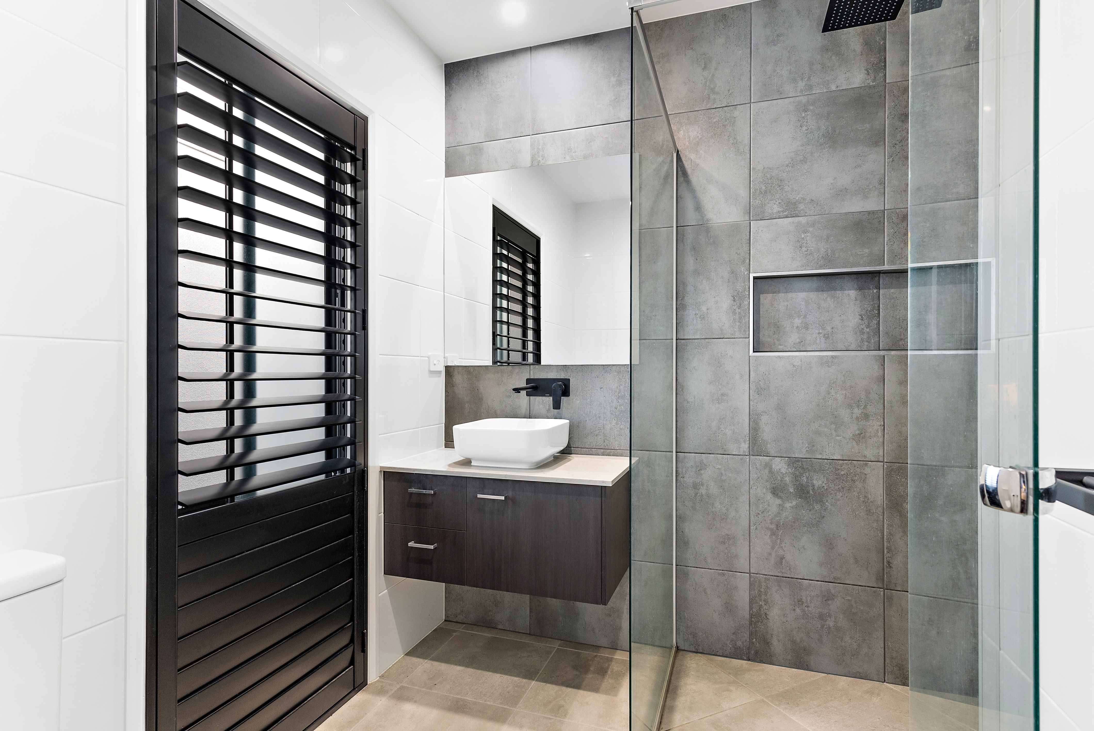 Ensuite with floor-to-ceiling tiles, black tap-ware and black plantation shutters