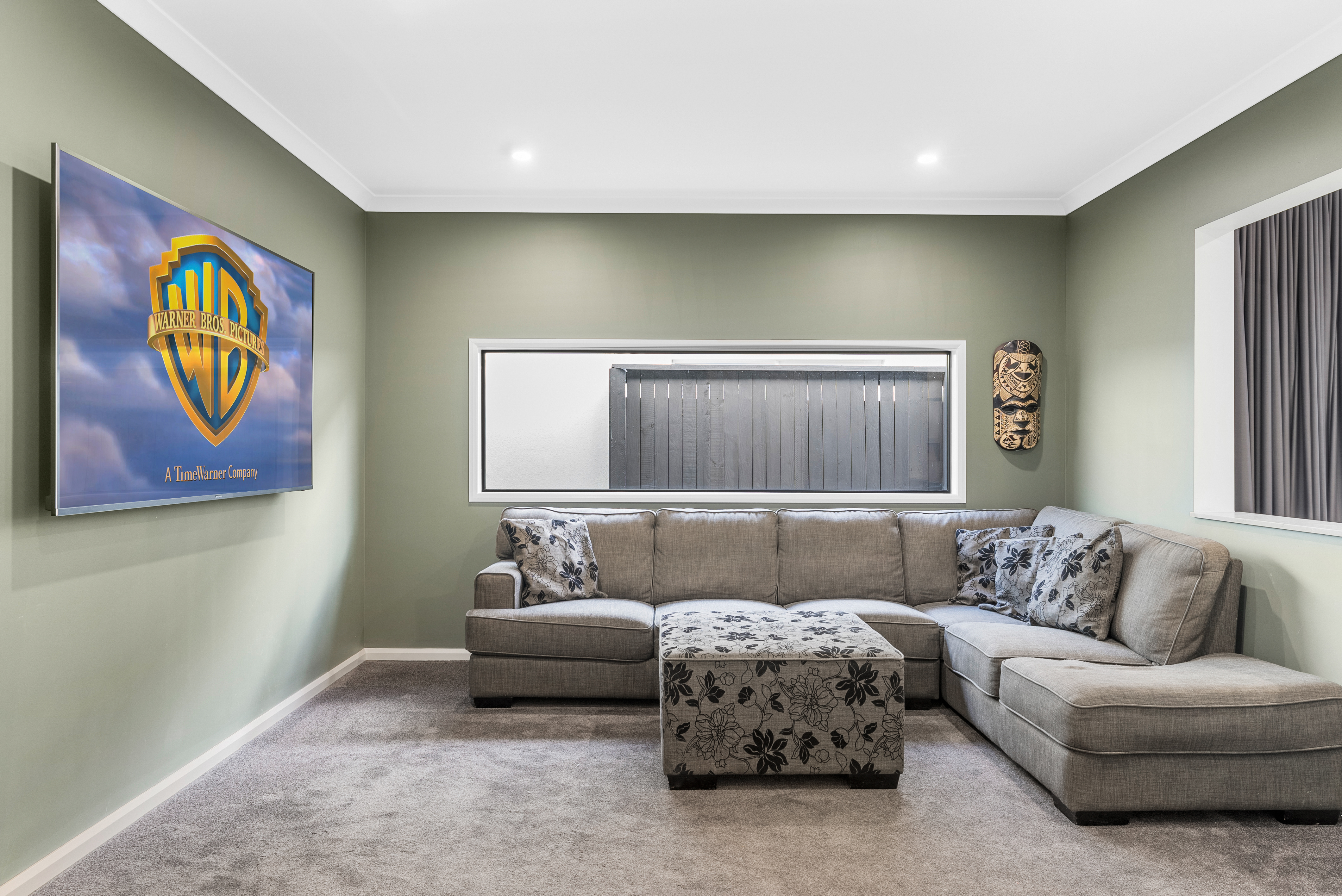 Wide hallways and high ceilings introduce you to a stunning open plan living space. The beautiful kitchen features stone bench-tops, kitchen island with in-built sink and modern appliances; all framed by stunning pendant lighting. The fantastic walk-in pantry boasts impressive storage options with plenty of room for appliances. Stylish and functional, the entertaining space is extended via three-panel glass stacker doors, fitted to both the dining and lounge. The dining space opens onto the side of the property which has been tastefully finished with black concrete to create an effortless flow into the home. Wrapping around the property to the covered alfresco and spa, this is the perfect place to entertain! Doors are beautifully dressed with floor-to-ceiling blackout curtains while black plantation shutters are fitted to the windows. Welcome the natural light or close the space and create an intimate theatre ambiance. The second living boasts elegant deep green feature walls and a window opening with stone sill that connects to the main living.