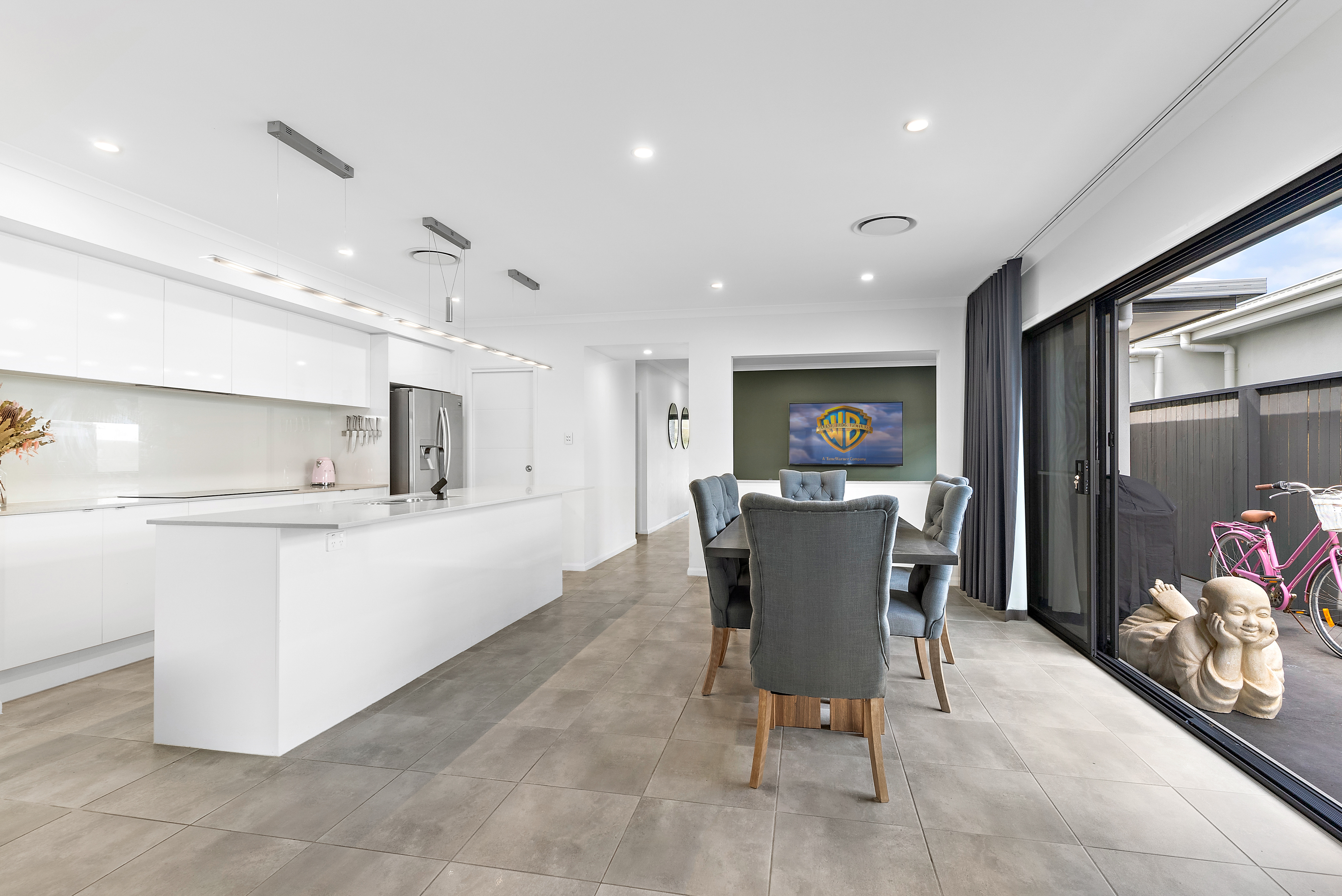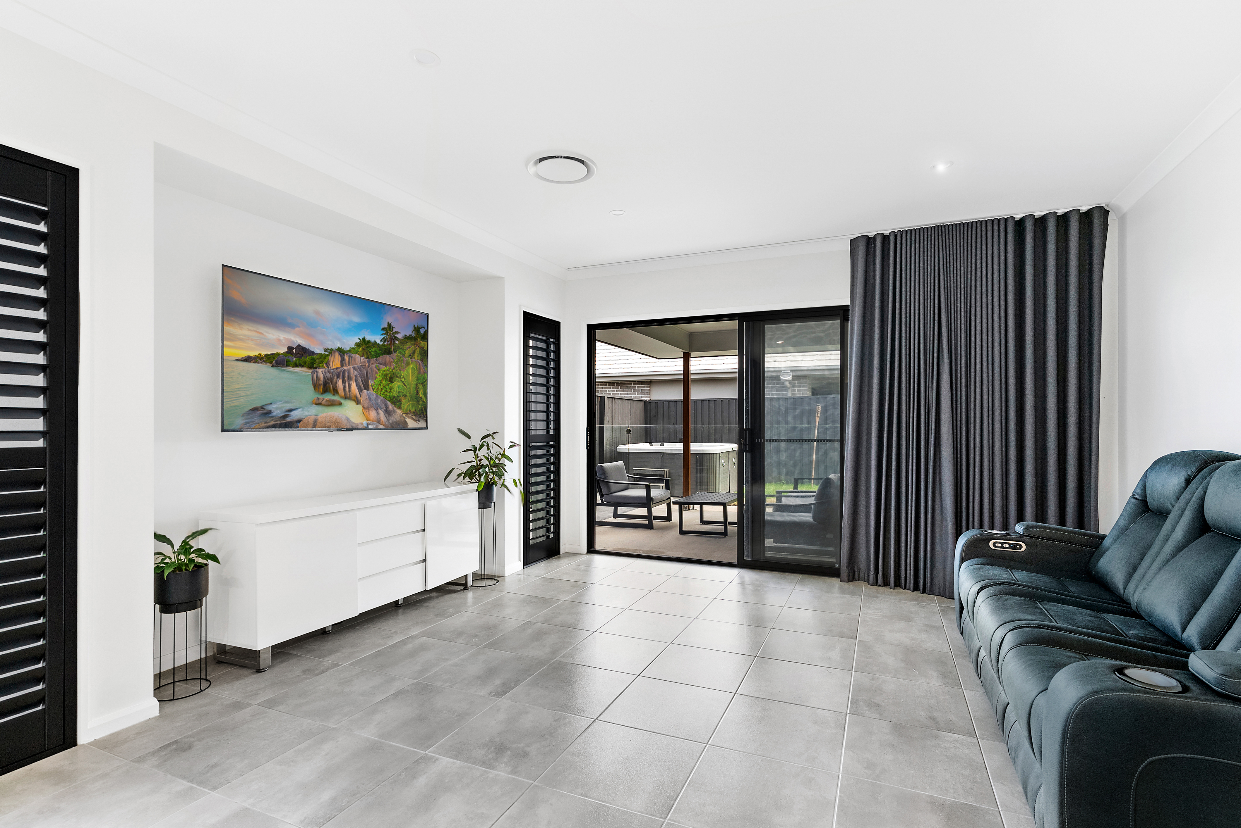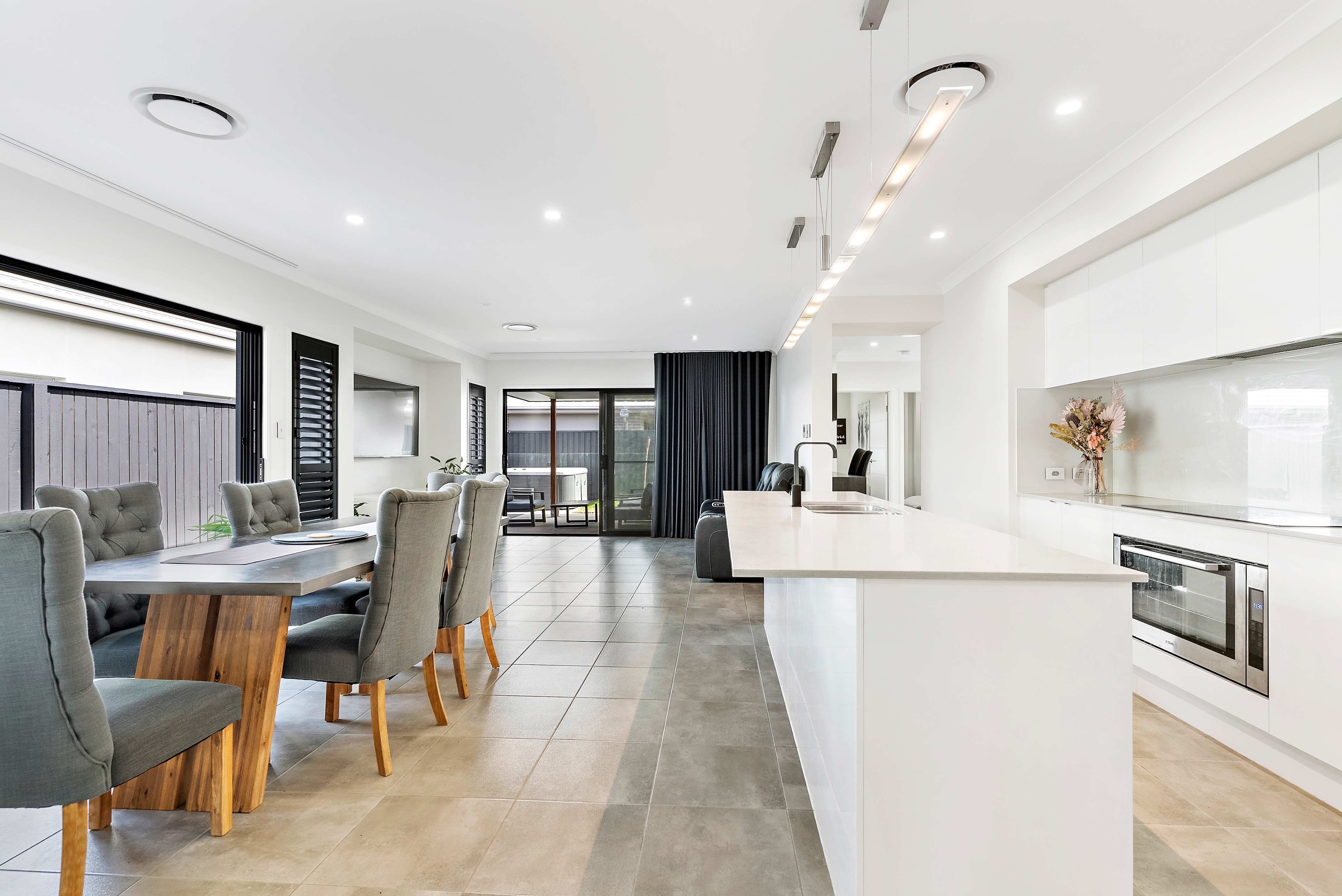 Three-panel stacker doors fitted to both the dining and lounge, dressed with floor-to-ceiling blackout curtains