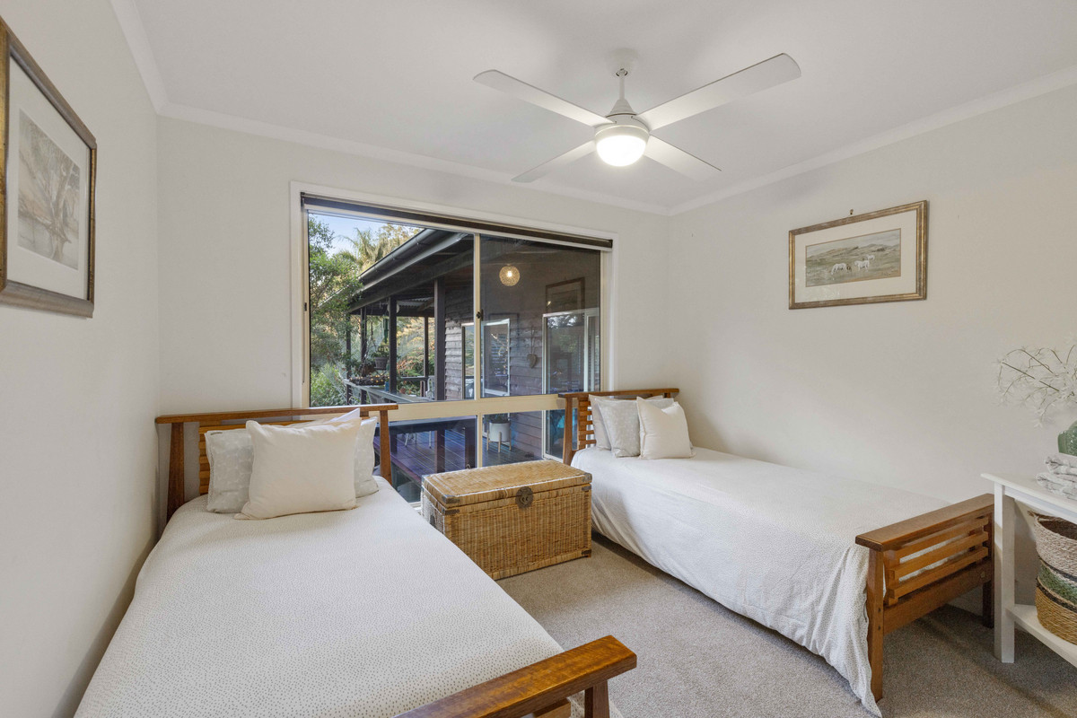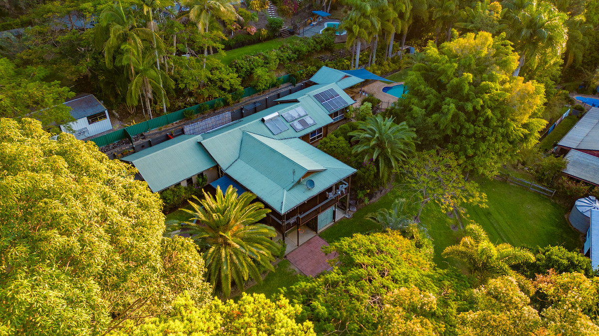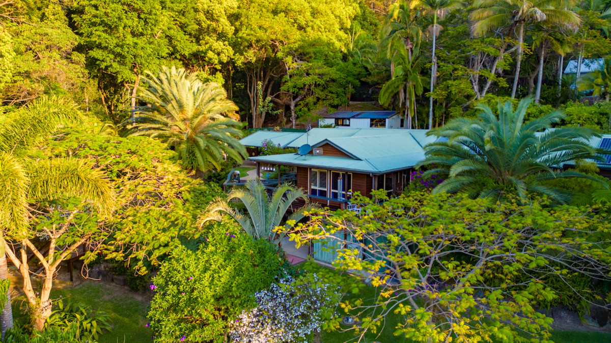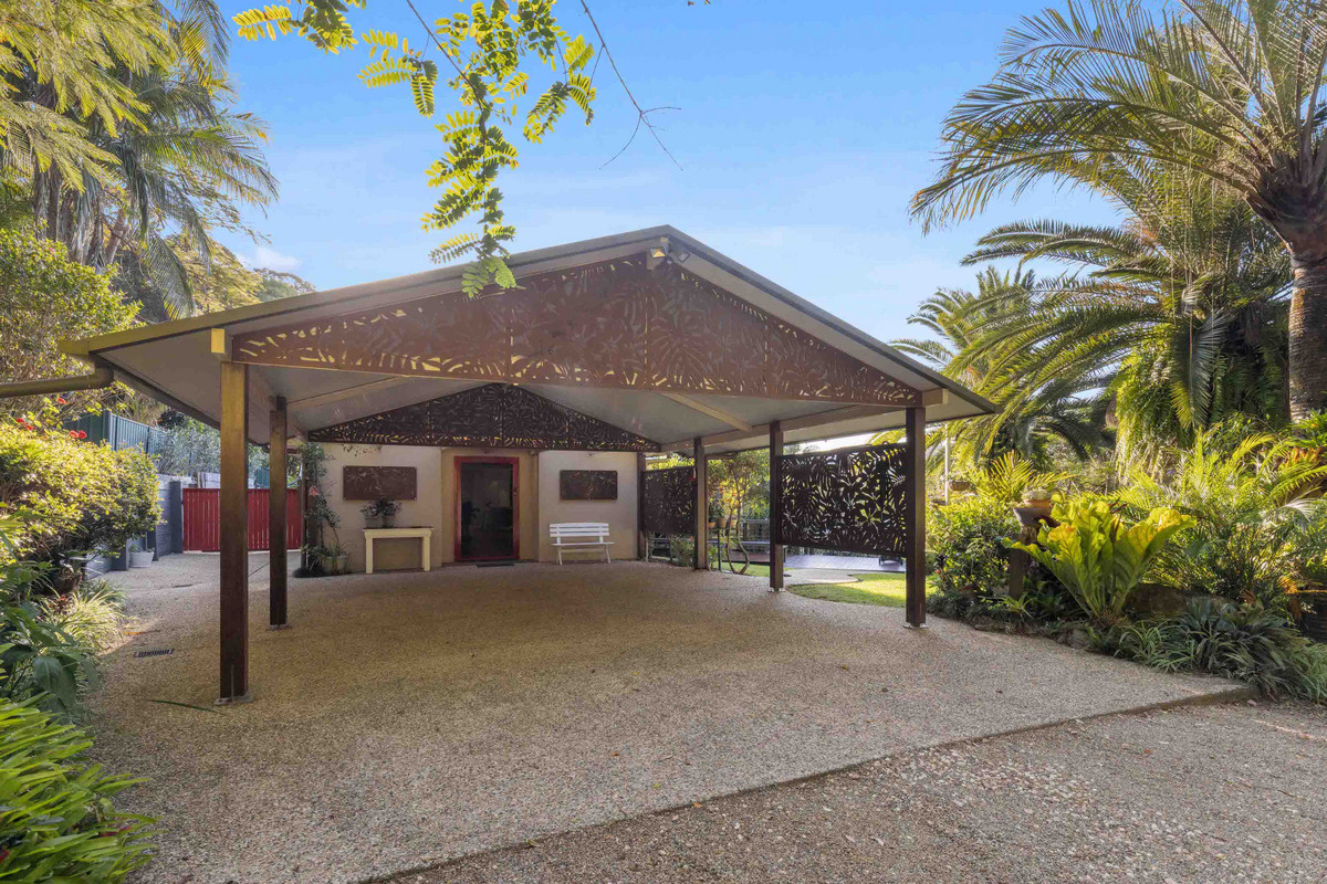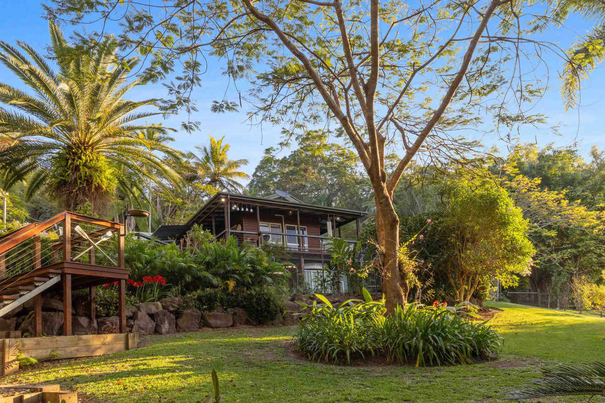 Tucked away on a private, leafy 5763m2 block with a prized northerly aspect and framed by lush sub-tropical gardens, is this charming highset Western Red Cedar home offering a veritable sanctuary amongst rainforest in a dress circle neighbourhood, less than 10 minutes to the river and 15 minutes to the beach.