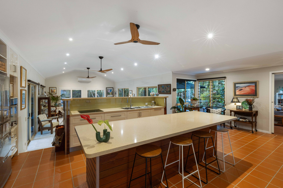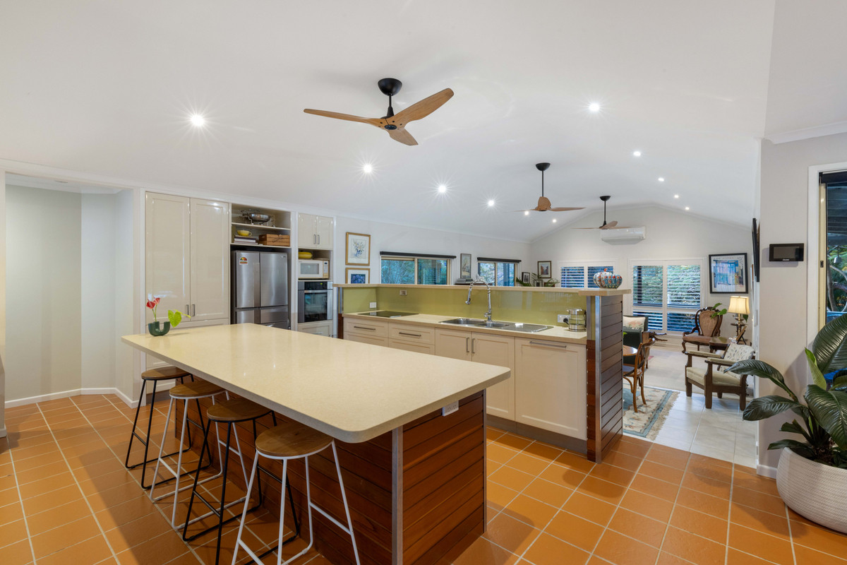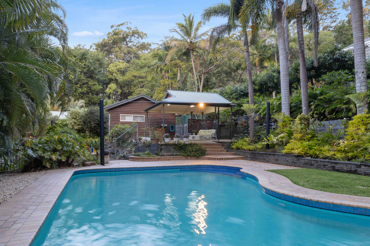 Outdoors is where memories are made — a sparkling pool and pavilion create the ultimate setting for weekend barbecues, celebrations, and relaxed afternoons. Expansive decks overlook tropical, easy-care terraced gardens, offering space for children to explore and play.