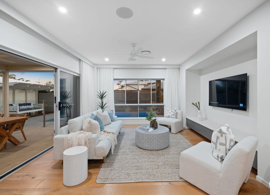 Multiple living zones flow seamlessly to an all-weather alfresco and heated pool, with outdoor entertaining spaces, built-in BBQ, drinks fridge, firepit, and shower room. Additional features include a dedicated media room, oak timber floors, plantation shutters, solar power with battery, ducted air conditioning, ceiling fans, triple garage, and lush, fully fenced tropical gardens.