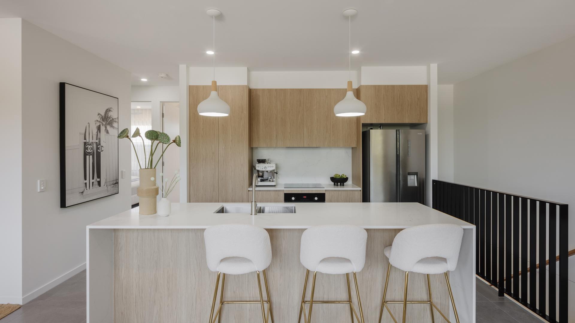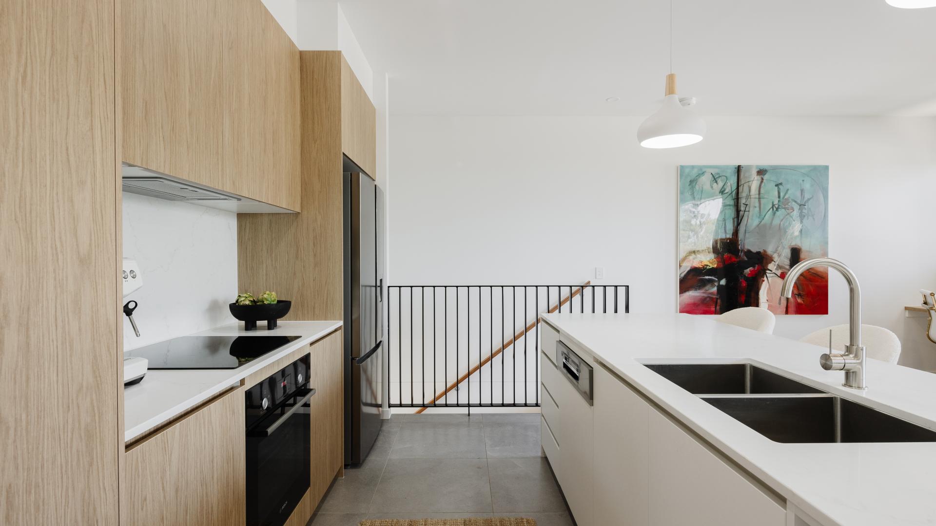 -A well-appointed kitchen with reconstituted stone benchtops, ceramic cooktop, built-in dishwasher, and custom cabinetry