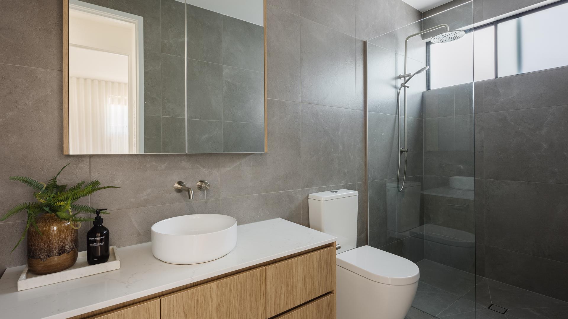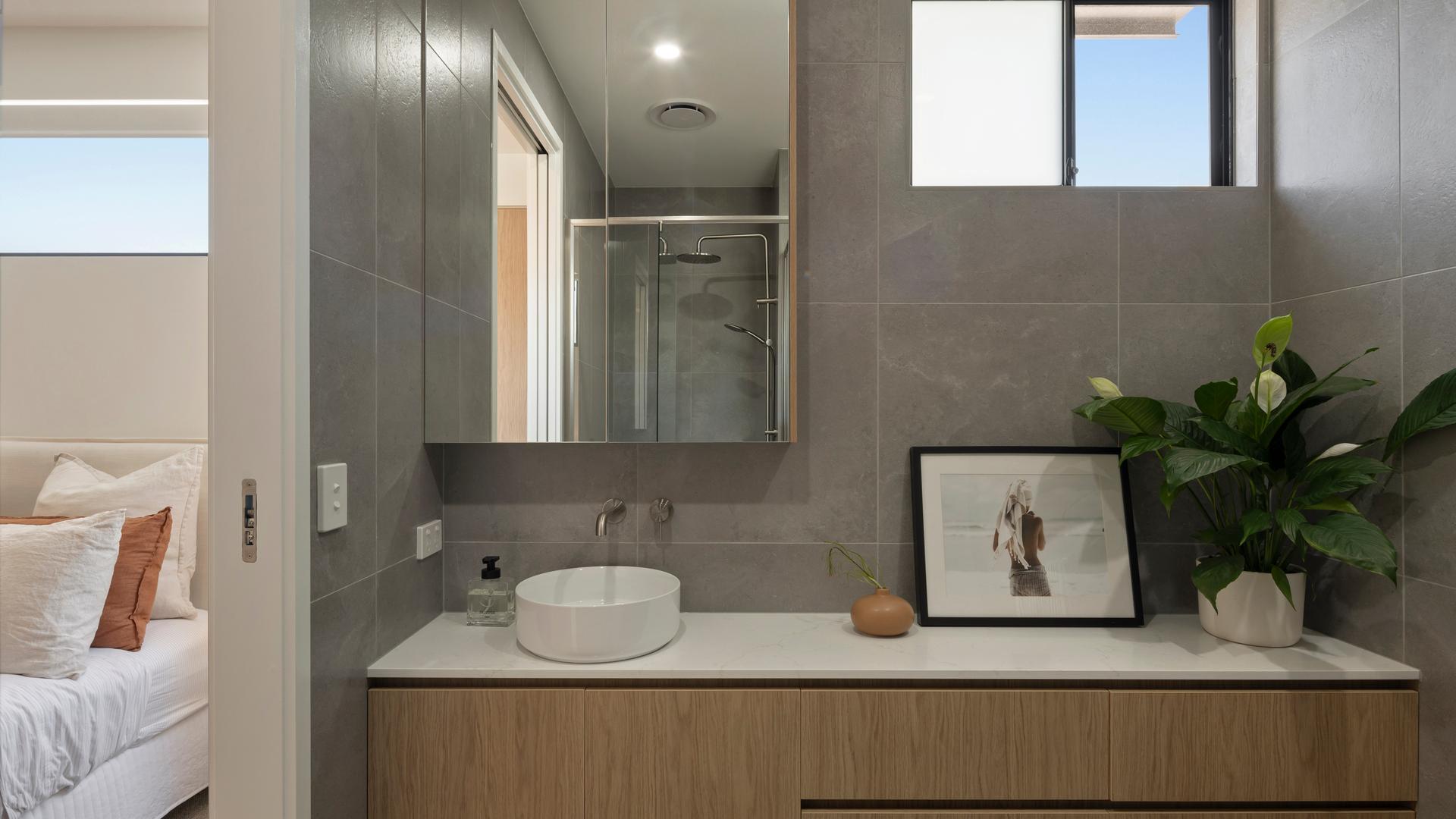 Two additional bedrooms are located on this level, both featuring built-in wardrobes and access to beautifully designed bathrooms. One bedroom boasts an ensuite, while the other is conveniently positioned near the family bathroom, which includes floor-to-ceiling tiles, a luxurious rain shower and a separate hand shower.