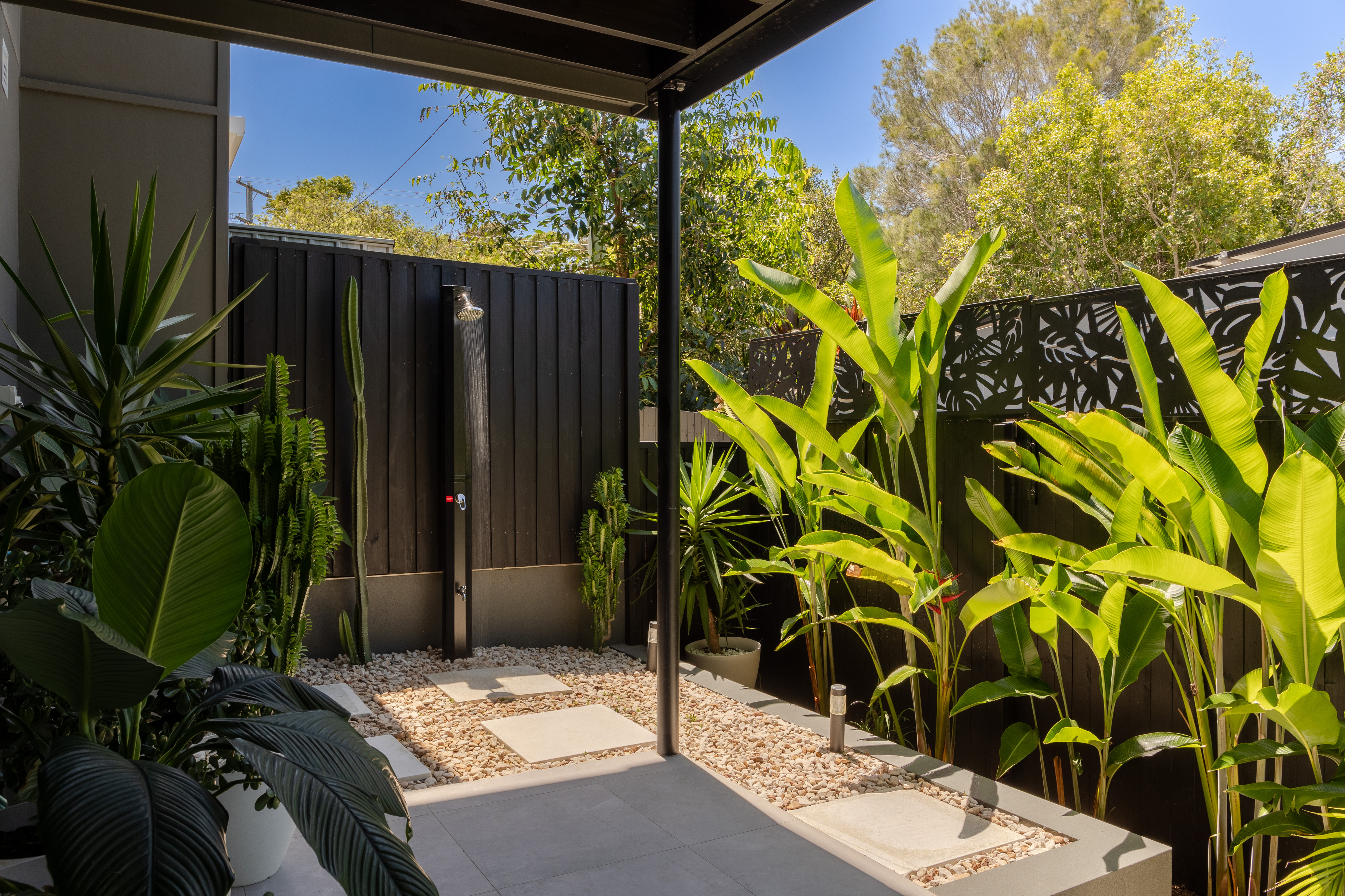 -Sliding glass doors open to a private courtyard, complete with an outdoor solar shower
