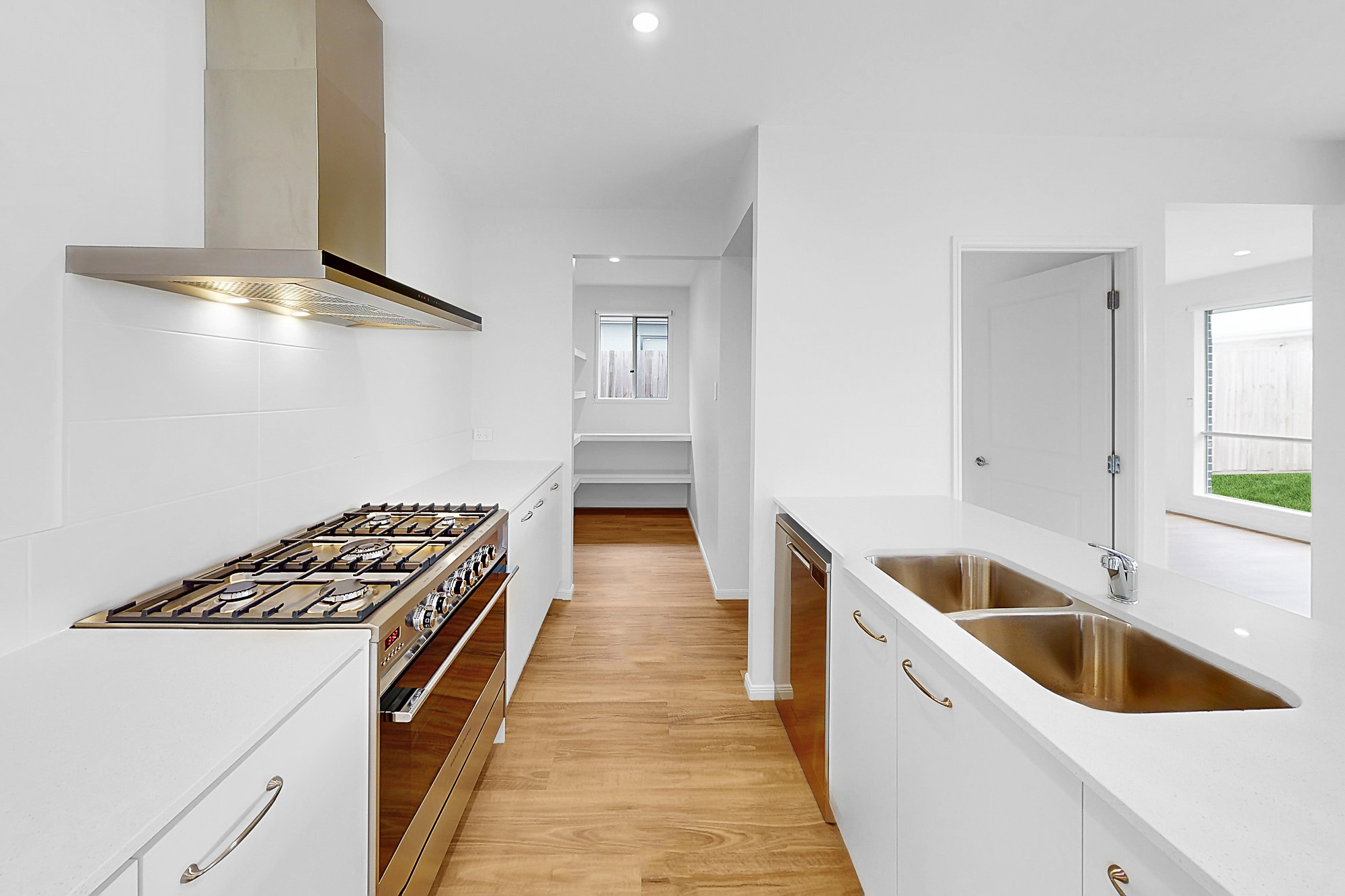The modern kitchen is equipped with a gas cooktop, Fisher & Paykel oven, dishwasher, and a generous walk-in pantry, making it ideal for home chefs.