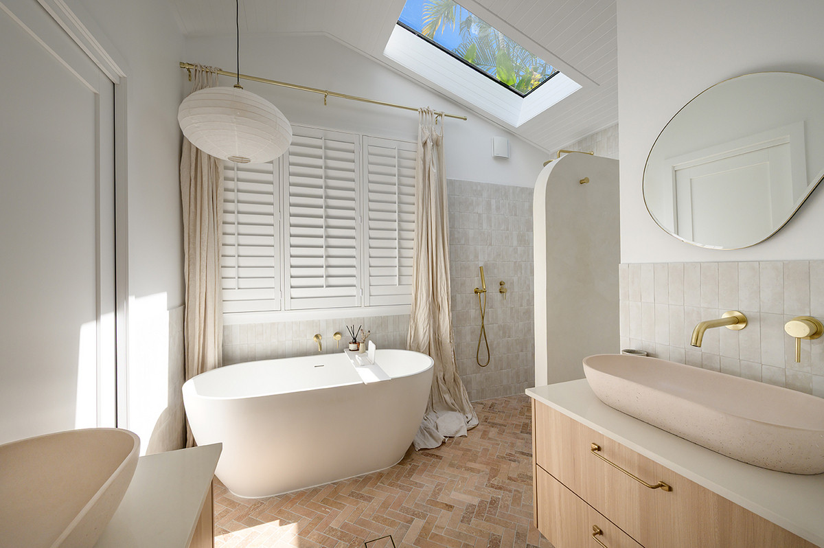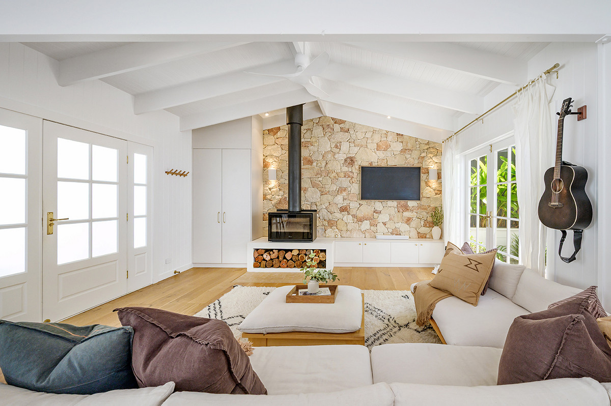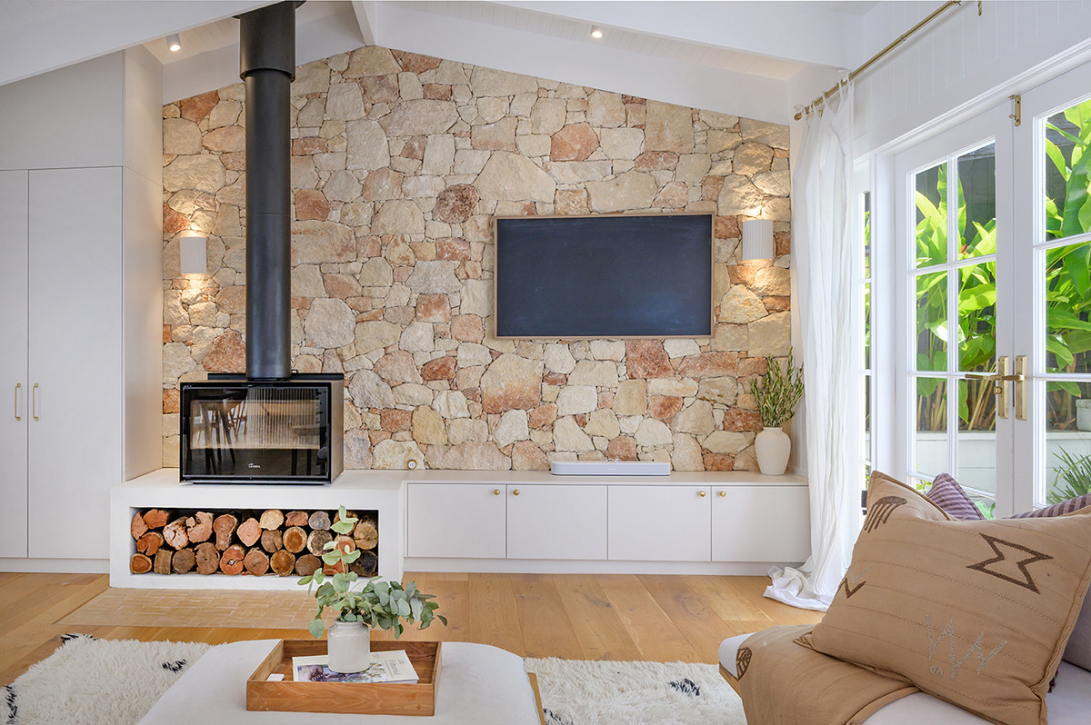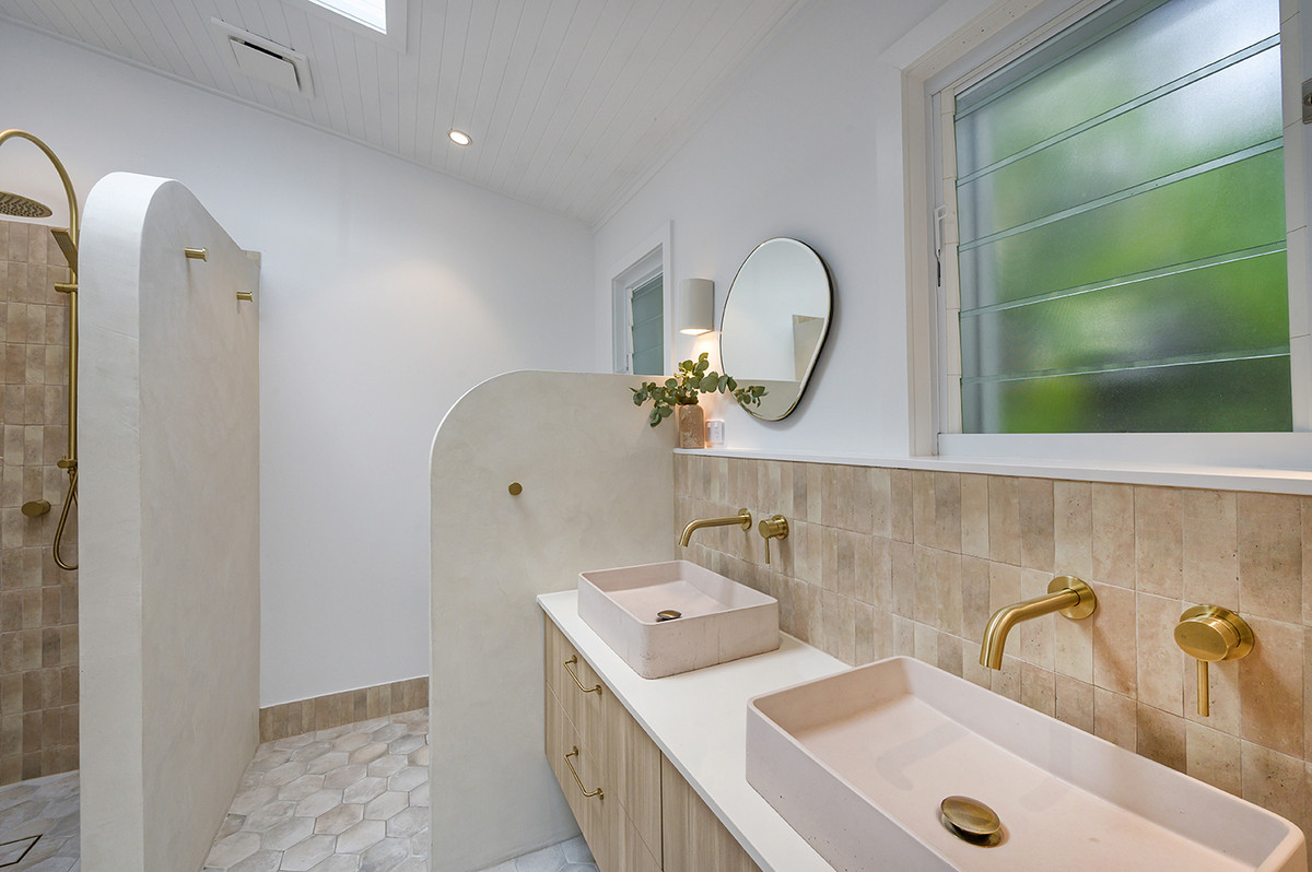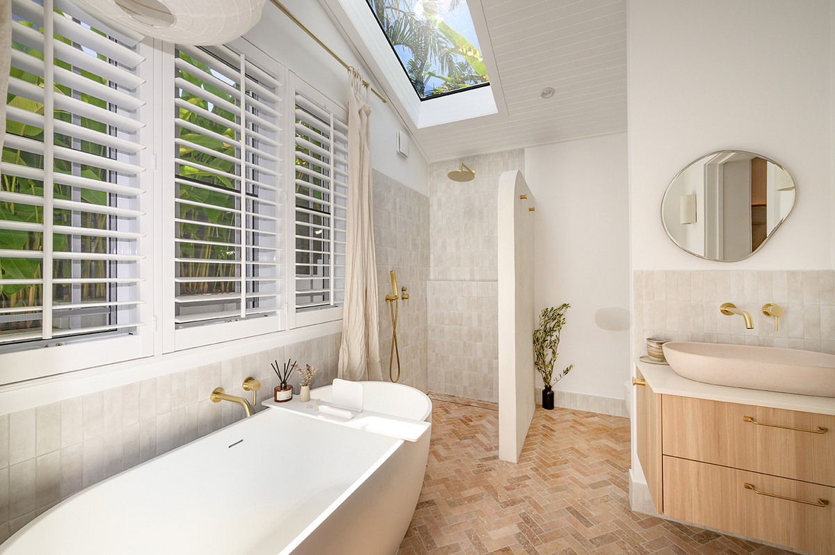 A Greek sandstone feature wall anchors the main living space, while Moroccan clay tiles, handmade ceramic wall lights, and solid brass fixtures lend warmth and artisanal character throughout. Plantation shutters and air conditioning ensure the home is as comfortable as it is beautiful across every season.