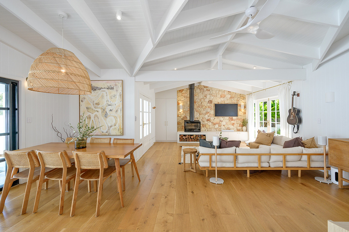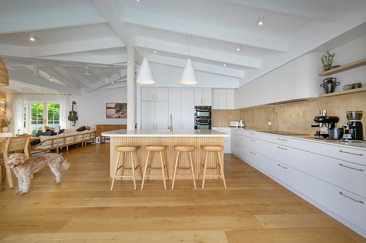 Step inside and the quality is immediately apparent. Oak timber floors run beneath exposed timber ceilings, with four skylights drawing natural light deep into the home. The kitchen displays beautiful cabinetry by Gull Designs, one of Noosa's premier Kitchen designers, solid stone countertops, a limestone splashback, and Smeg double ovens, a Smeg induction cooktop, an integrated fridge, and a Miele dishwasher — an elegant working kitchen that doesn't compromise on beauty.