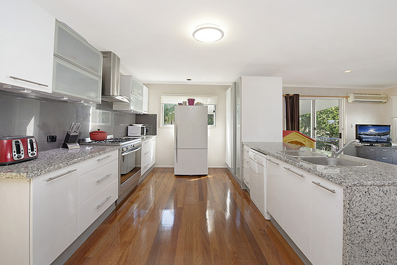 Stylish galley kitchen with gas cook top, good storage;