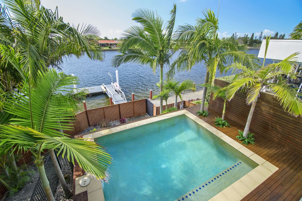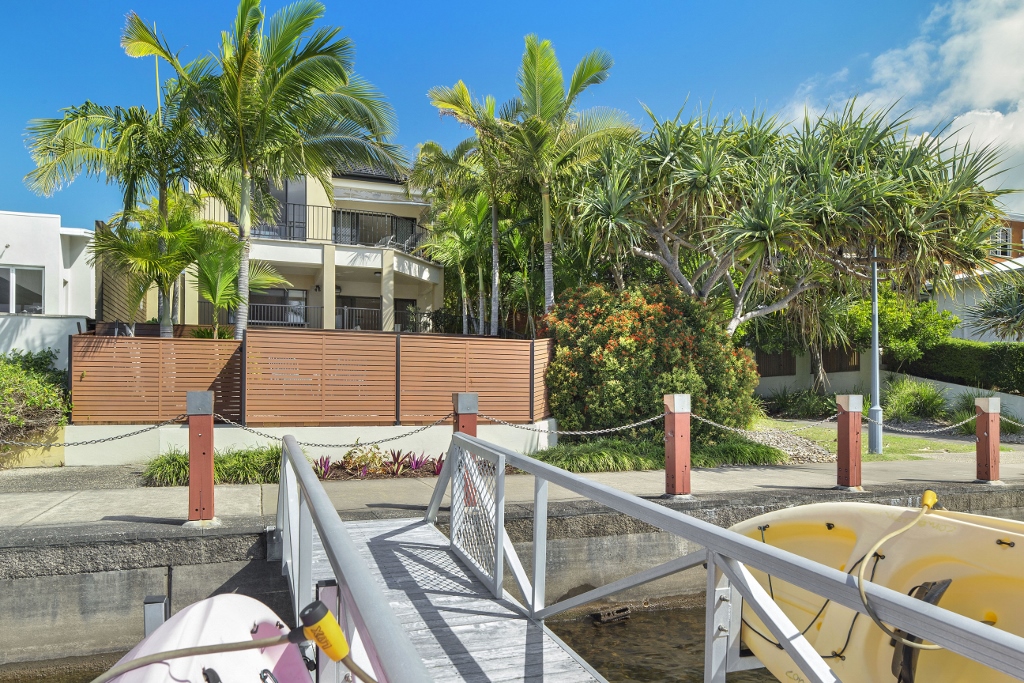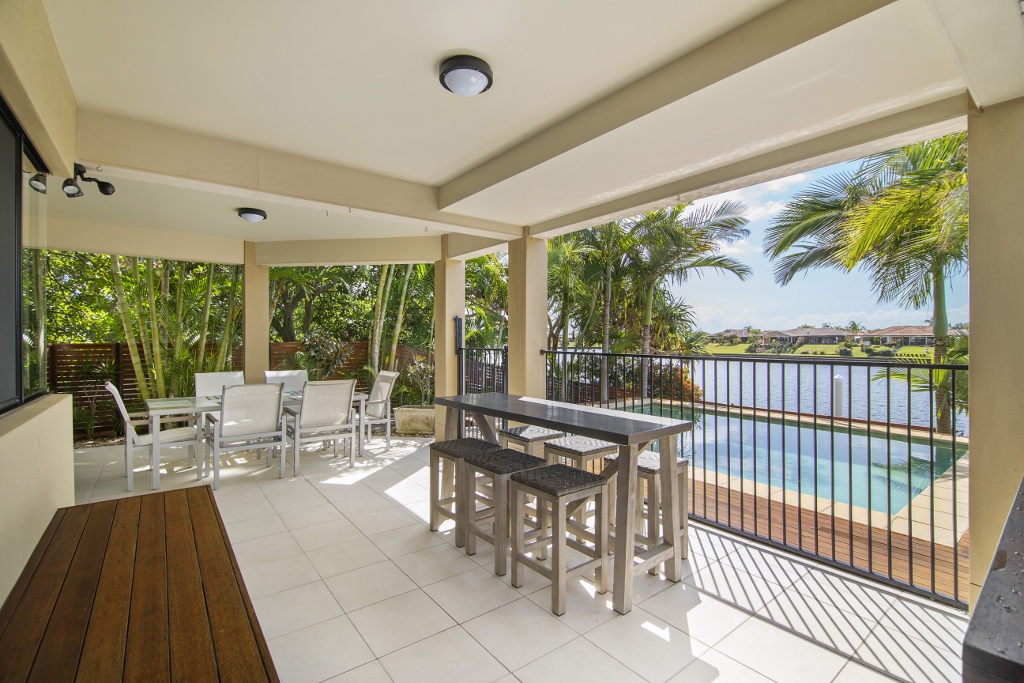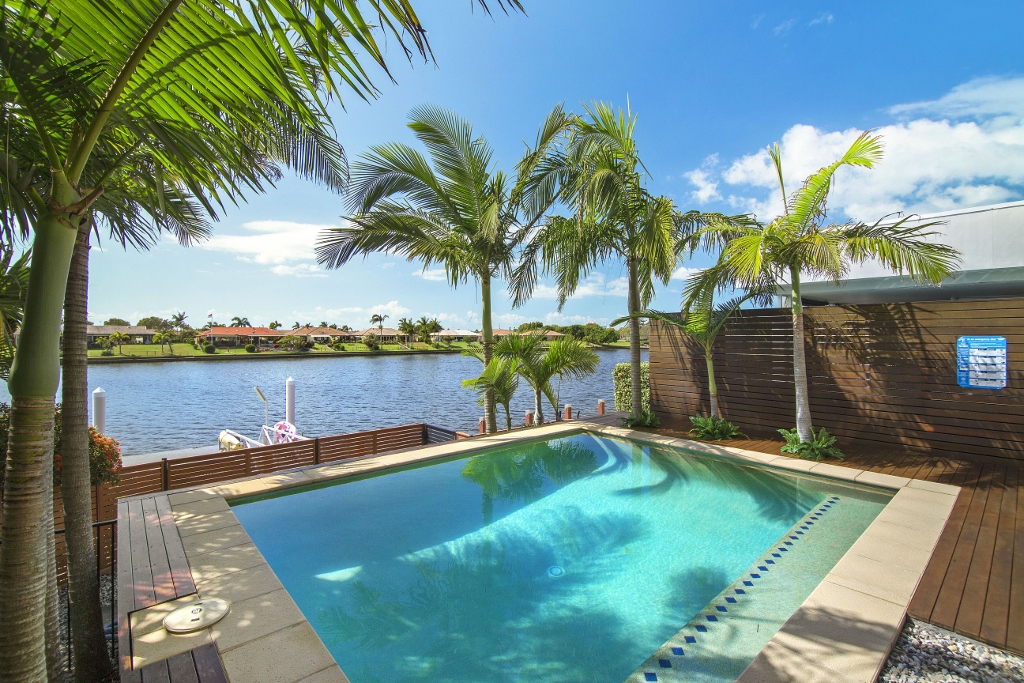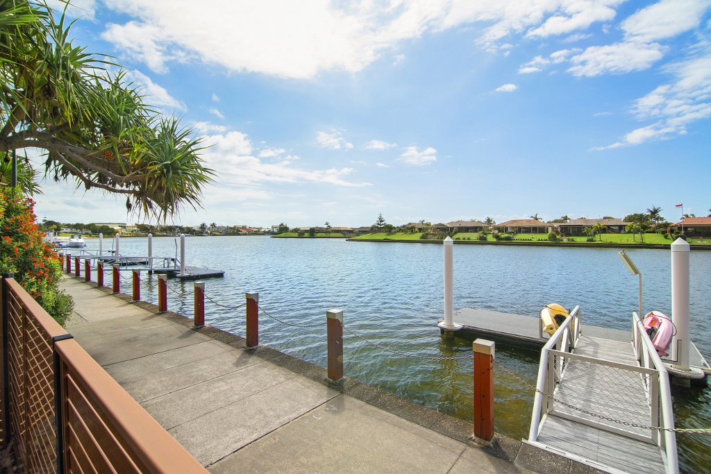 Complete with five bedrooms, three bathrooms, two separate living areas, elegant kitchen, east facing alfresco terrace overlooking in-ground pool and large water-body, upper balcony with sensational views, and double lock-up garage with drive through access to bring in a jet ski/trailer; on a fenced, landscaped low maintenance block with a neighbour on only one side, privacy is enhanced and the setting is pure waterfront bliss.