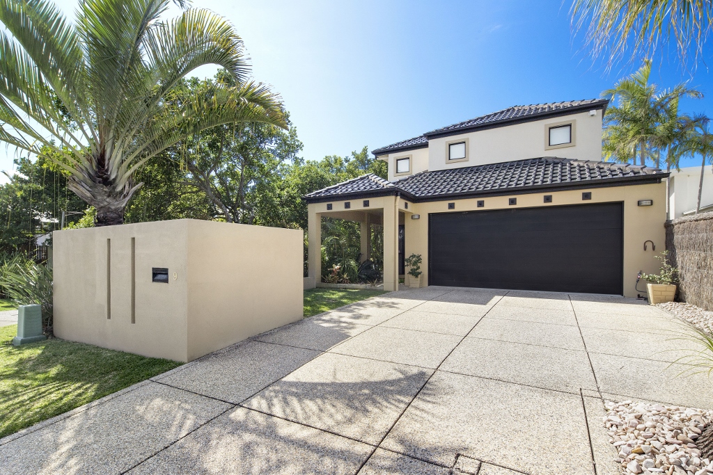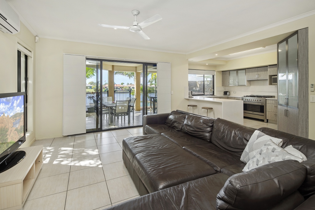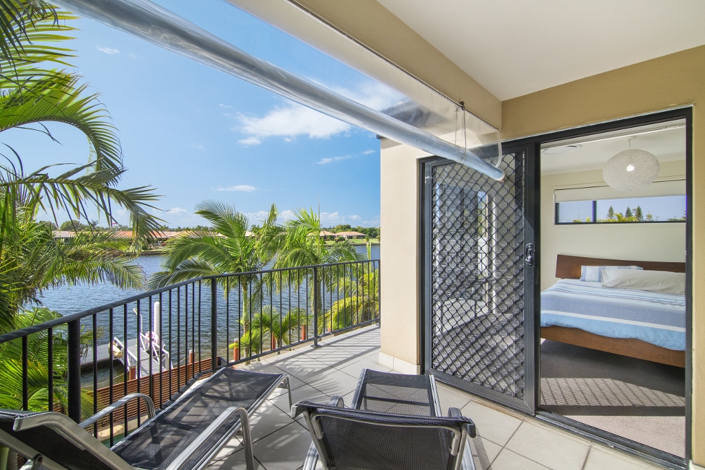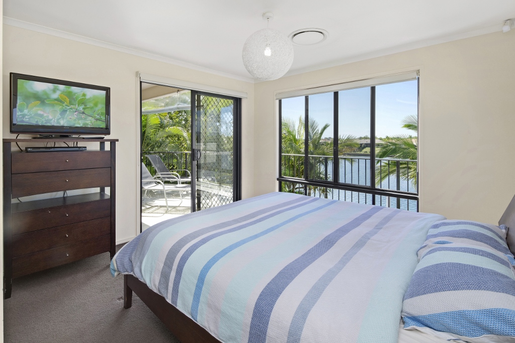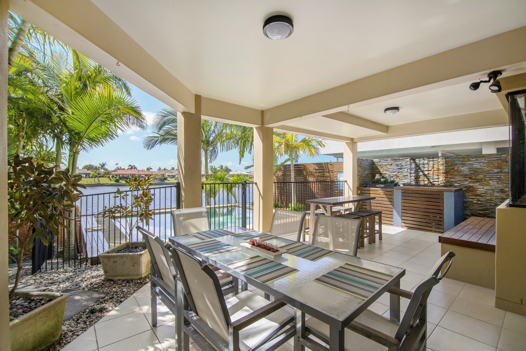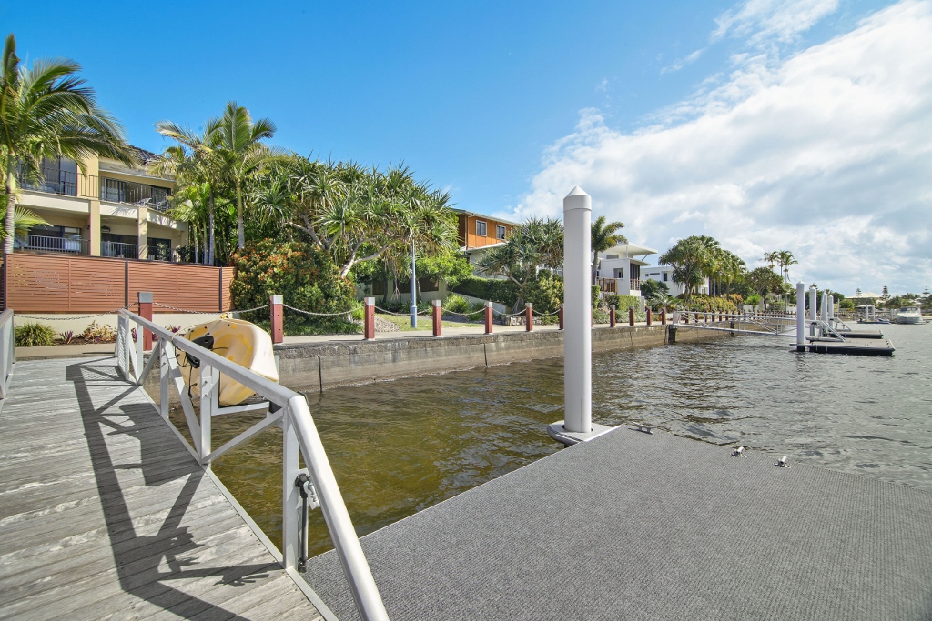 Complete with five bedrooms, three bathrooms, two separate living areas, elegant kitchen, east facing alfresco terrace overlooking in-ground pool and large water-body, upper balcony with sensational views, and double lock-up garage with drive through access to bring in a jet ski/trailer; on a fenced, landscaped low maintenance block with a neighbour on only one side, privacy is enhanced and the setting is pure waterfront bliss.